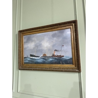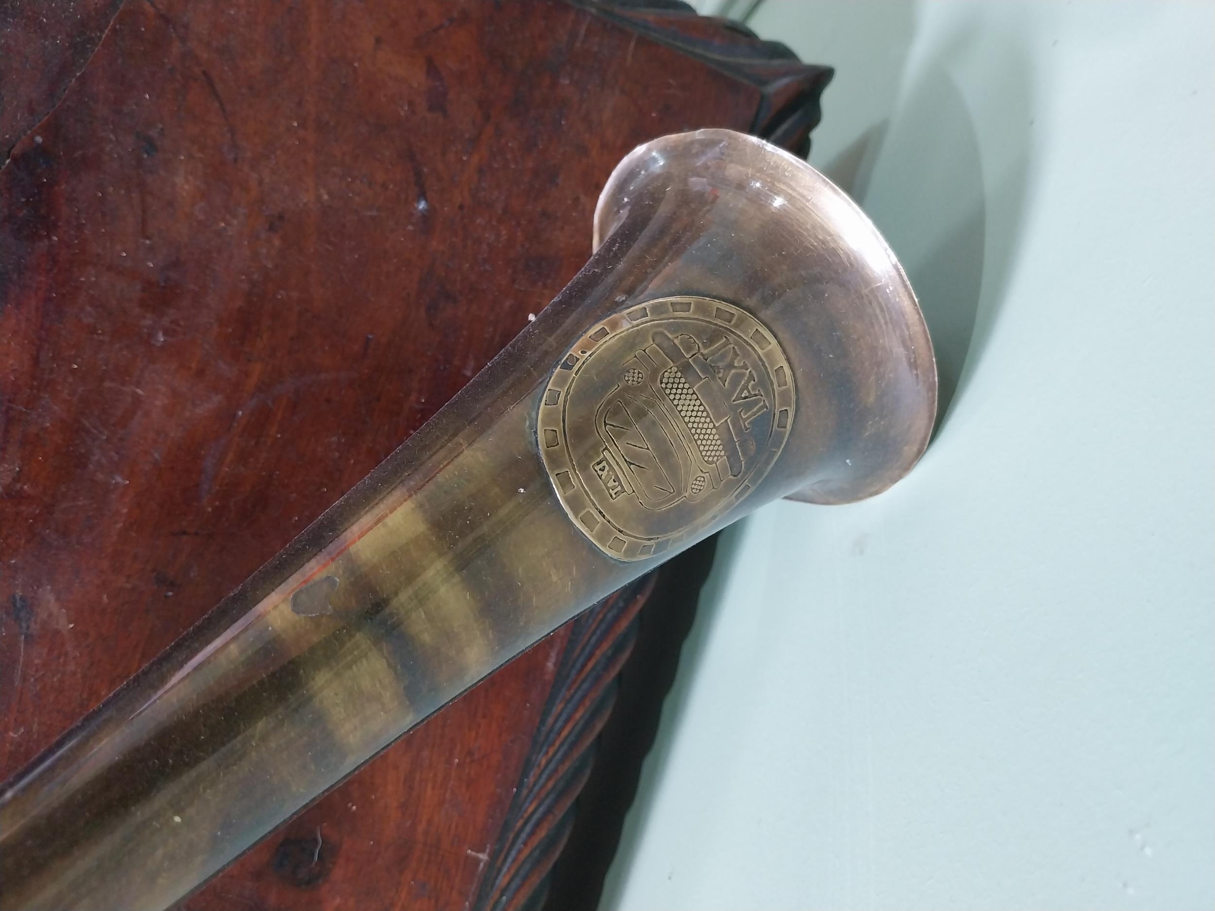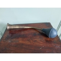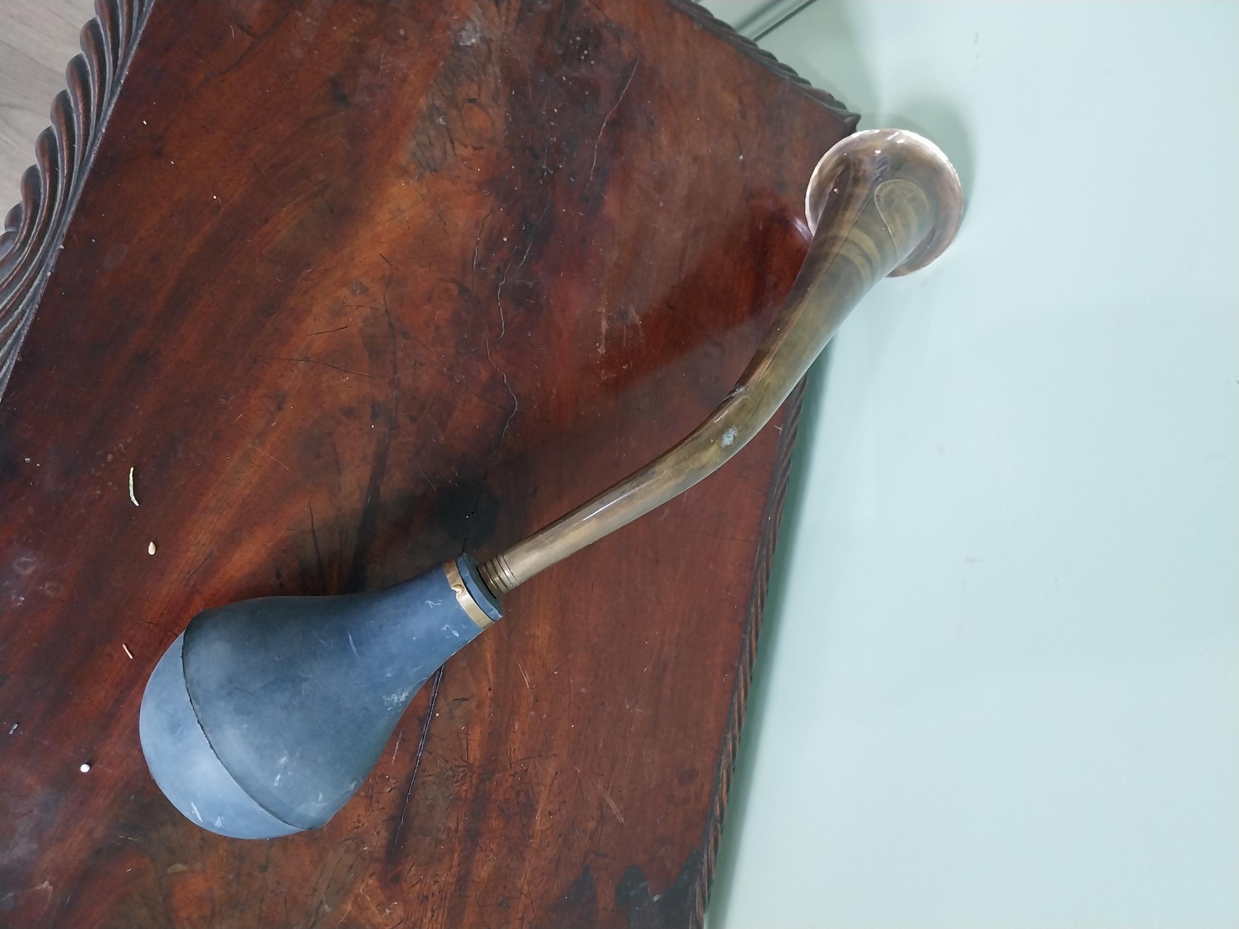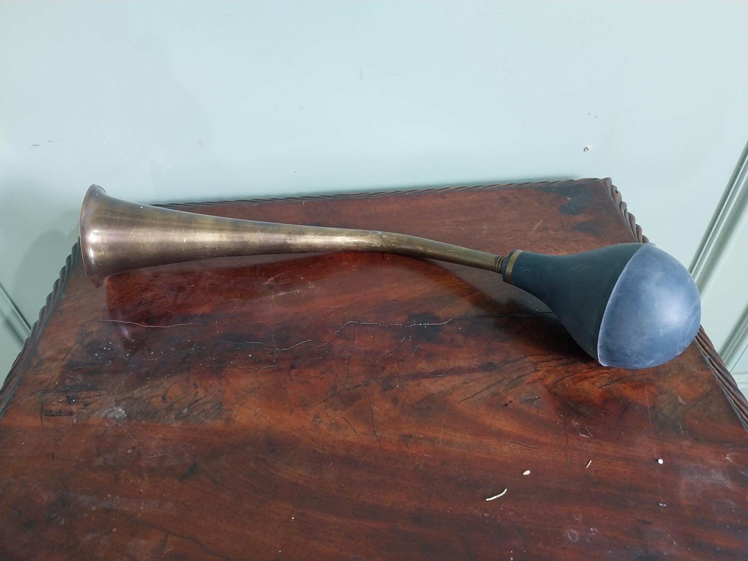 Vintage brass car horn. {20 cm H x 48 cm W x 10 cm D}.