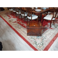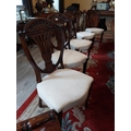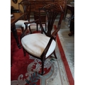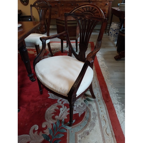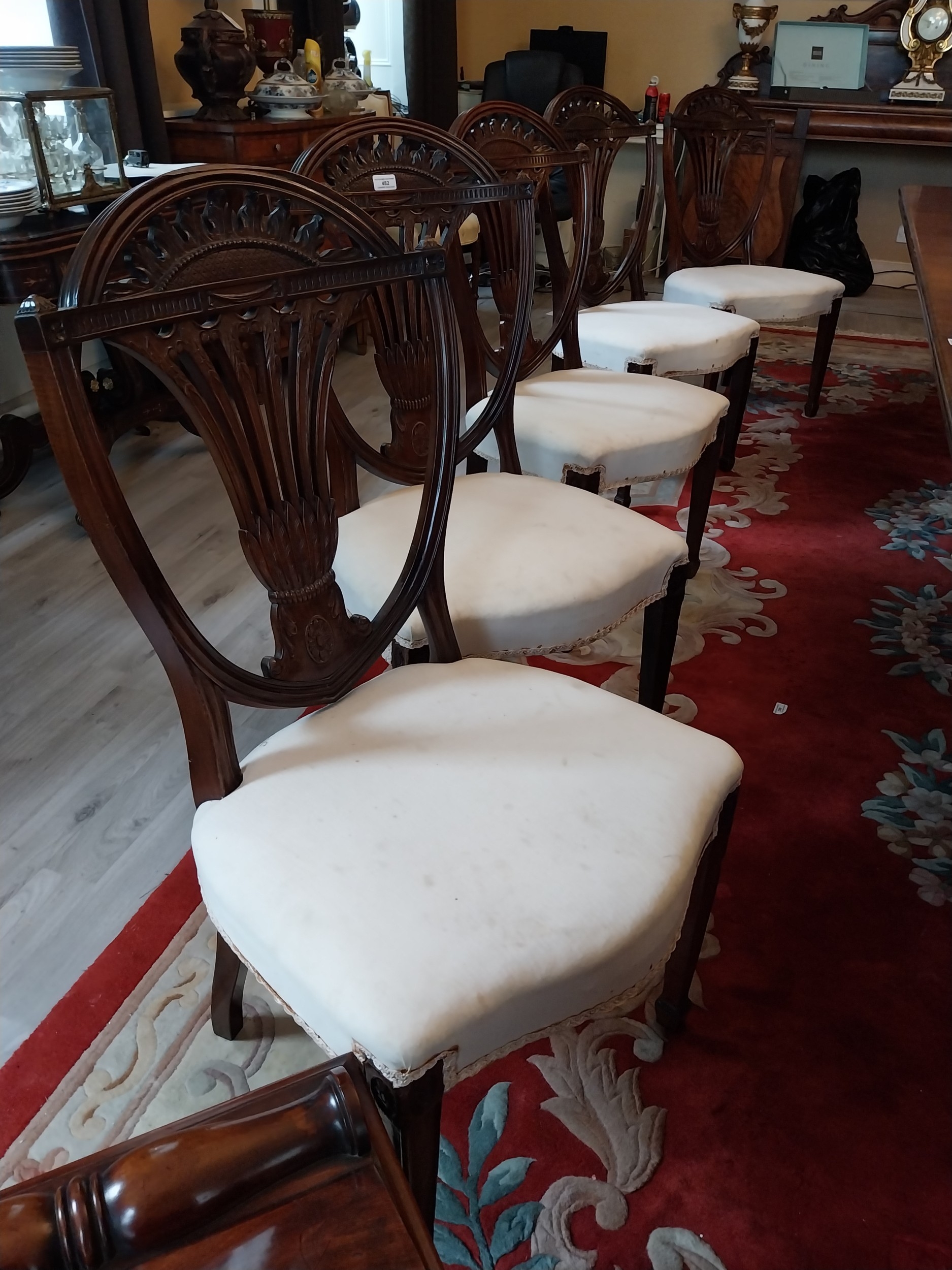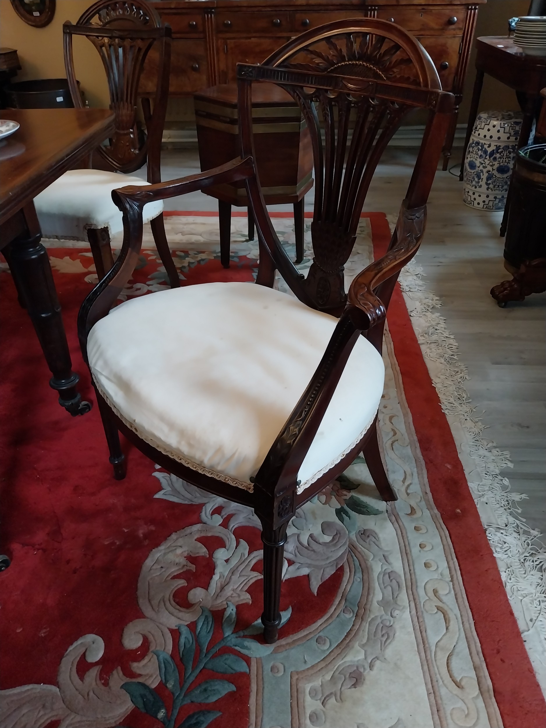 Set of ten + two good quality Edwardian mahogany shield backed dining room chairs with upholstered seats, in the Hepplewhite manner. { 99cm H X 55cm W X 50cm D & 99cm H X 68cm W X 56cm D }.