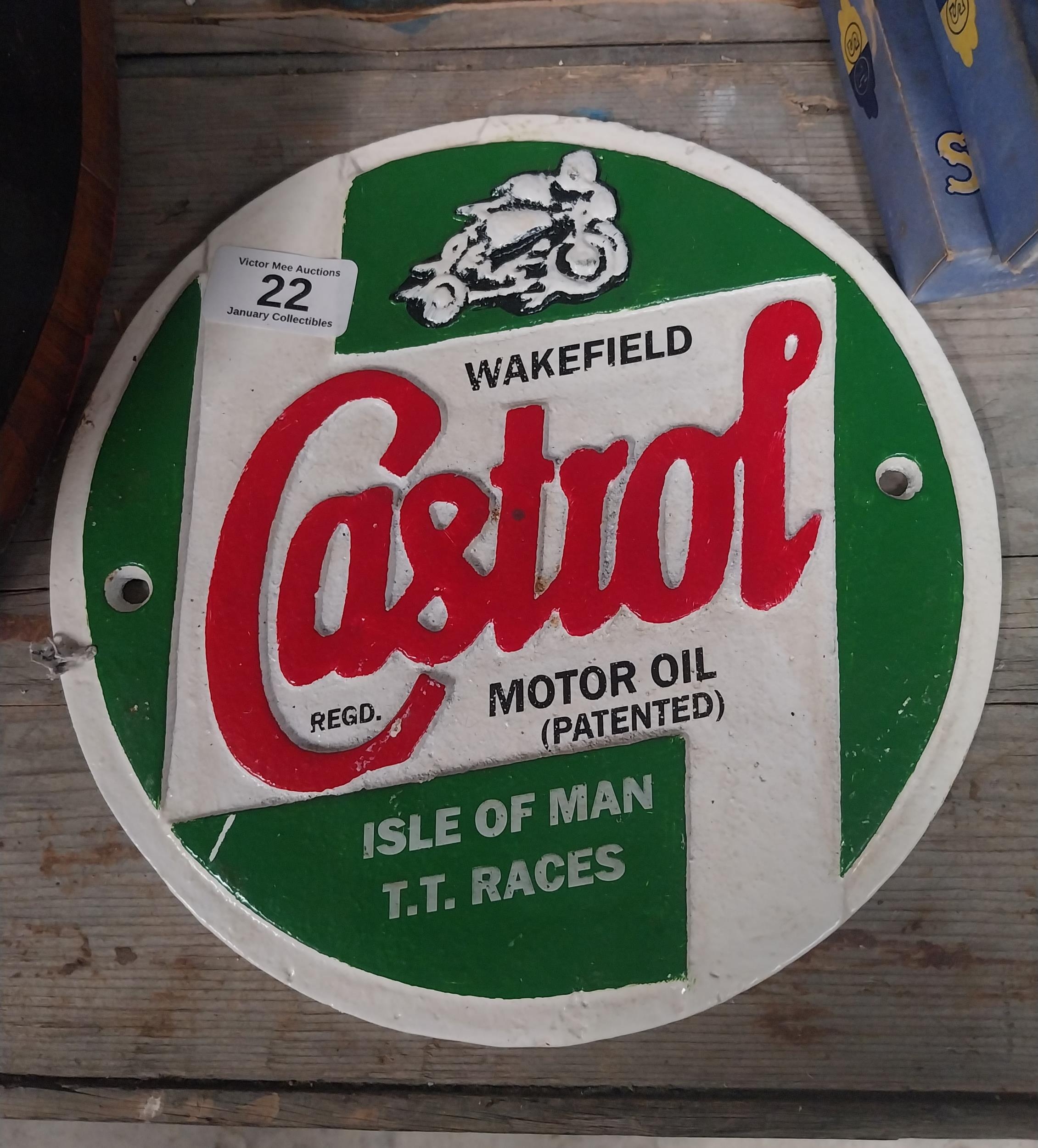 Cast iron Castrol Motor Oil advertising plaque. {23 cm Dia.}.
