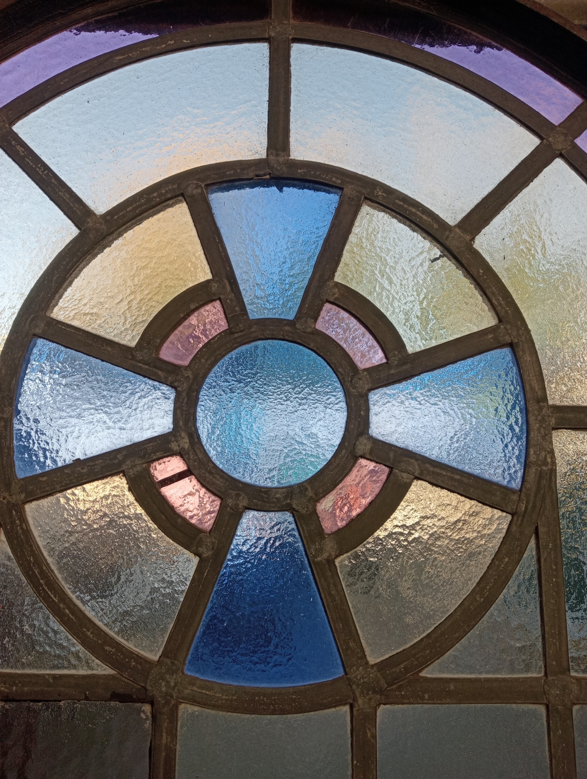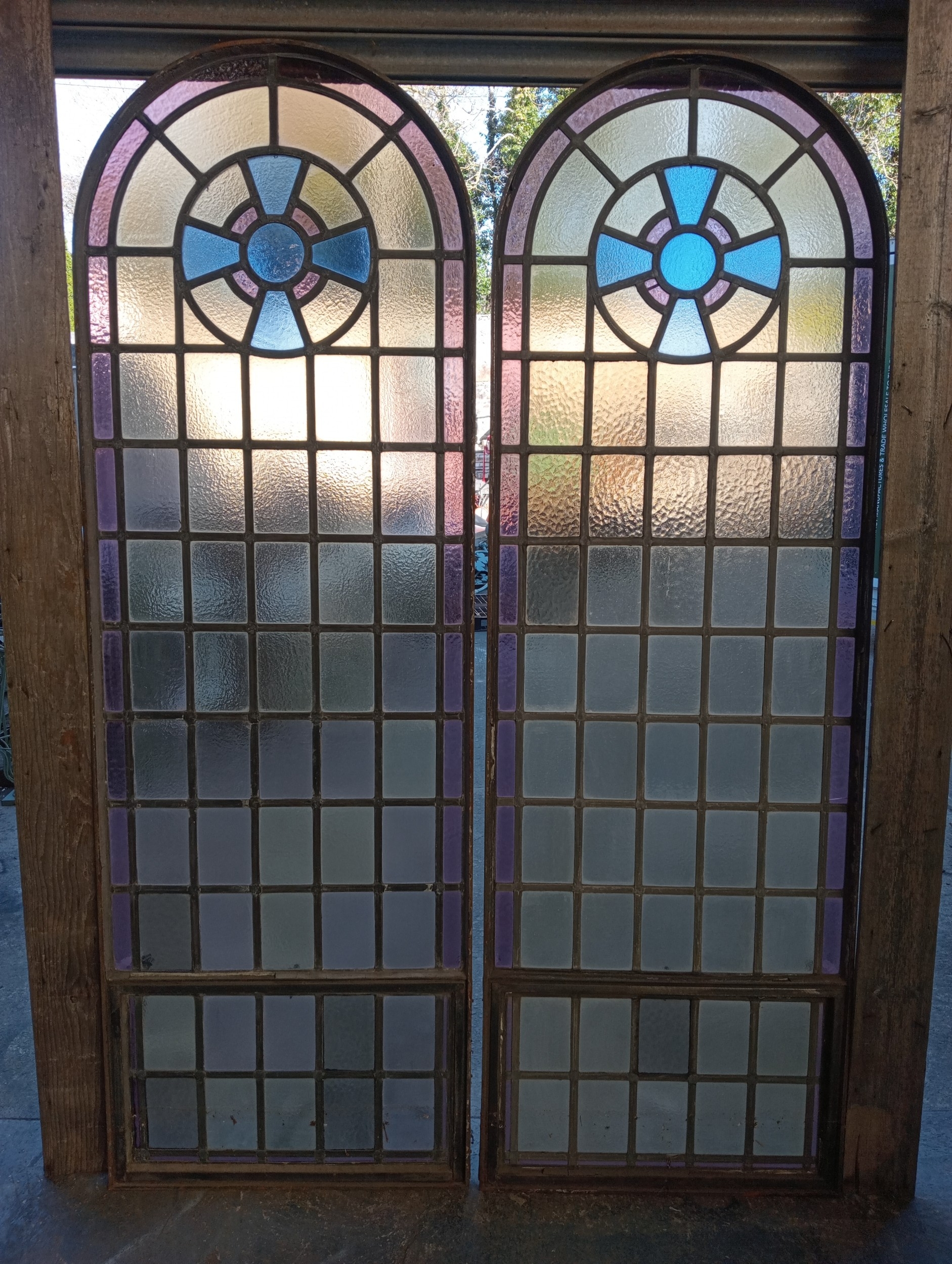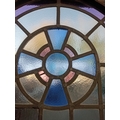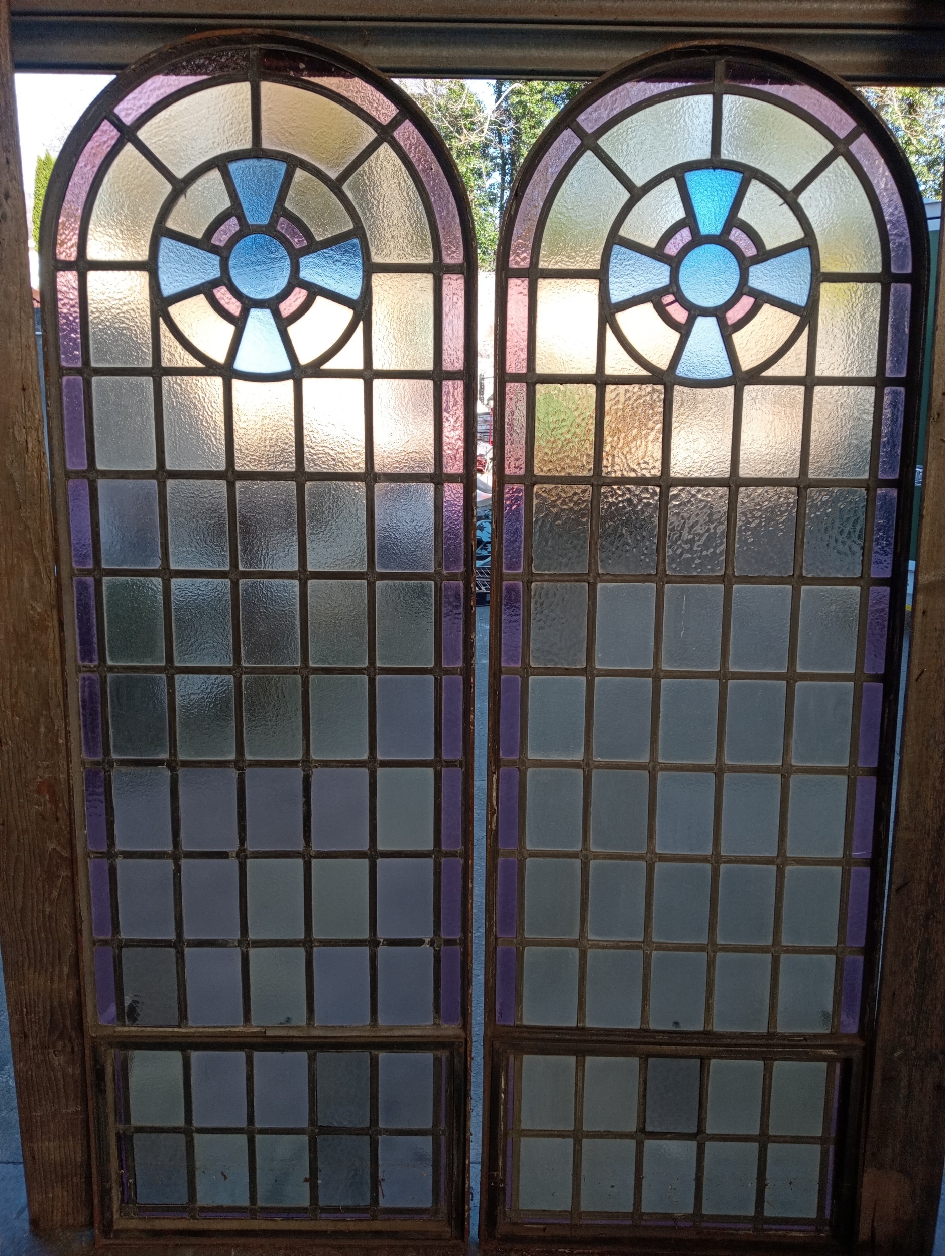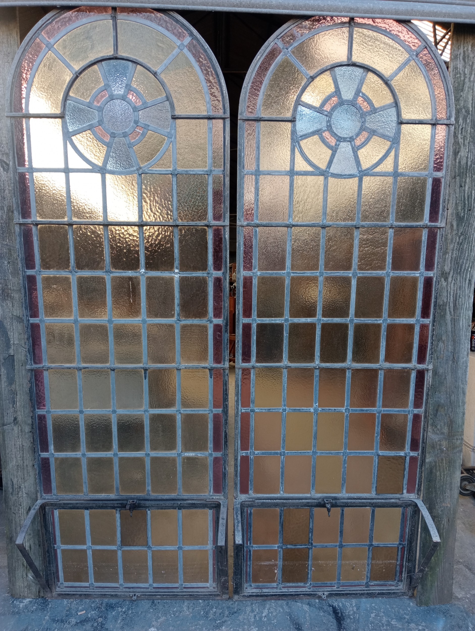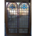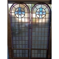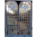 Pair of cast iron stained glass leaded windows (H 228cm x W 76cm )