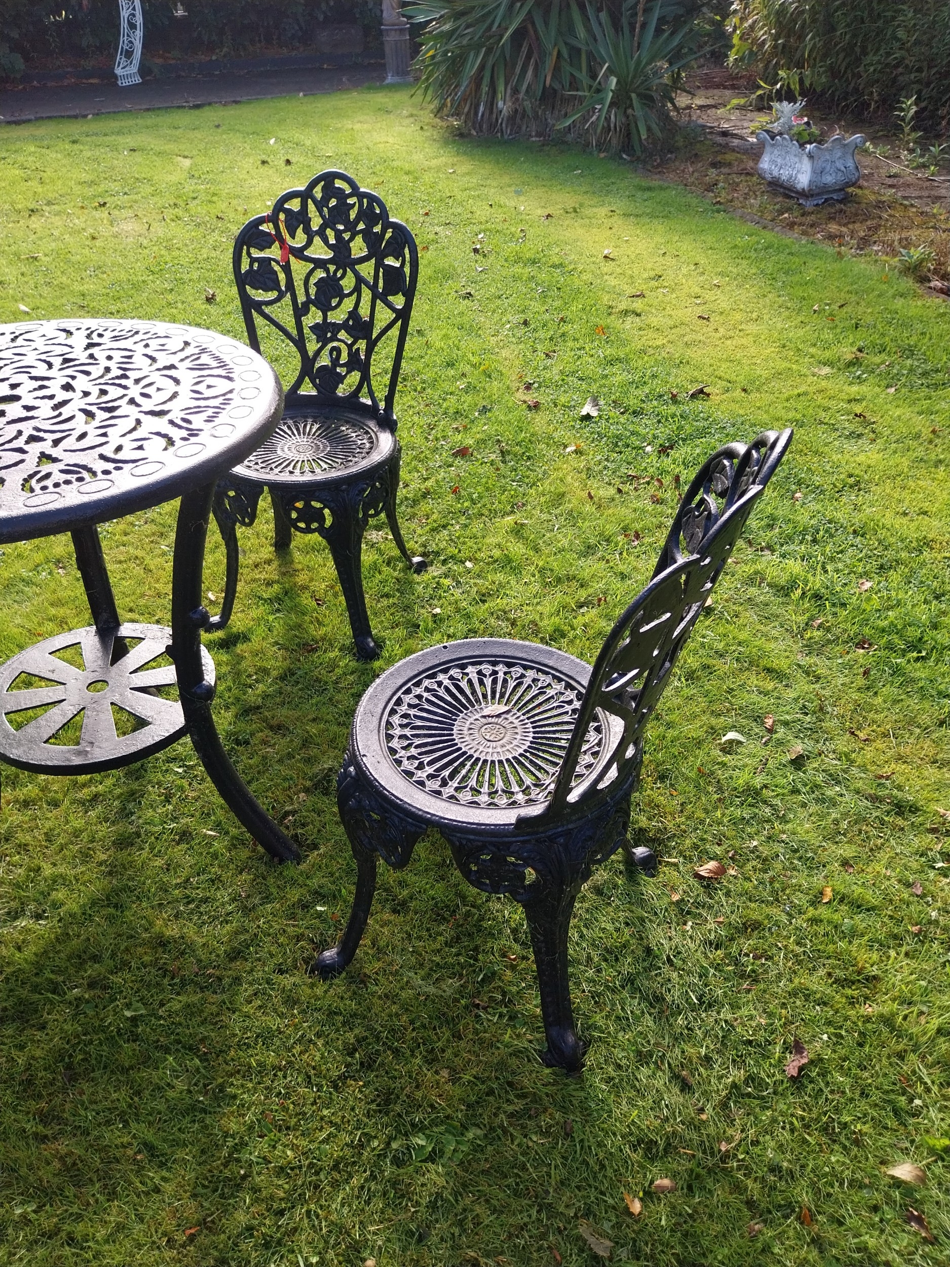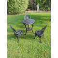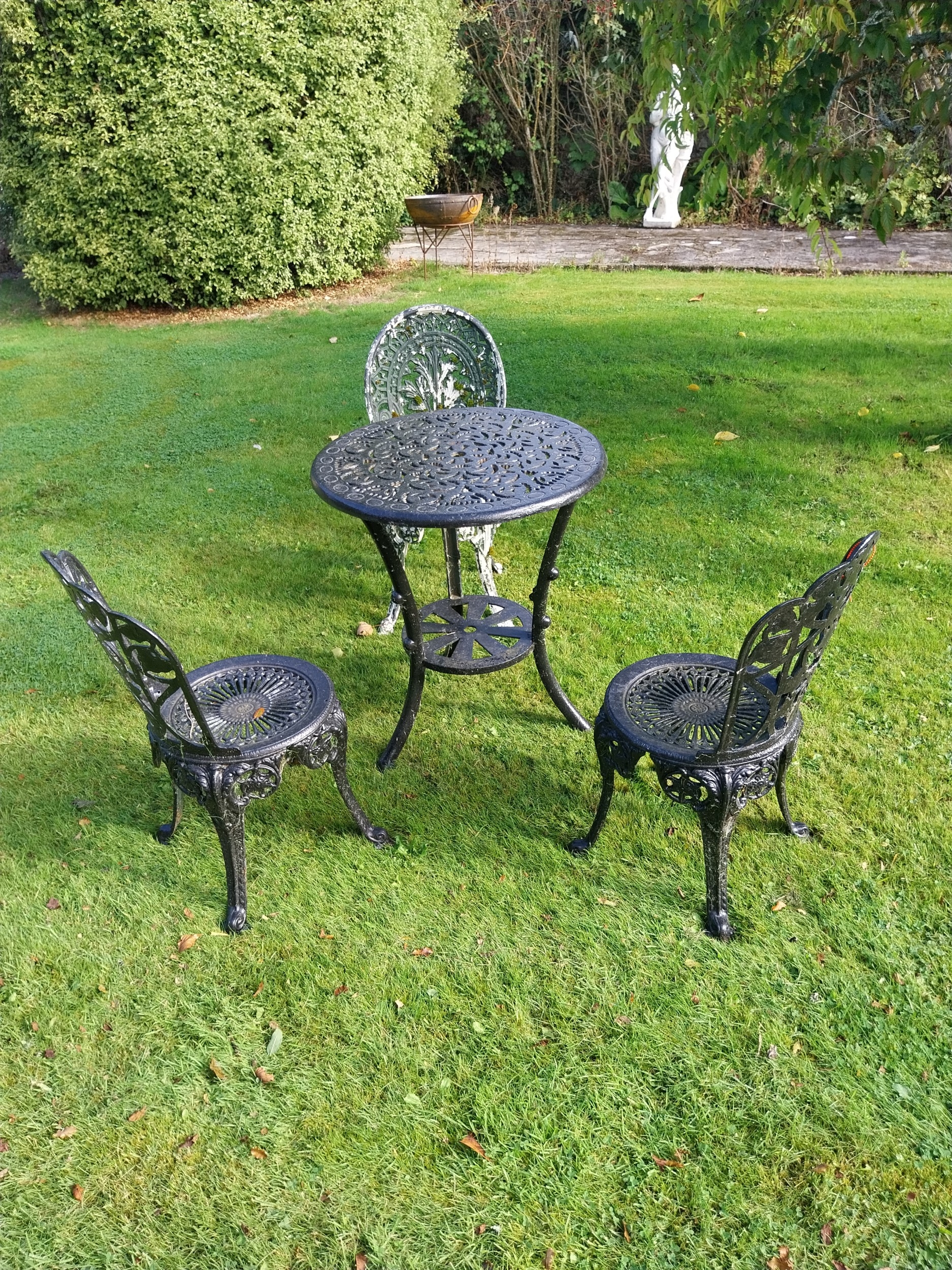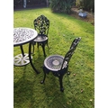 Four piece cast iron garden set - Table { 73cm H X 66cm Dia } & two matching chairs { 80cm H X 40cm W X 42cm D }and cast alloy chair .