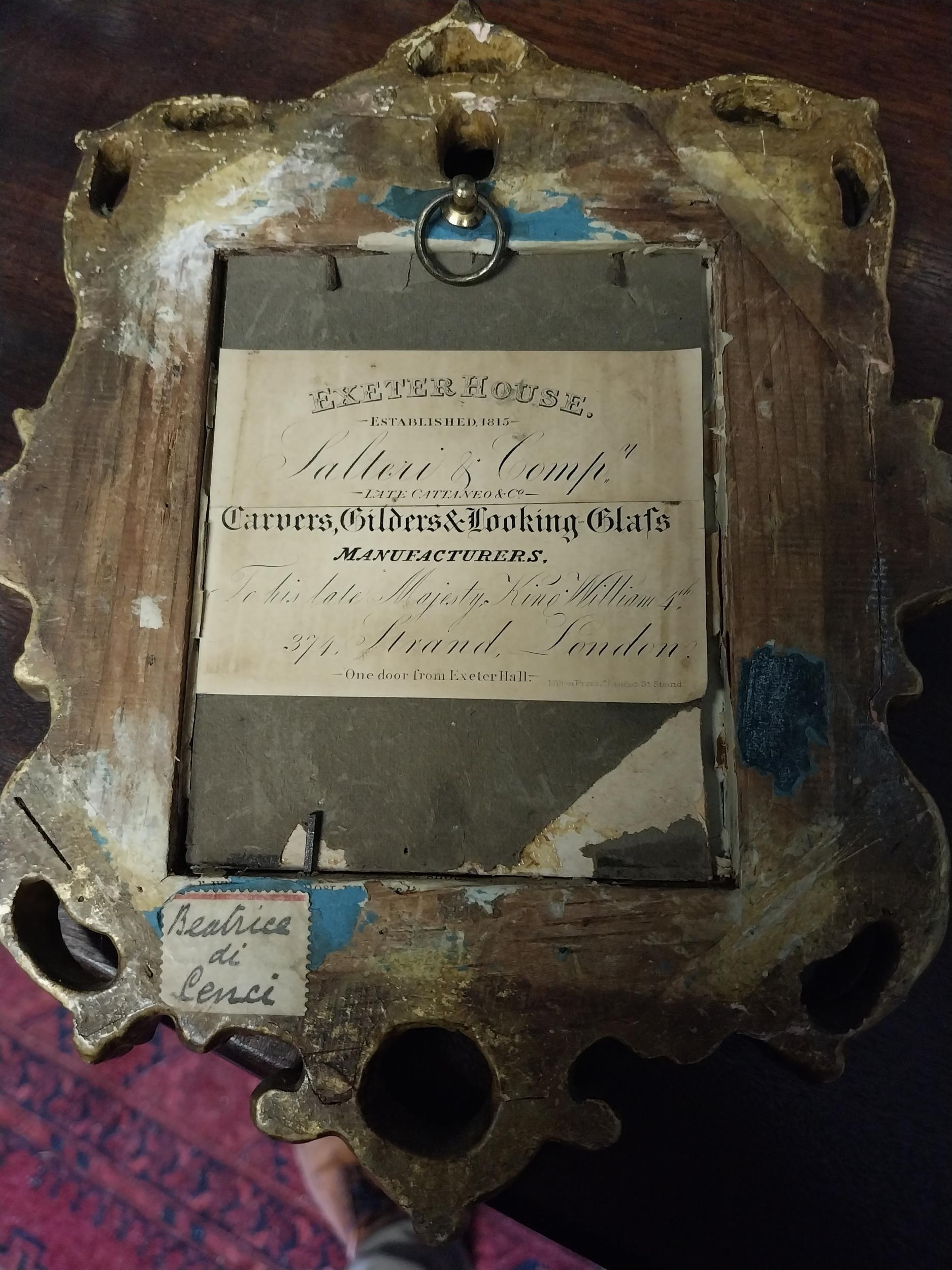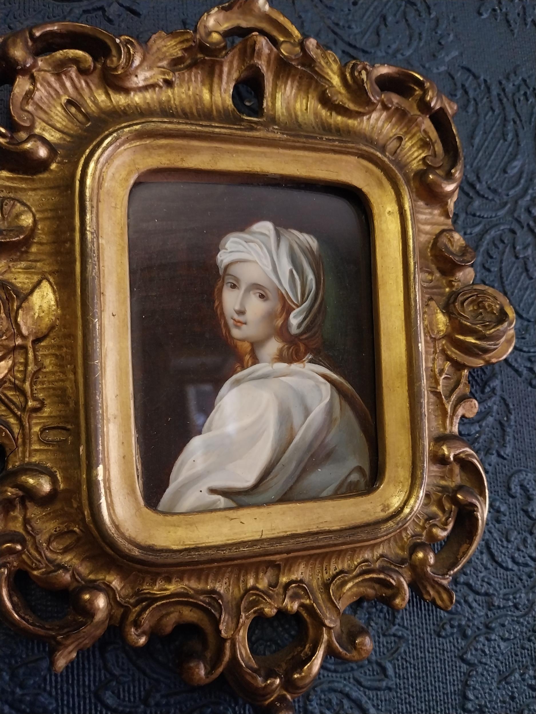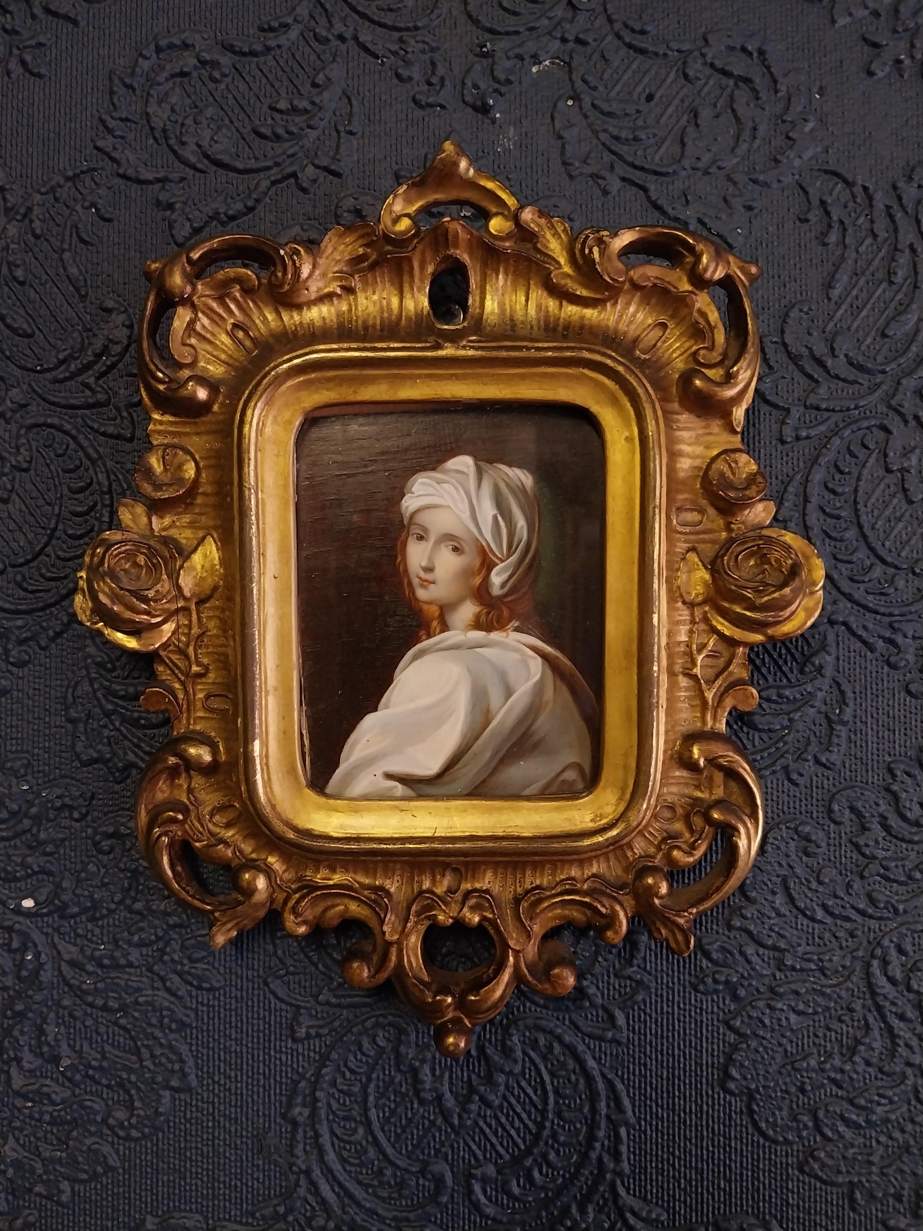 Early 19th C. Oil on Board miniature portrait of Beatrice di Censi mounted in gilt frame. {22 cm H x 18 cm W}. NOT AVAILABLE TO VIEW IN PERSON