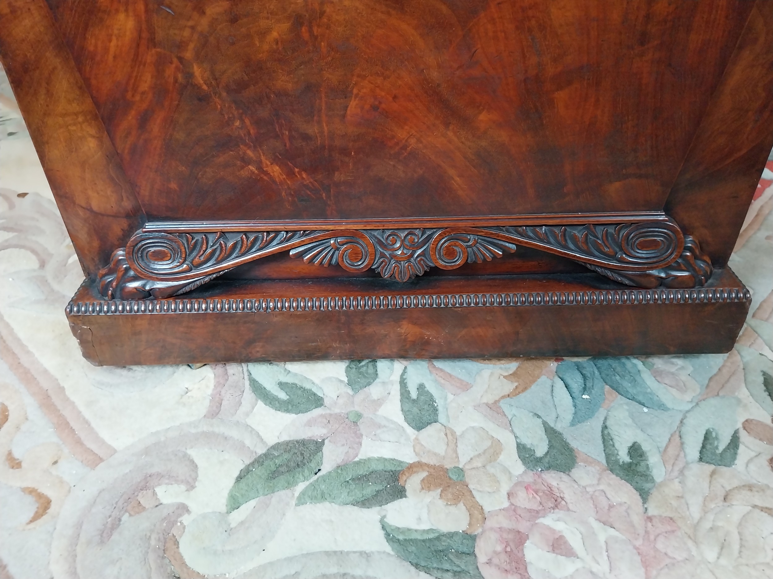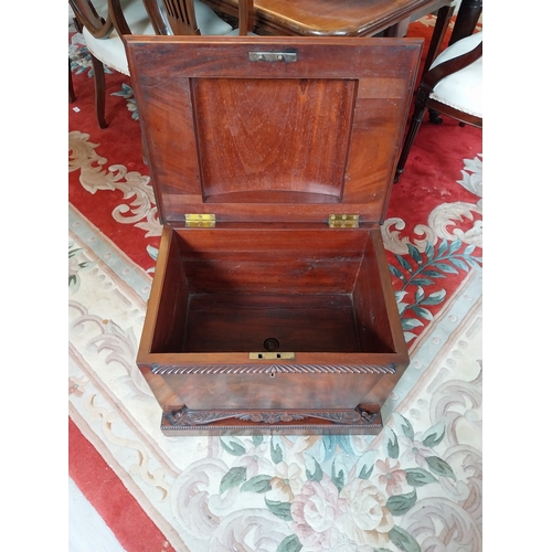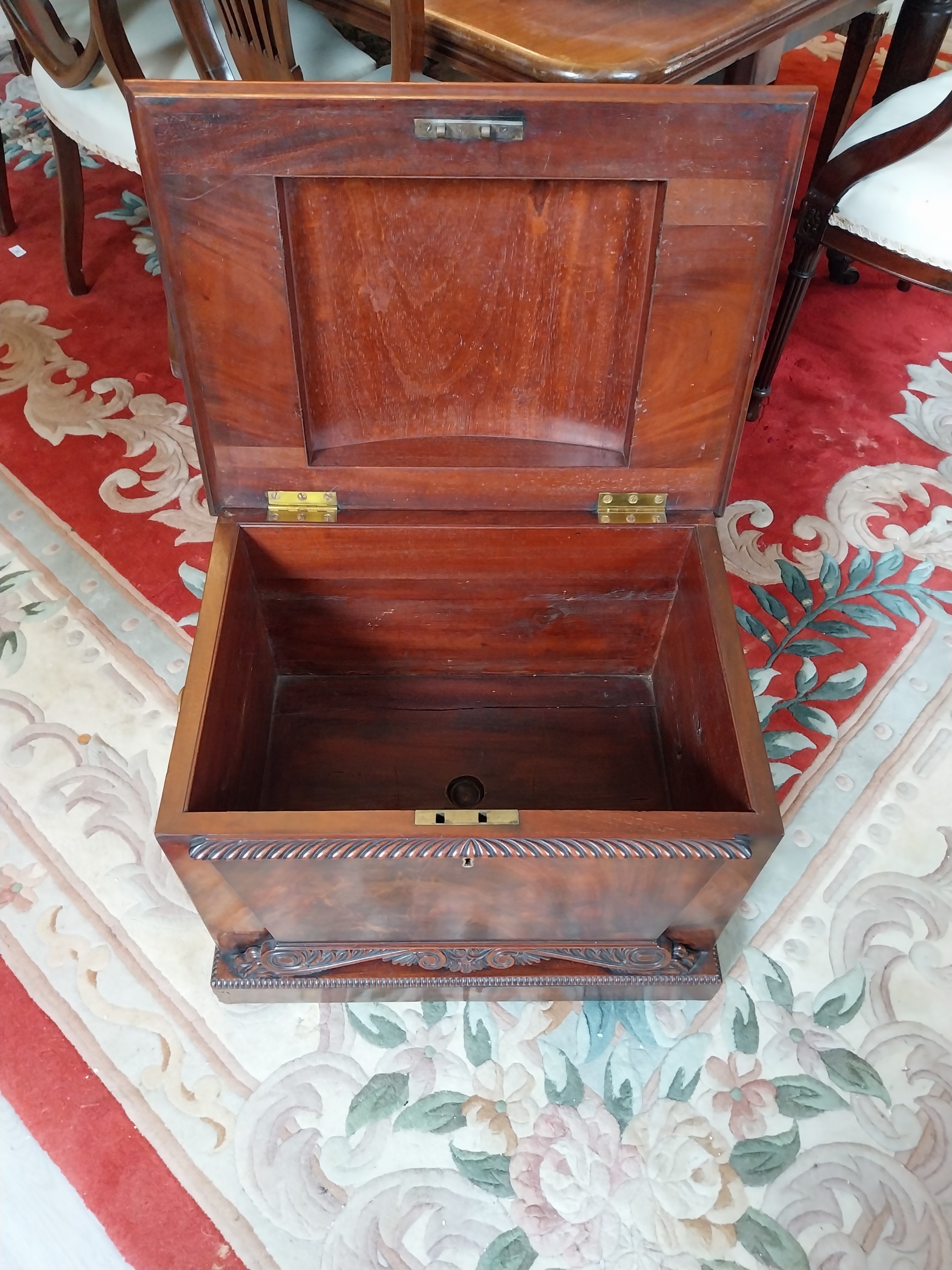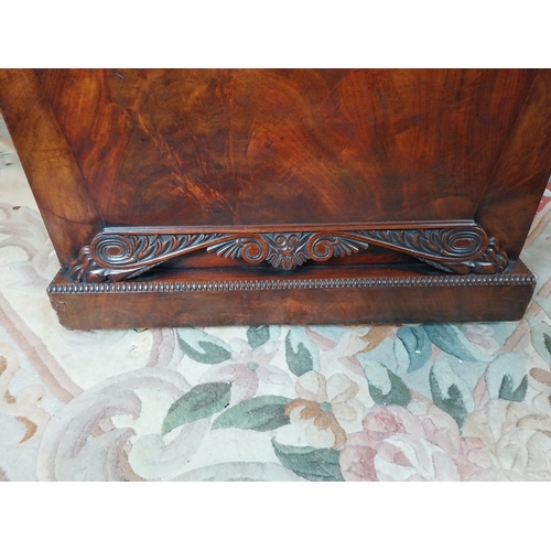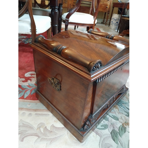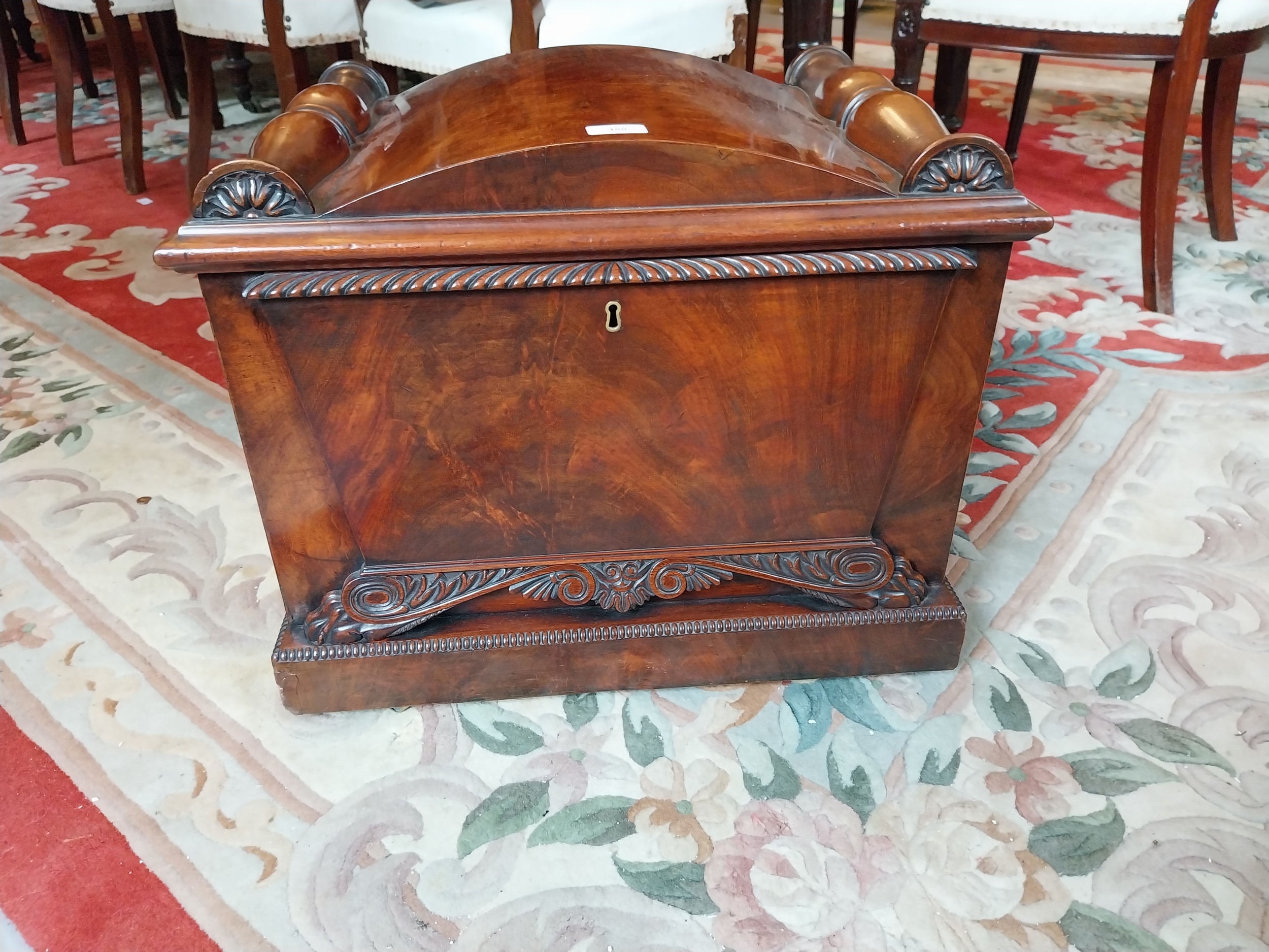 Exceptional quality Will. IV. flamed mahogany sarcophagus cellarette, decorated with lion's paw feet. { 46cm H X 56cm W X 43cm D }.