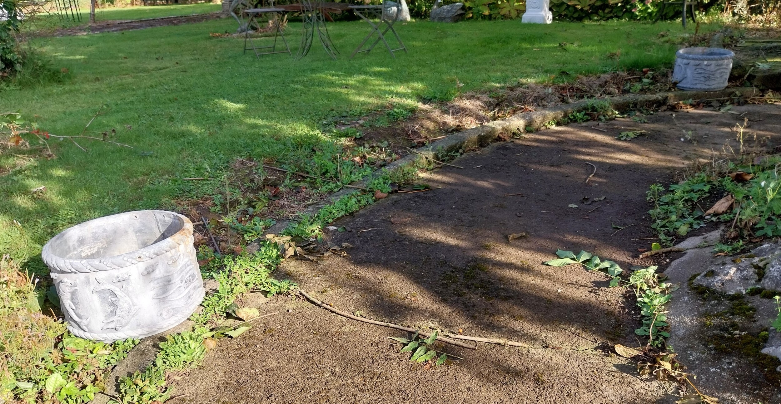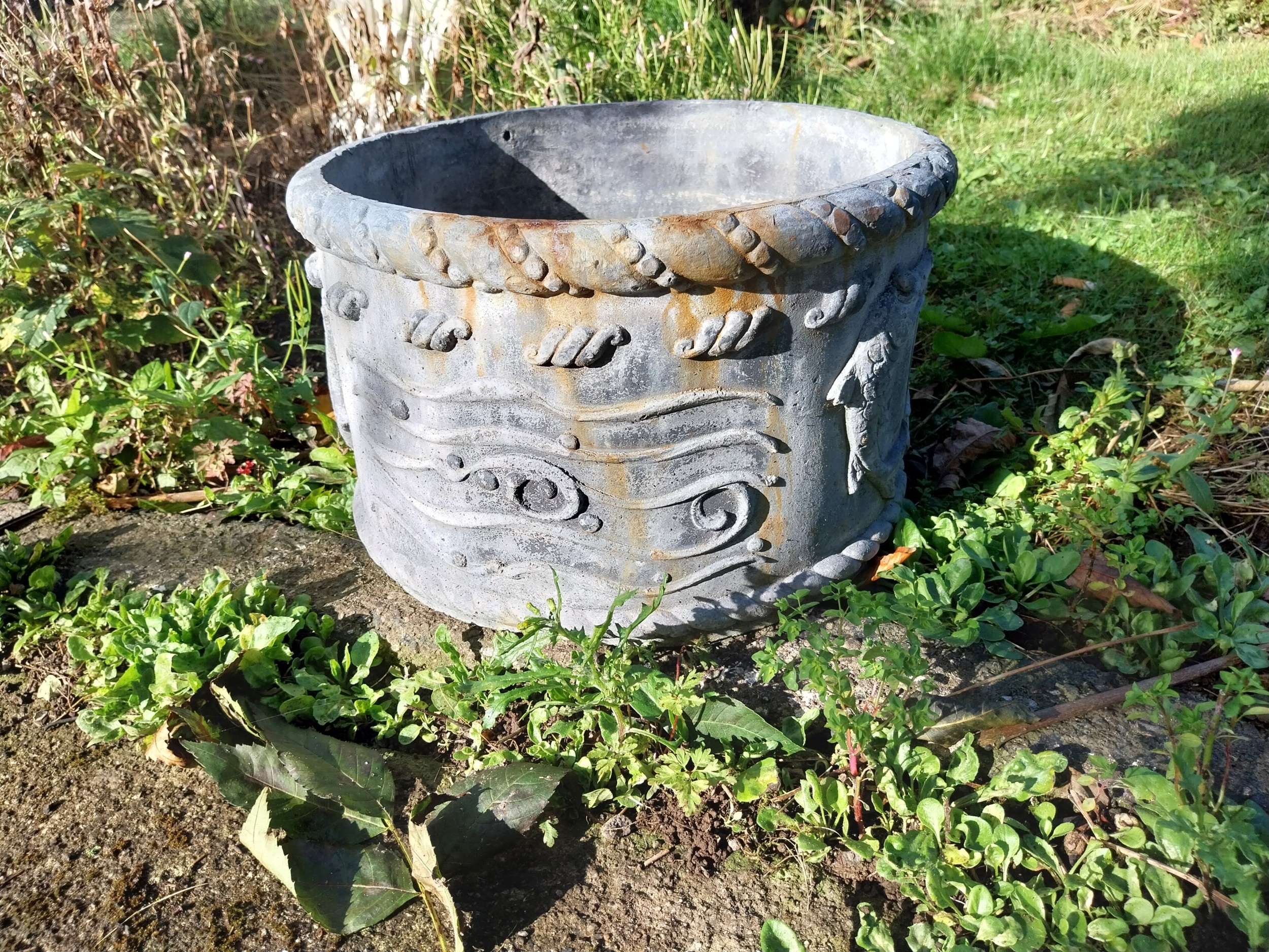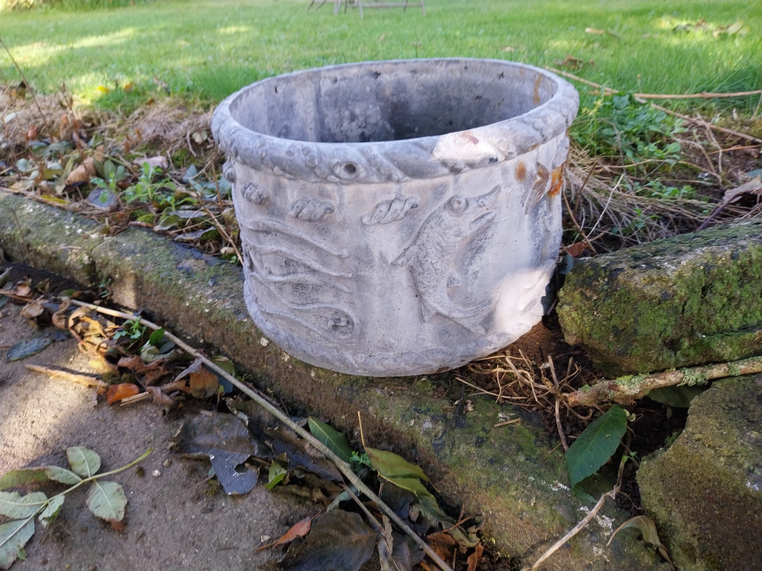Pair of 19th. C. lead planters decorated with Dolphins. { 23cm H X 37cm Dia }.
