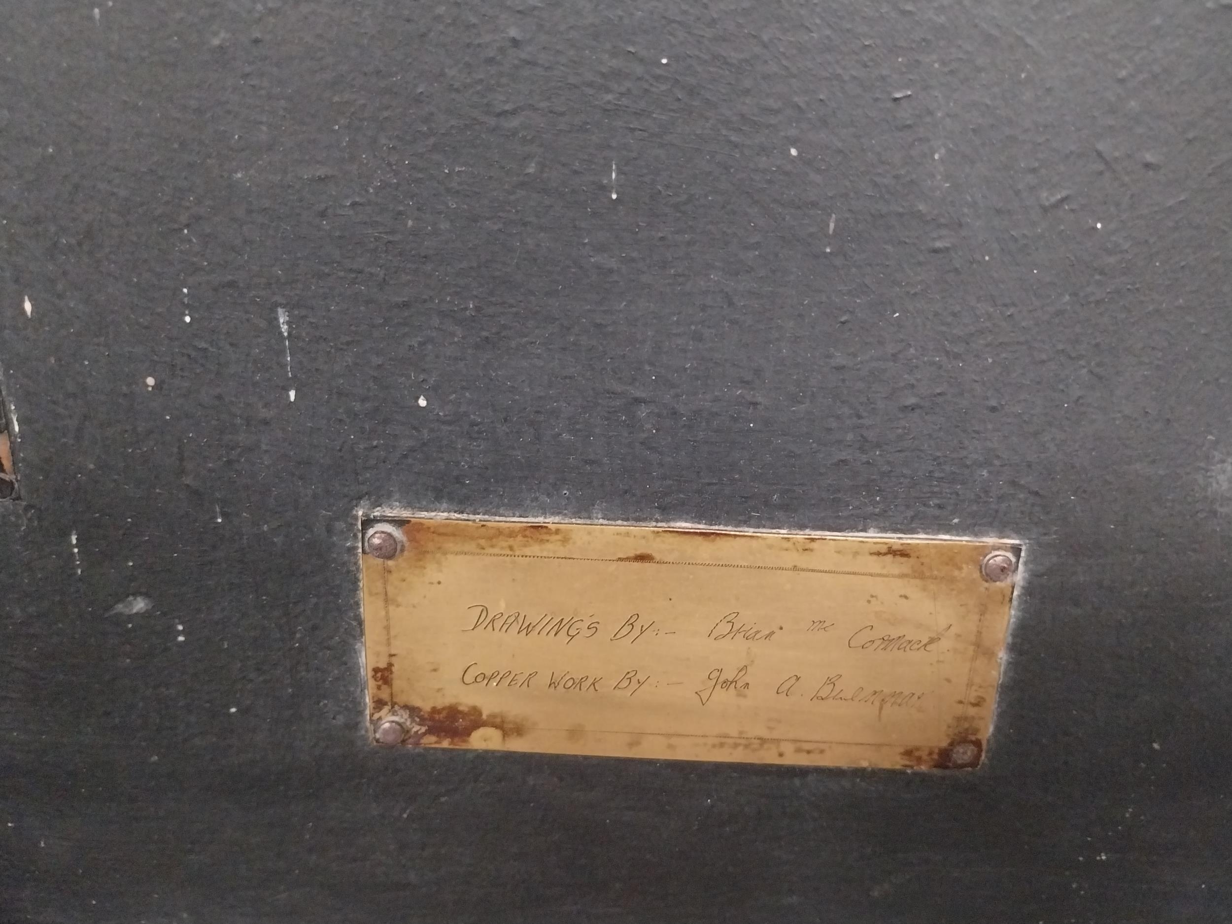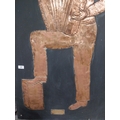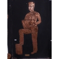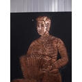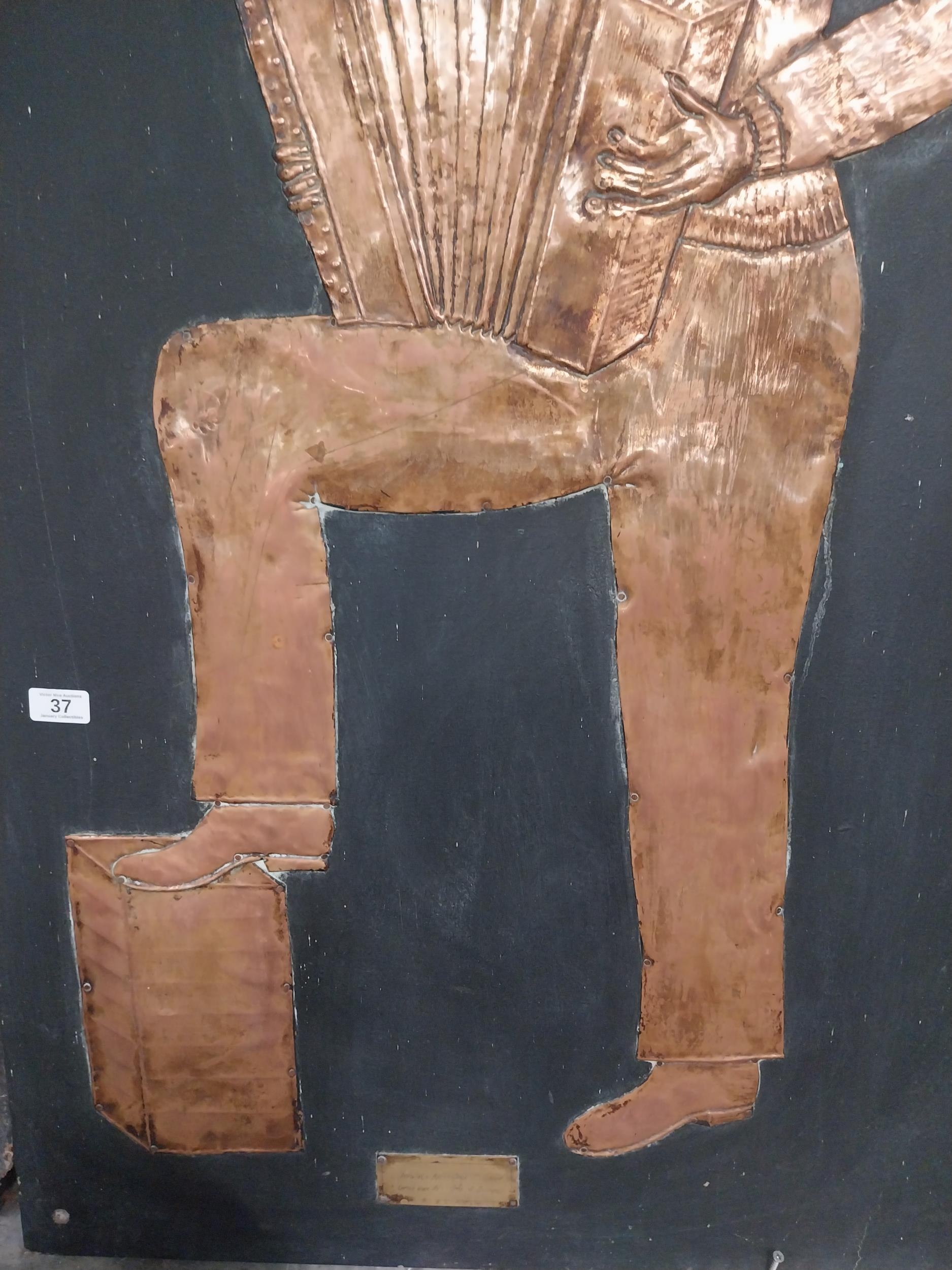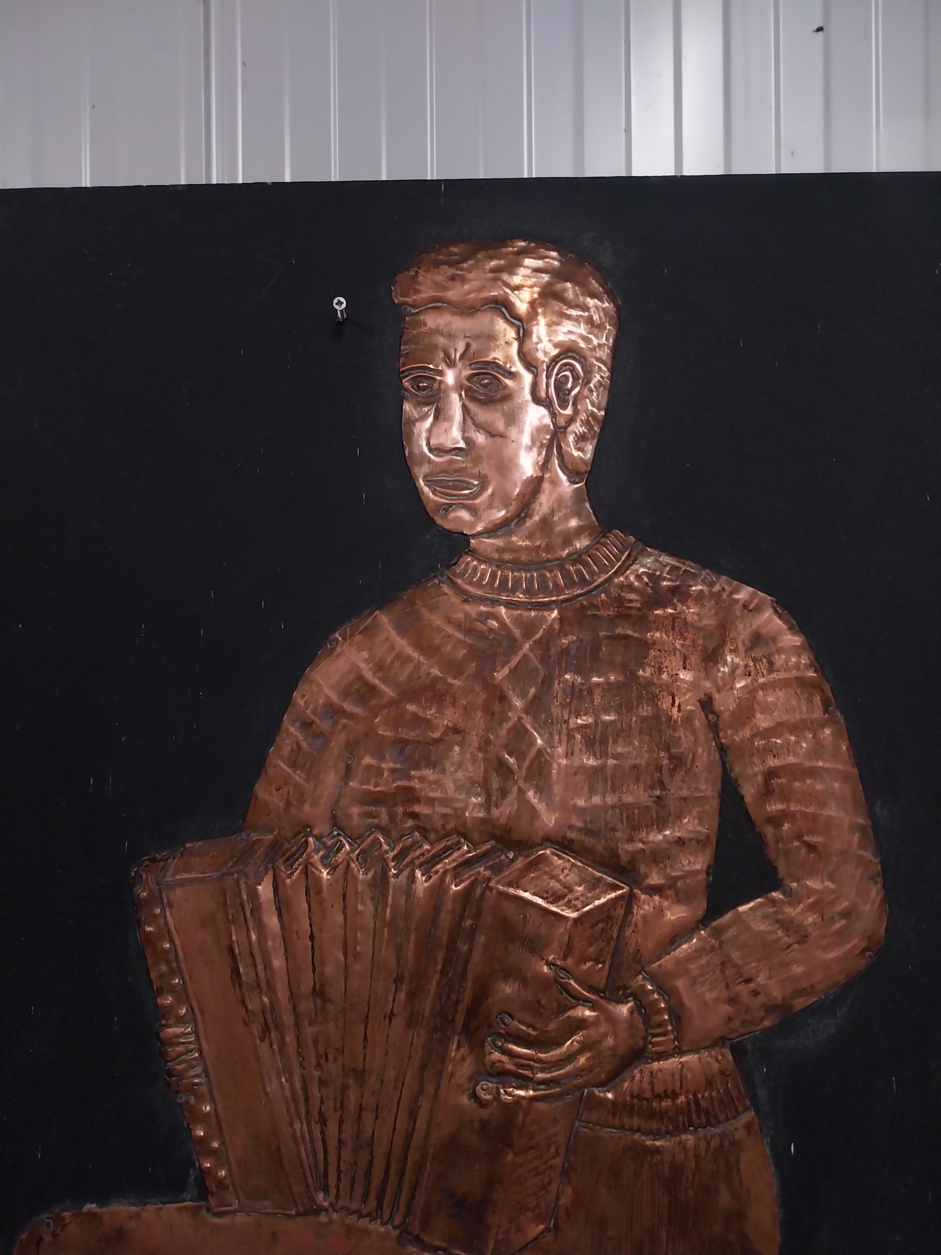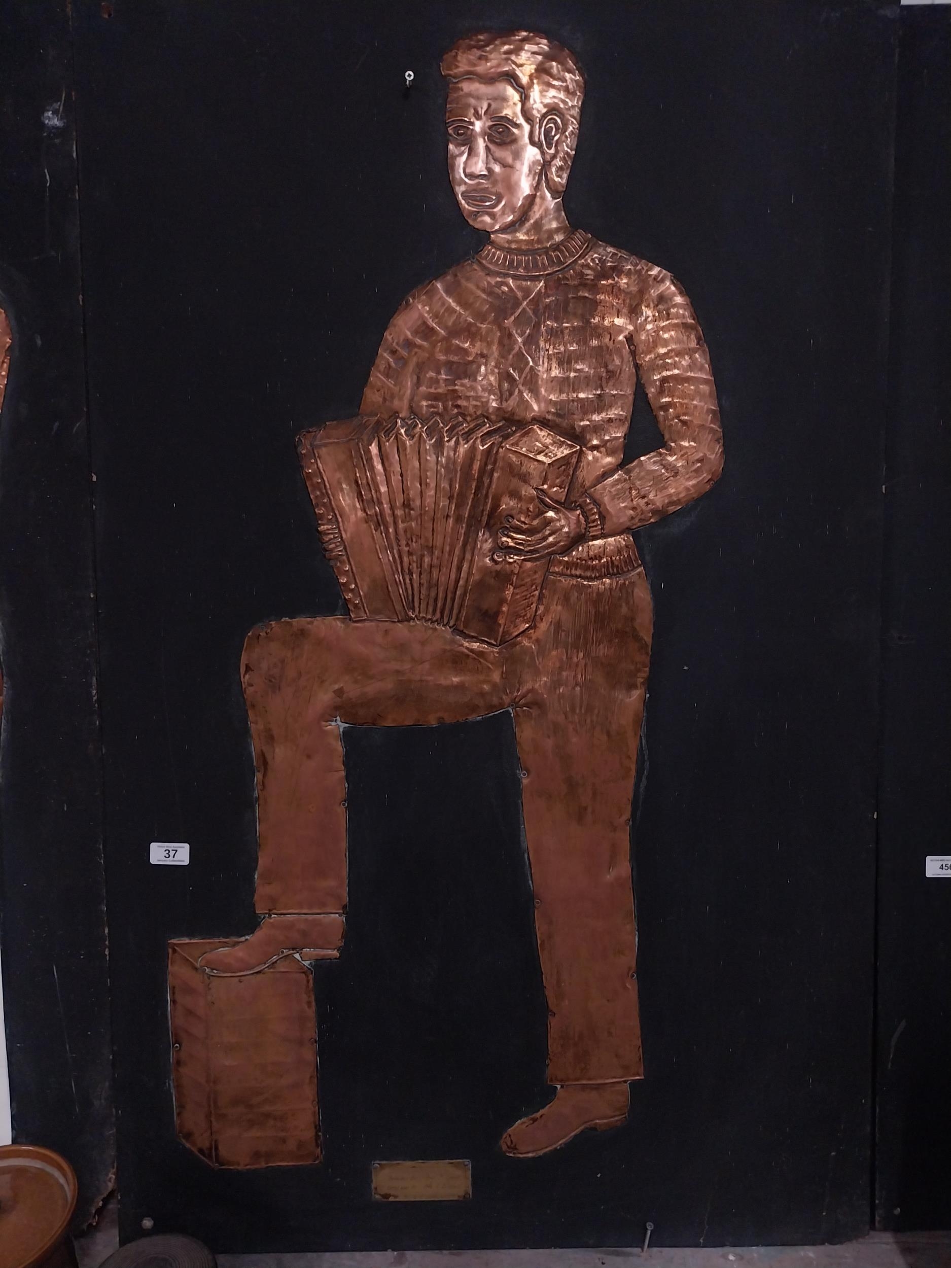 Embossed copper figure of Button Accordianist on painted board originally from Slattery's Pub Capel Street with brass plaque Drawings by Brian Mc Cormack and Copper works by John A Brennan. {122 cm H x 76 cm W}.