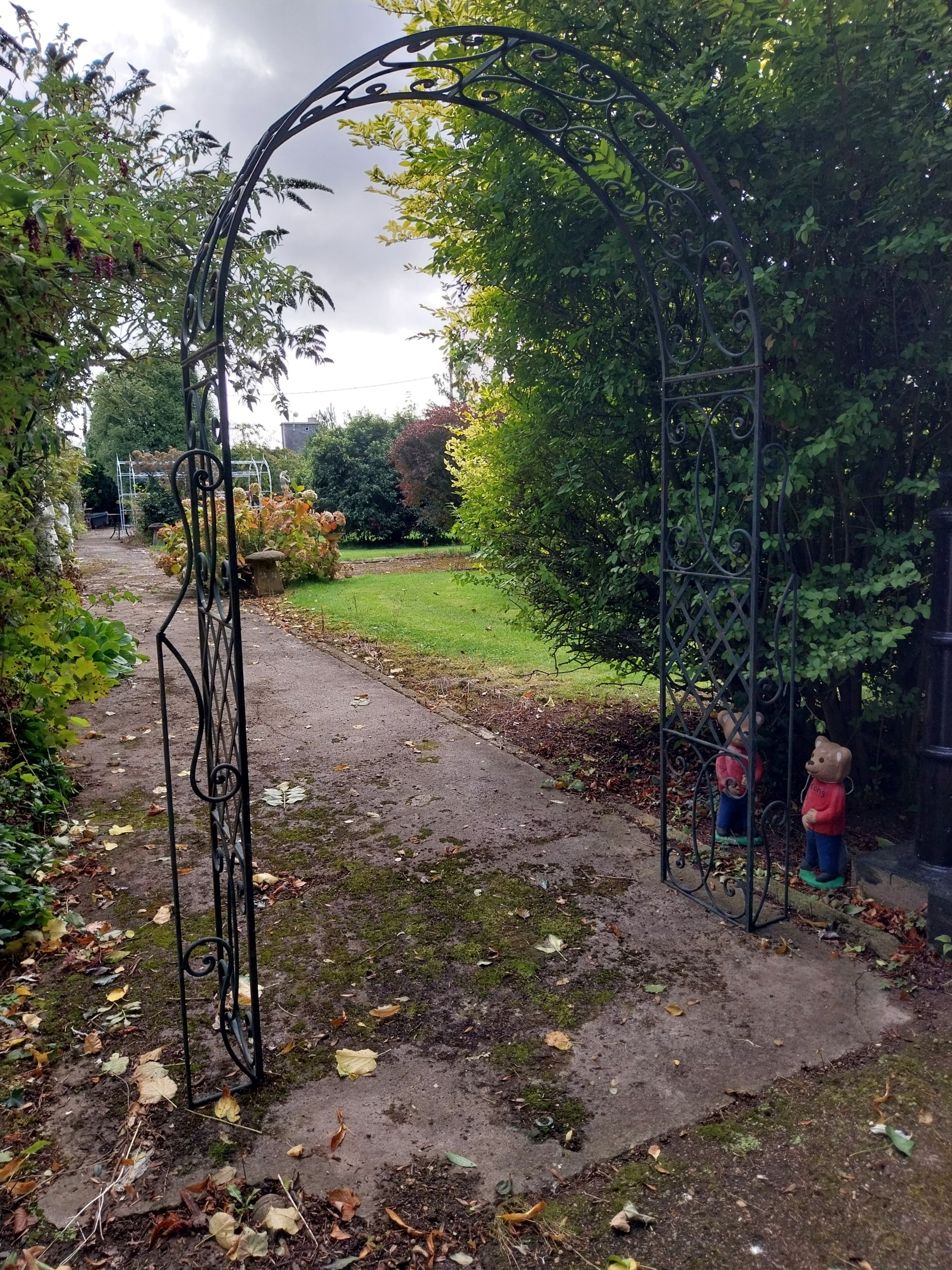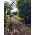 Bronze effect wrought iron rose arch. { 230cm H X 174cm W X 40cm D }.