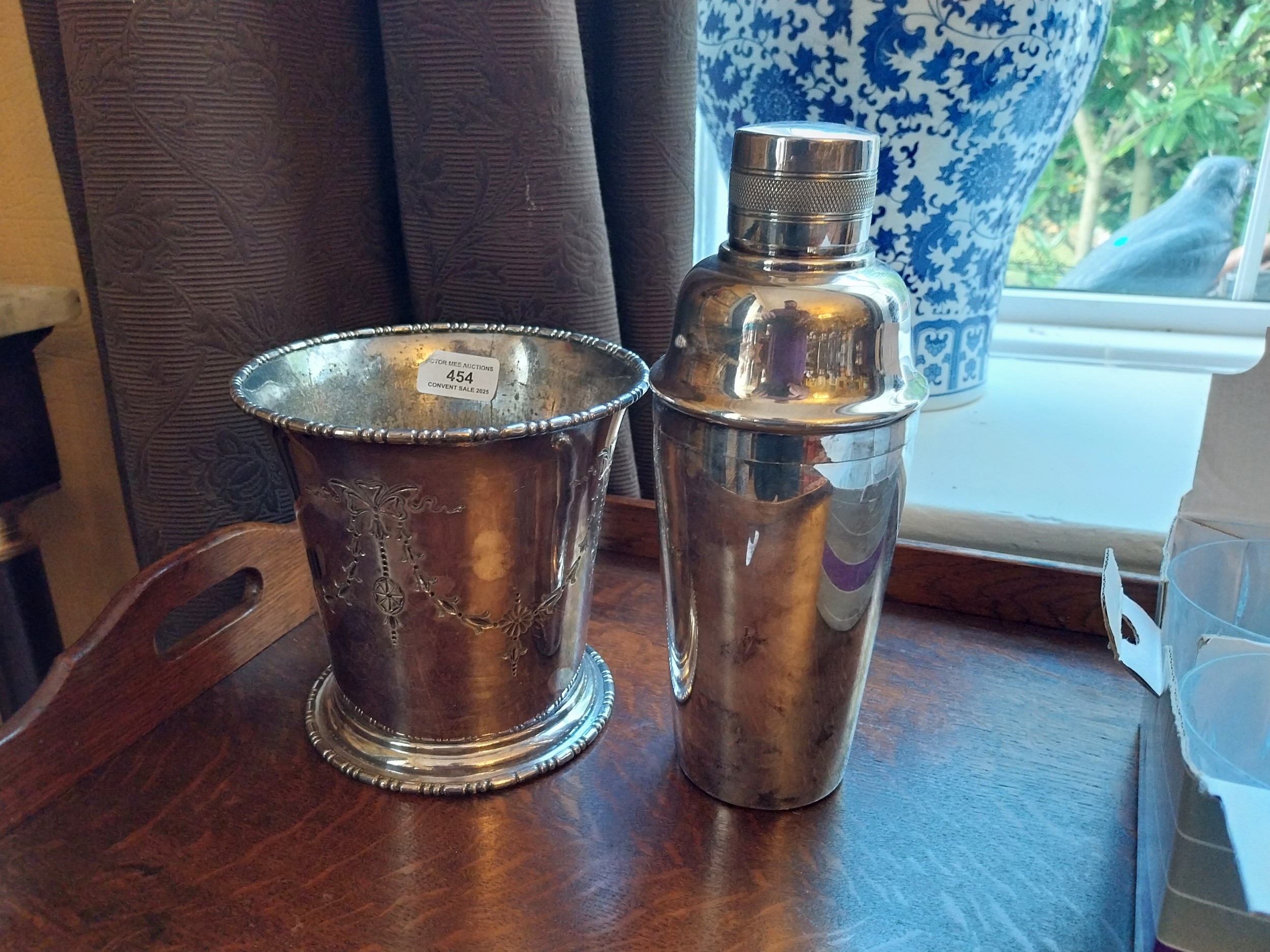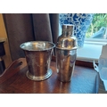 Edwardian silver plated Champagne bucket and cocktail shaker. { 16cm H X16cm Dia & 25cm H X 10cm Dia }.