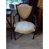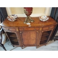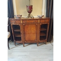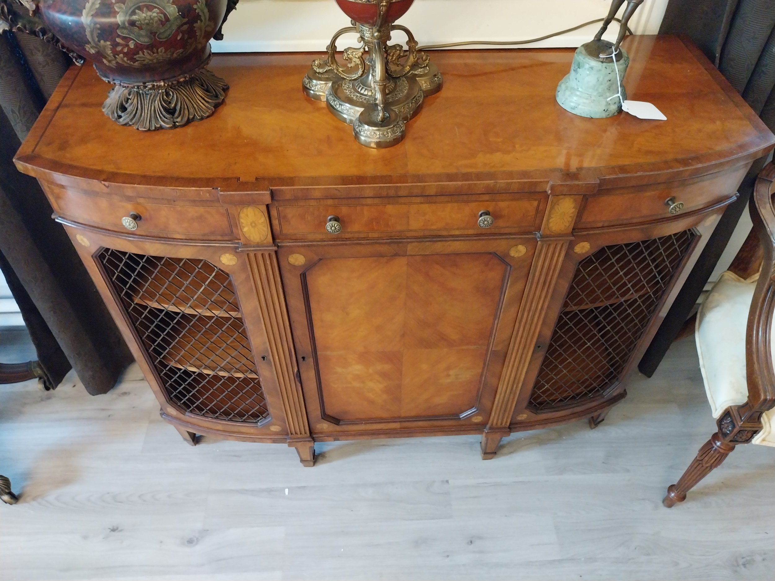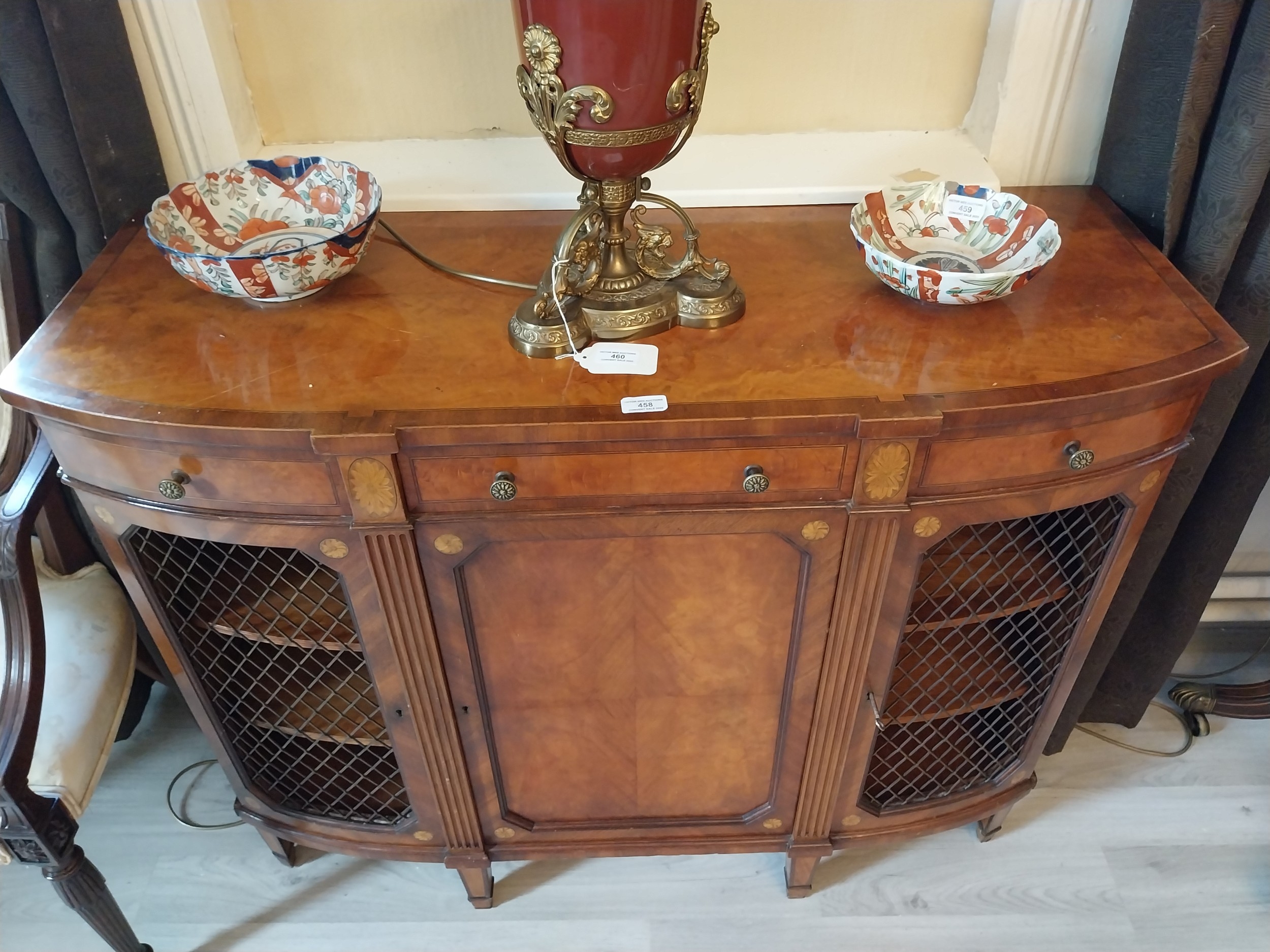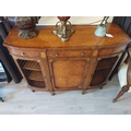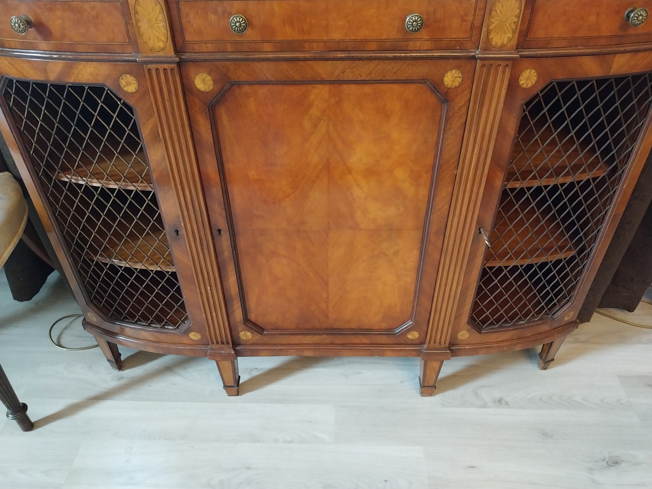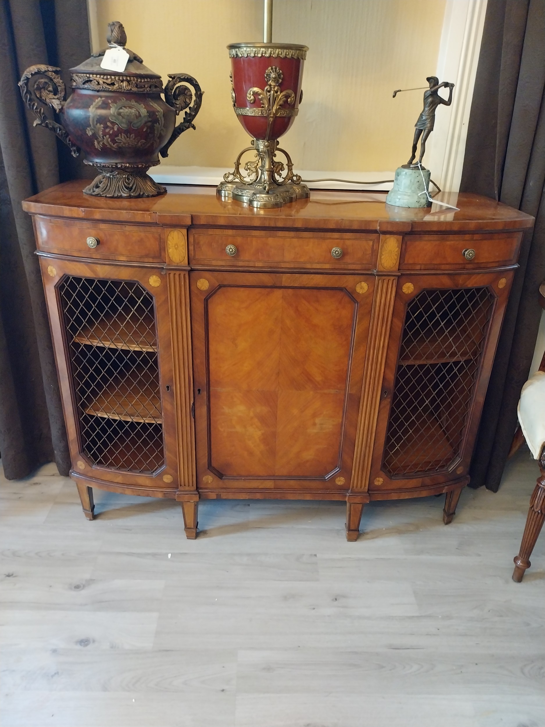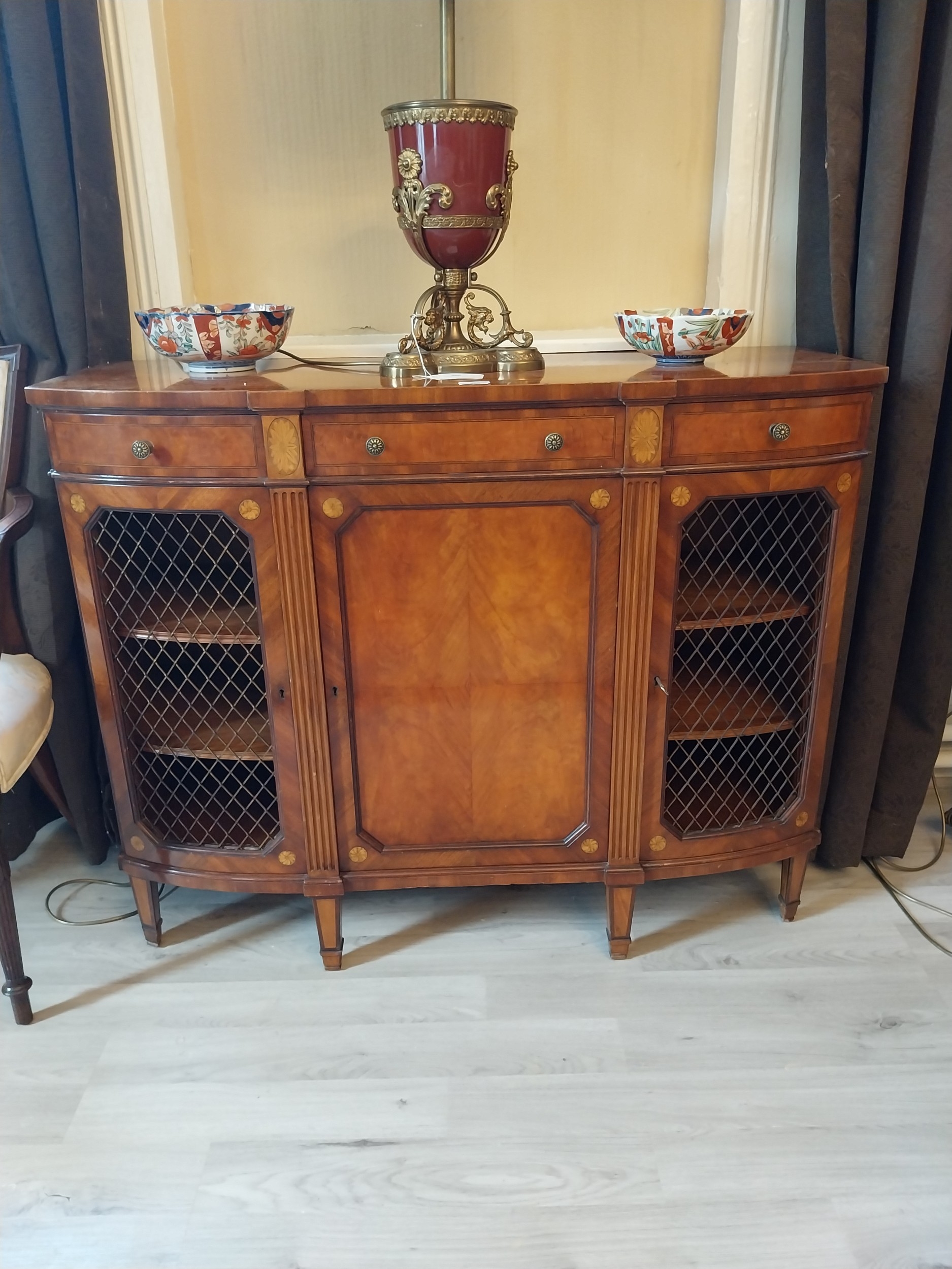 Pair of exceptional quality satinwood inlaid side cabinets, the centr panelled door flanked by mesh panelled doors, raised on square tapered legs and spade feet. { 87cm H X 110cm W X 43cm D }.