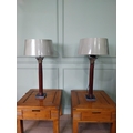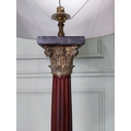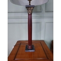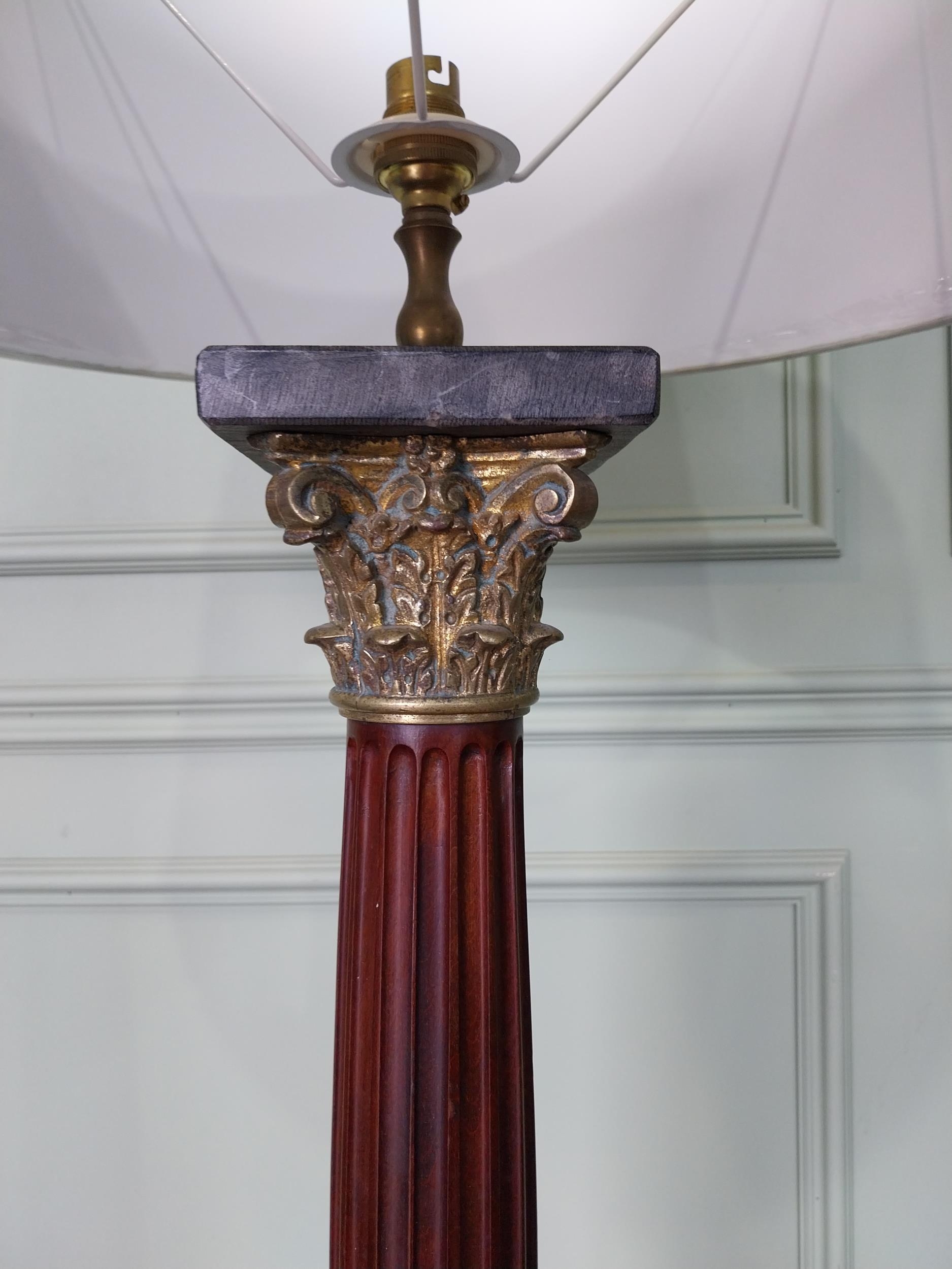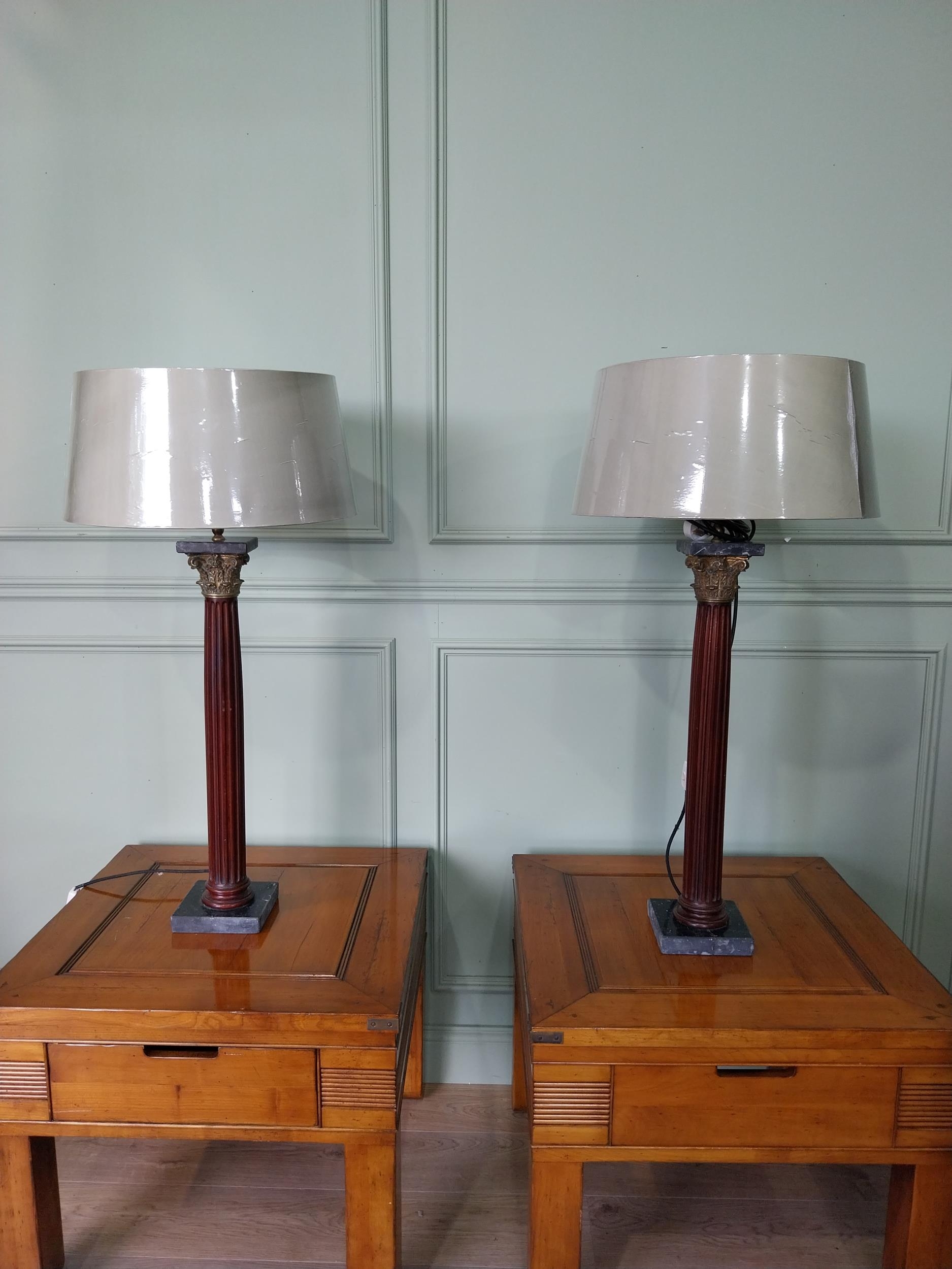 Pair of good quality mahogany corinthian column table lamps on marble base with shades. {100 cm H x 48 cm Dia.}.