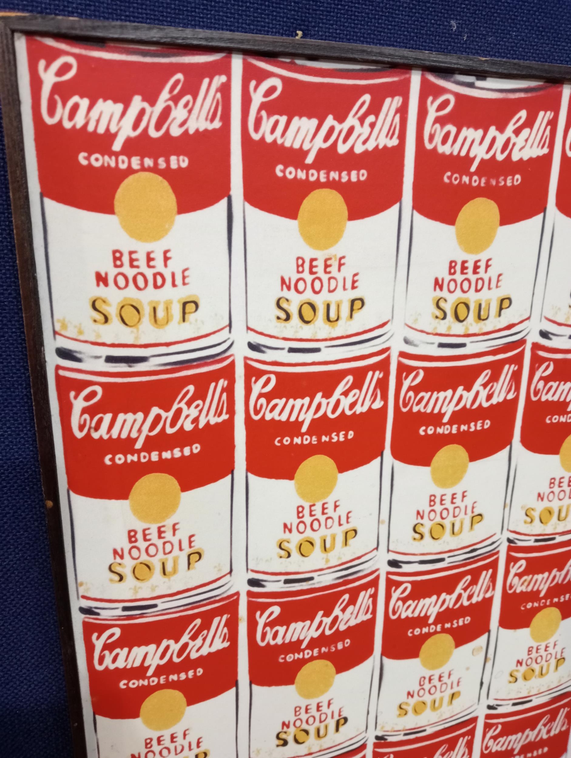 Andy Warhols Campbells Soup pictorial poster. {H 102cm x W 67cm x D 7cm } NOT AVAILABLE TO VIEW IN PERSON