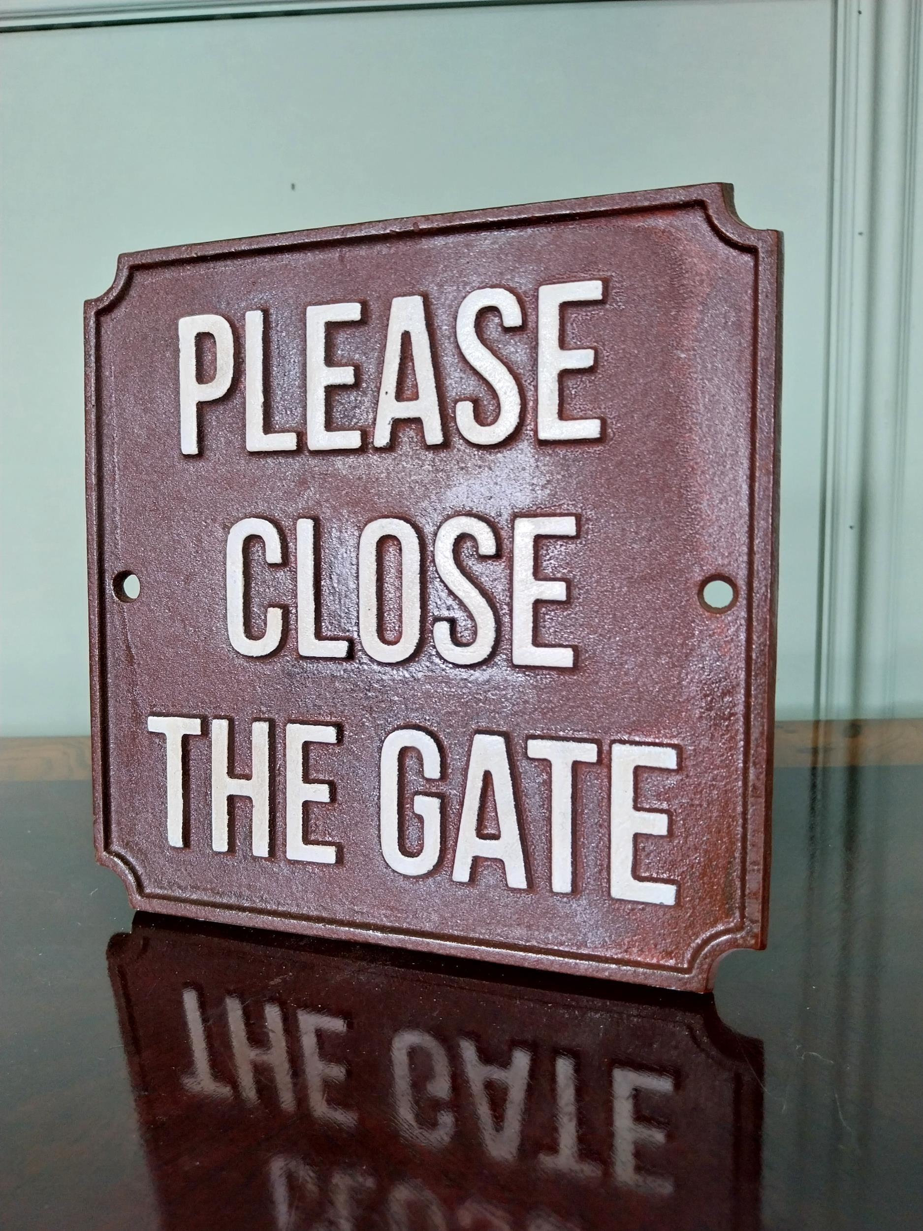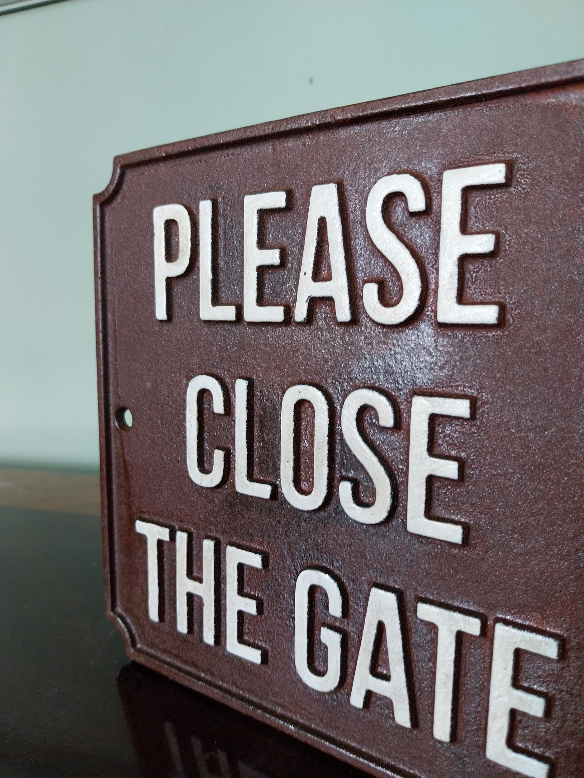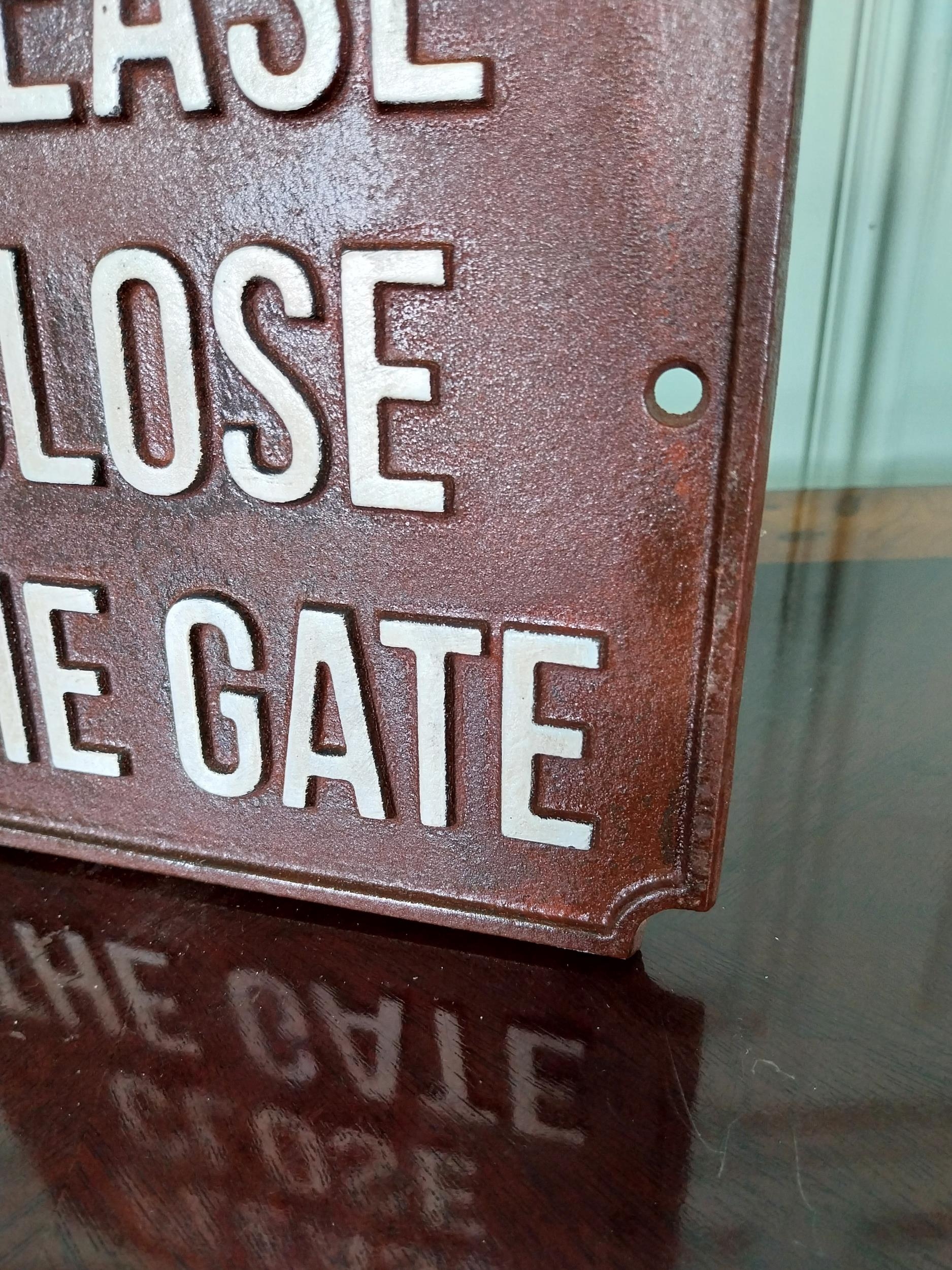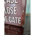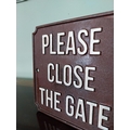 Cast iron Please close the gate sign. {18 cm H x 19 cm W}.