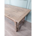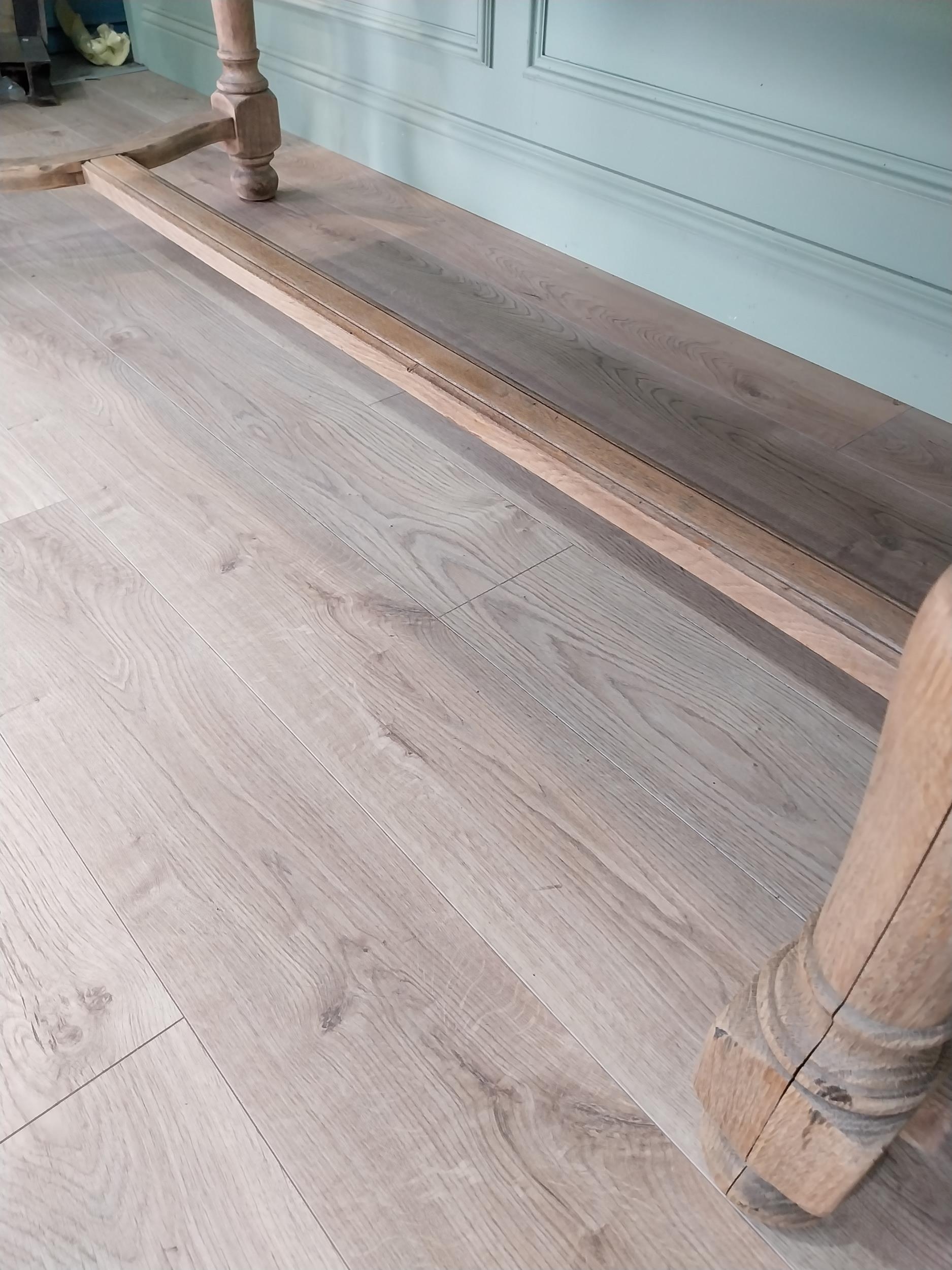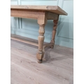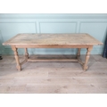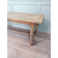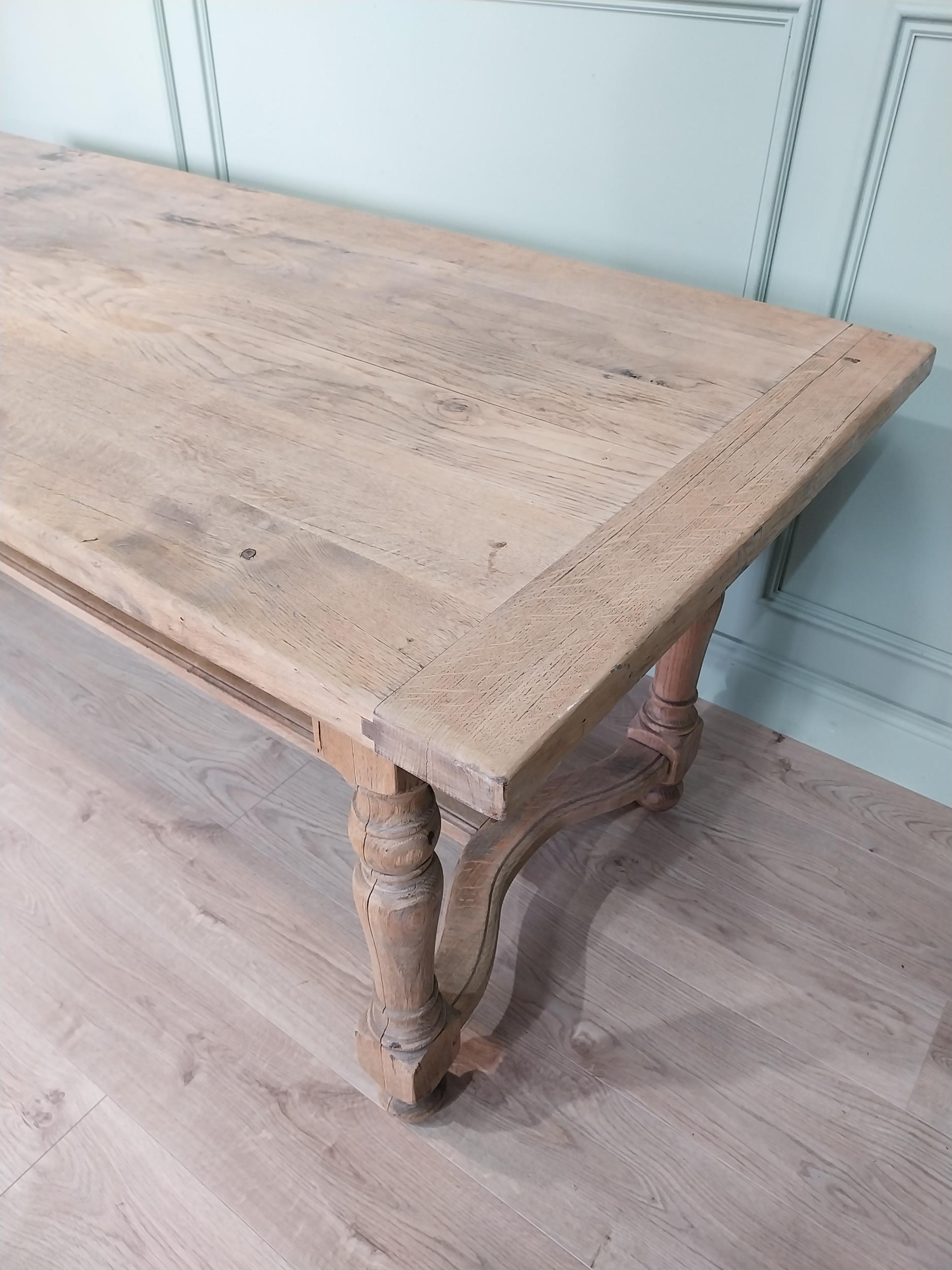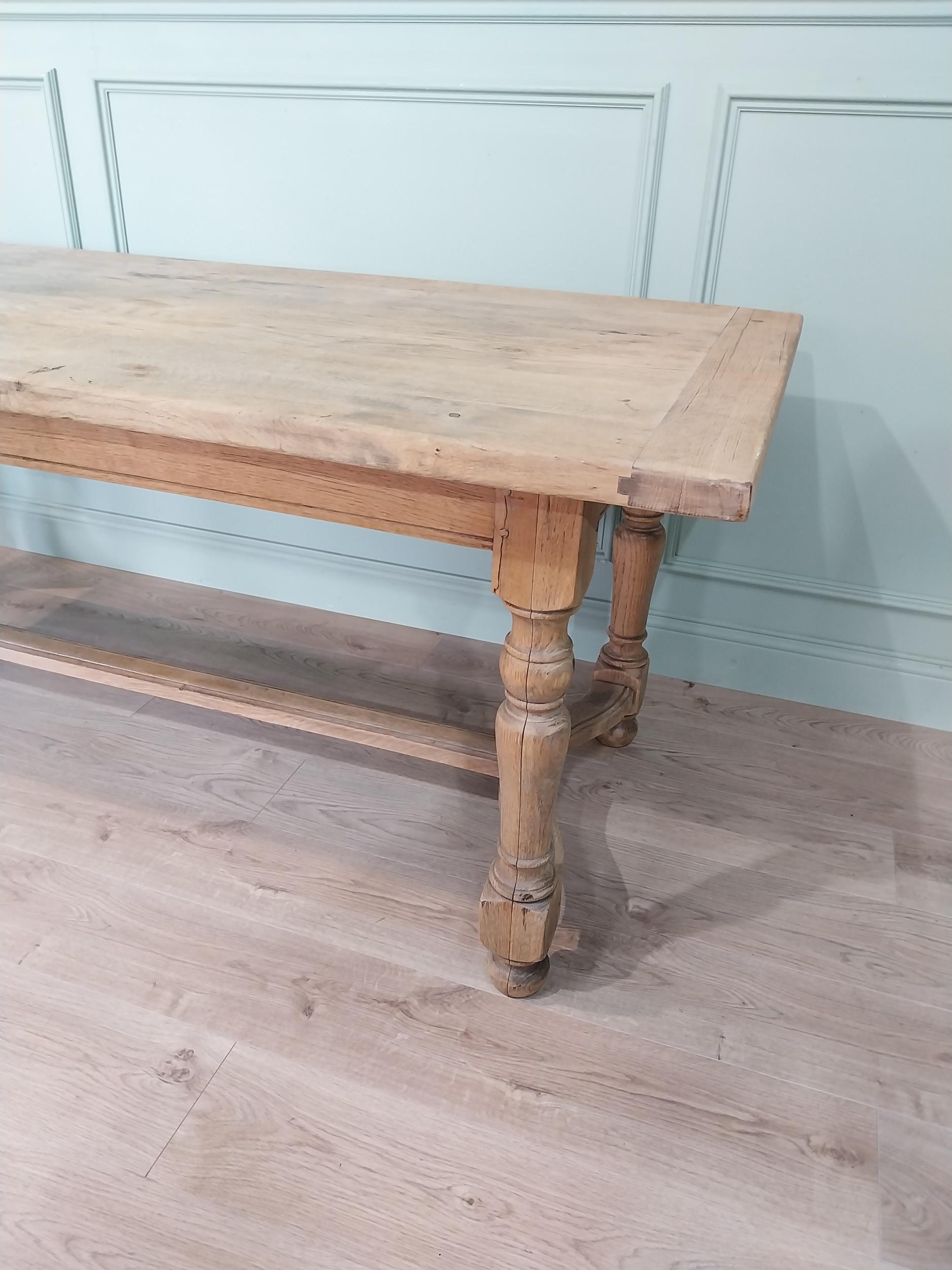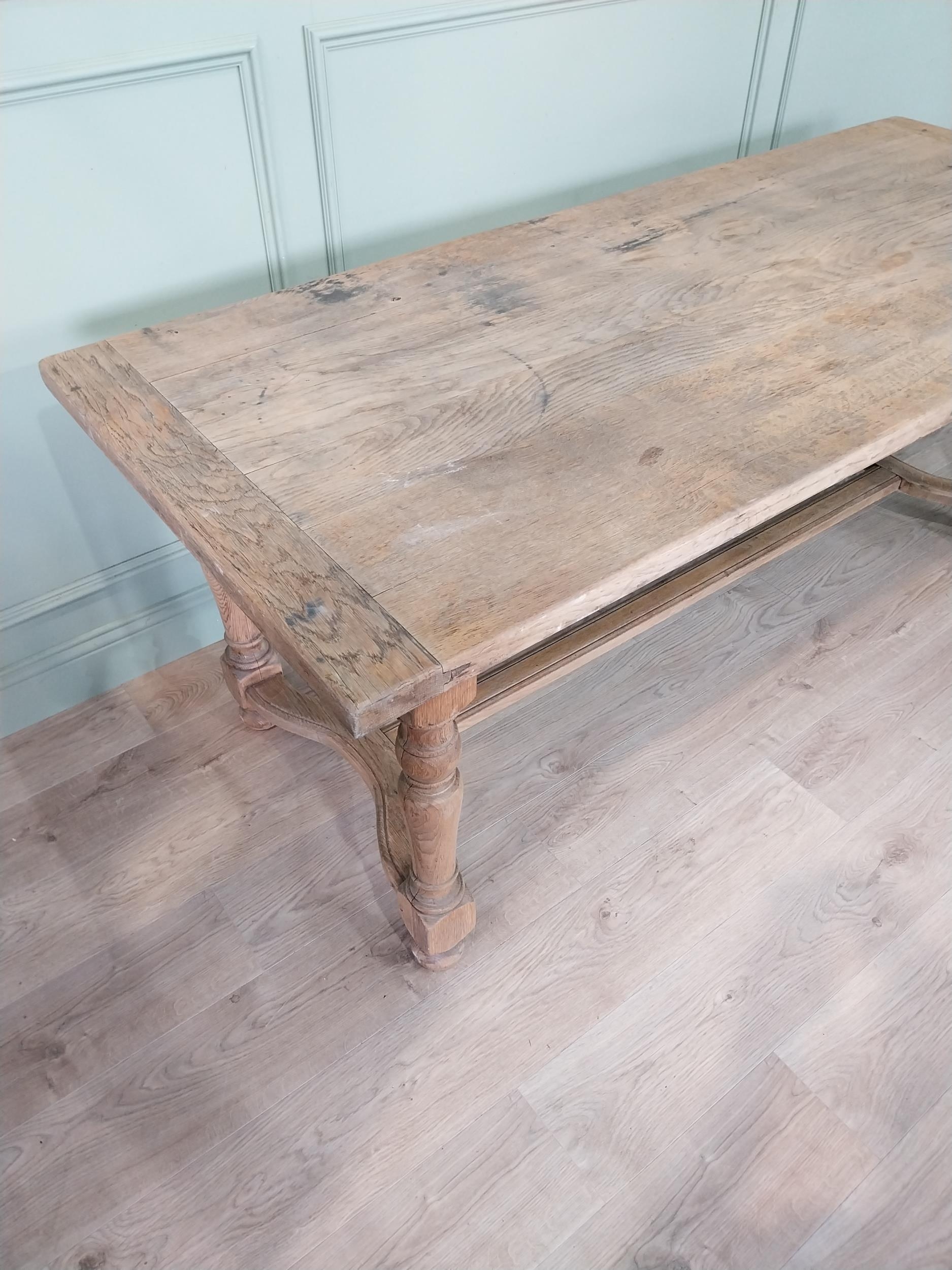 Good quality early 20th C. bleached oak kitchen table on turned legs and single stretcher. {77 cm H x 200 cm W x 85 cm D}.