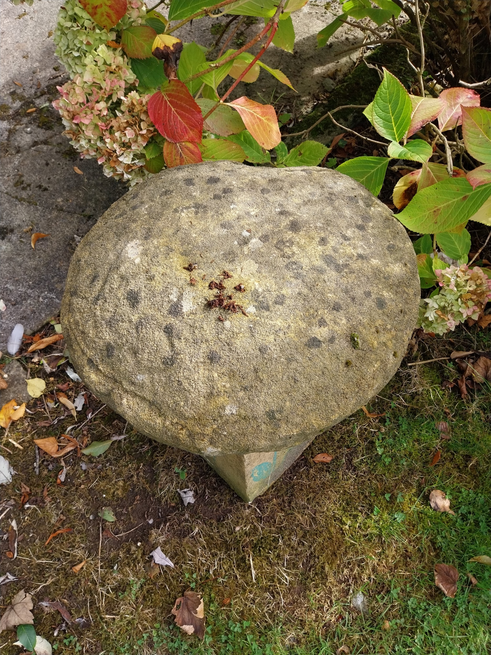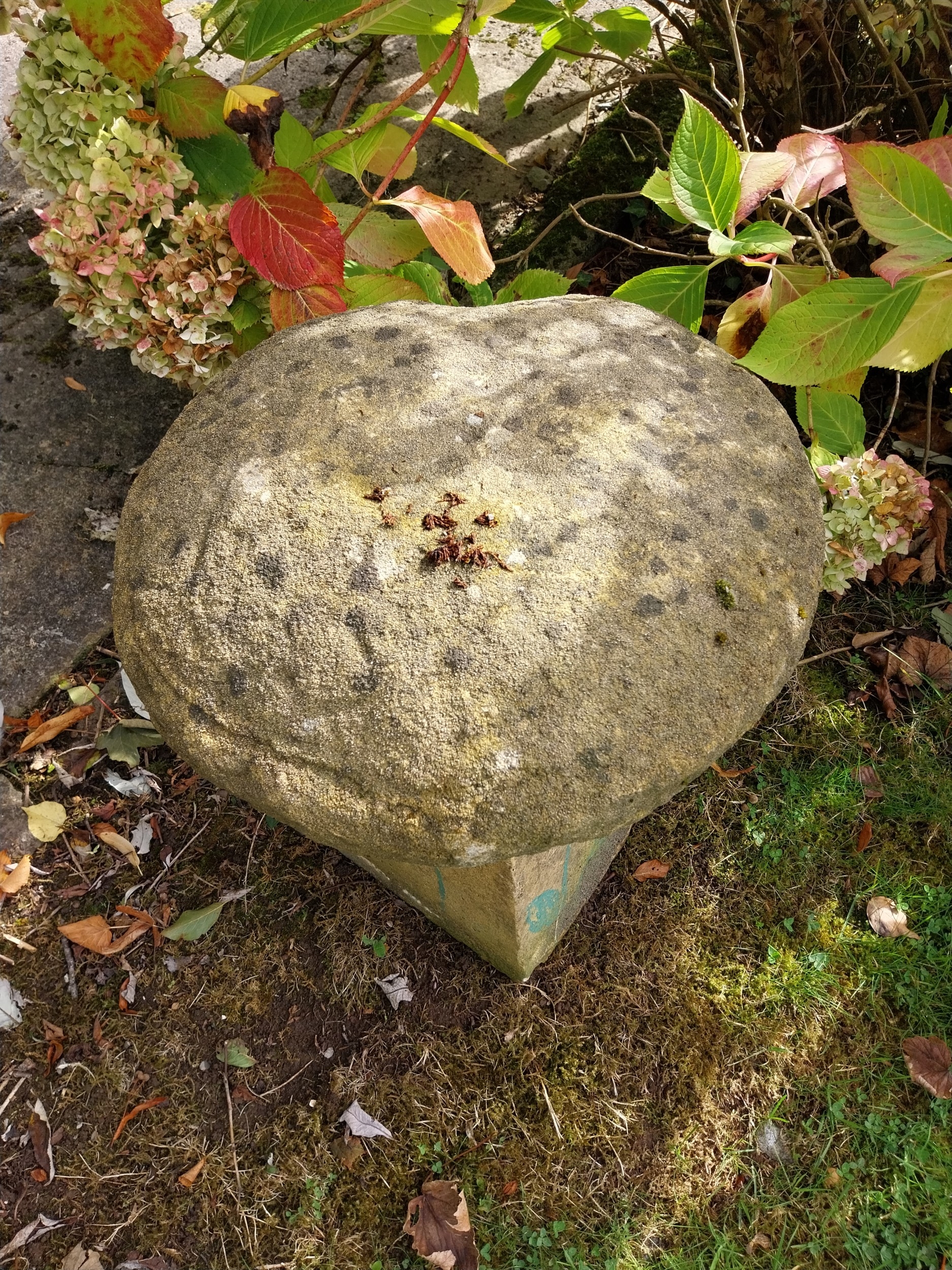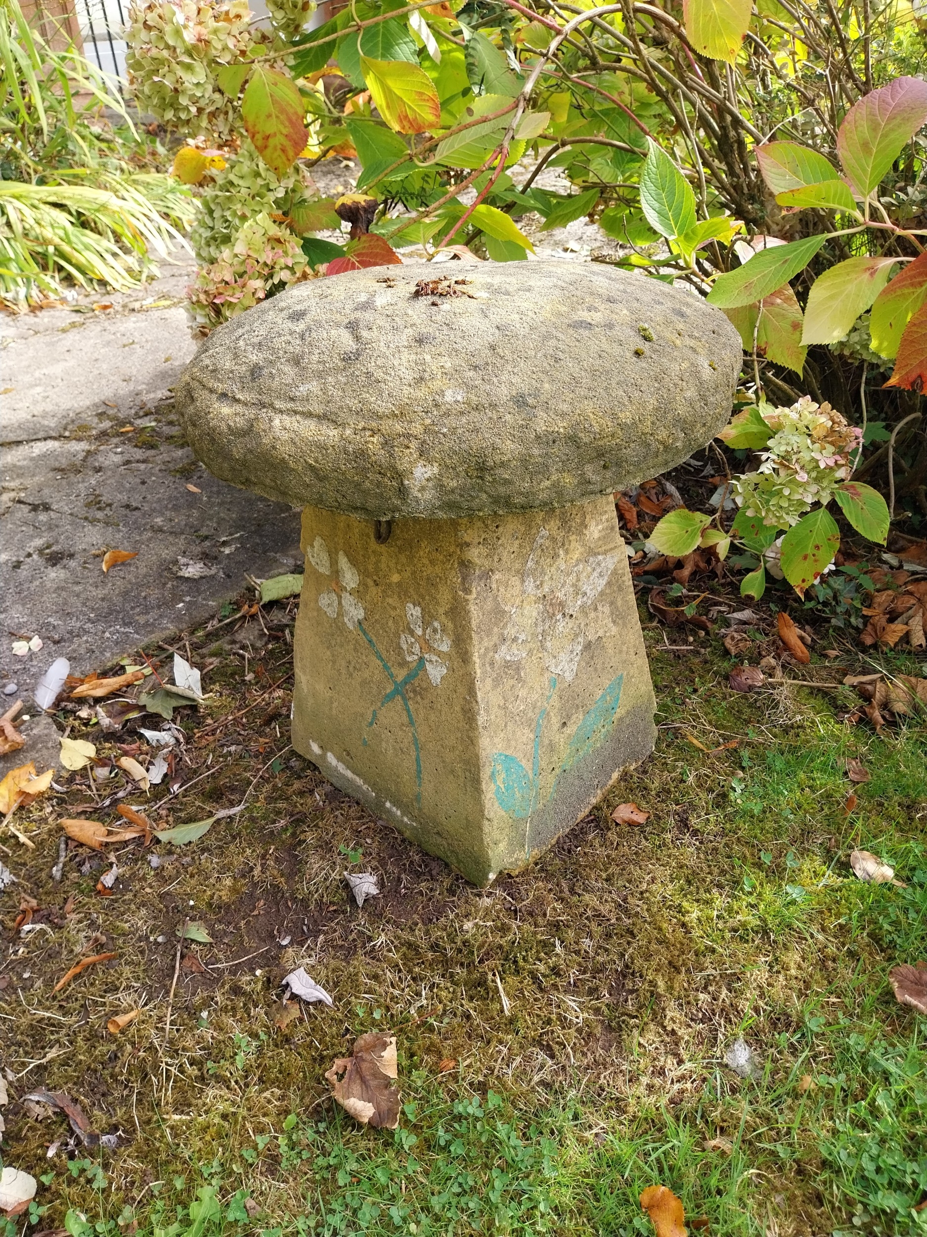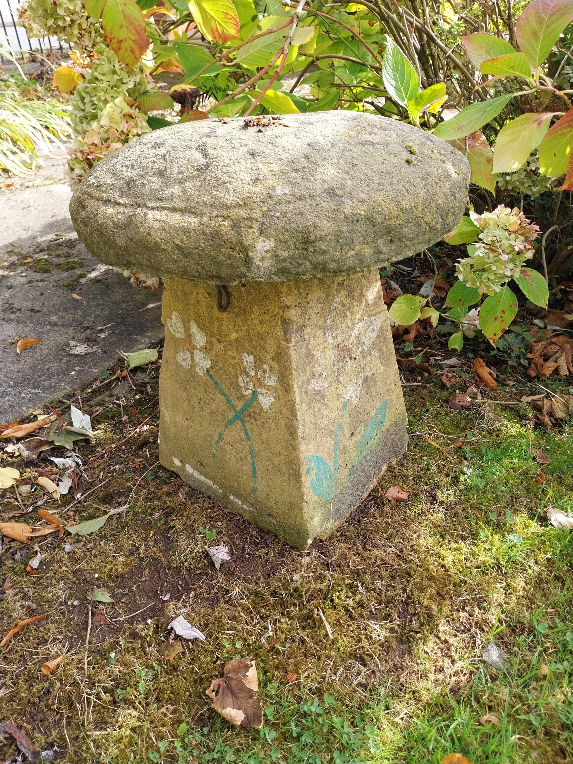 19th. C. sandstone staddle stone. { 50cm H X 47cm Dia. }.