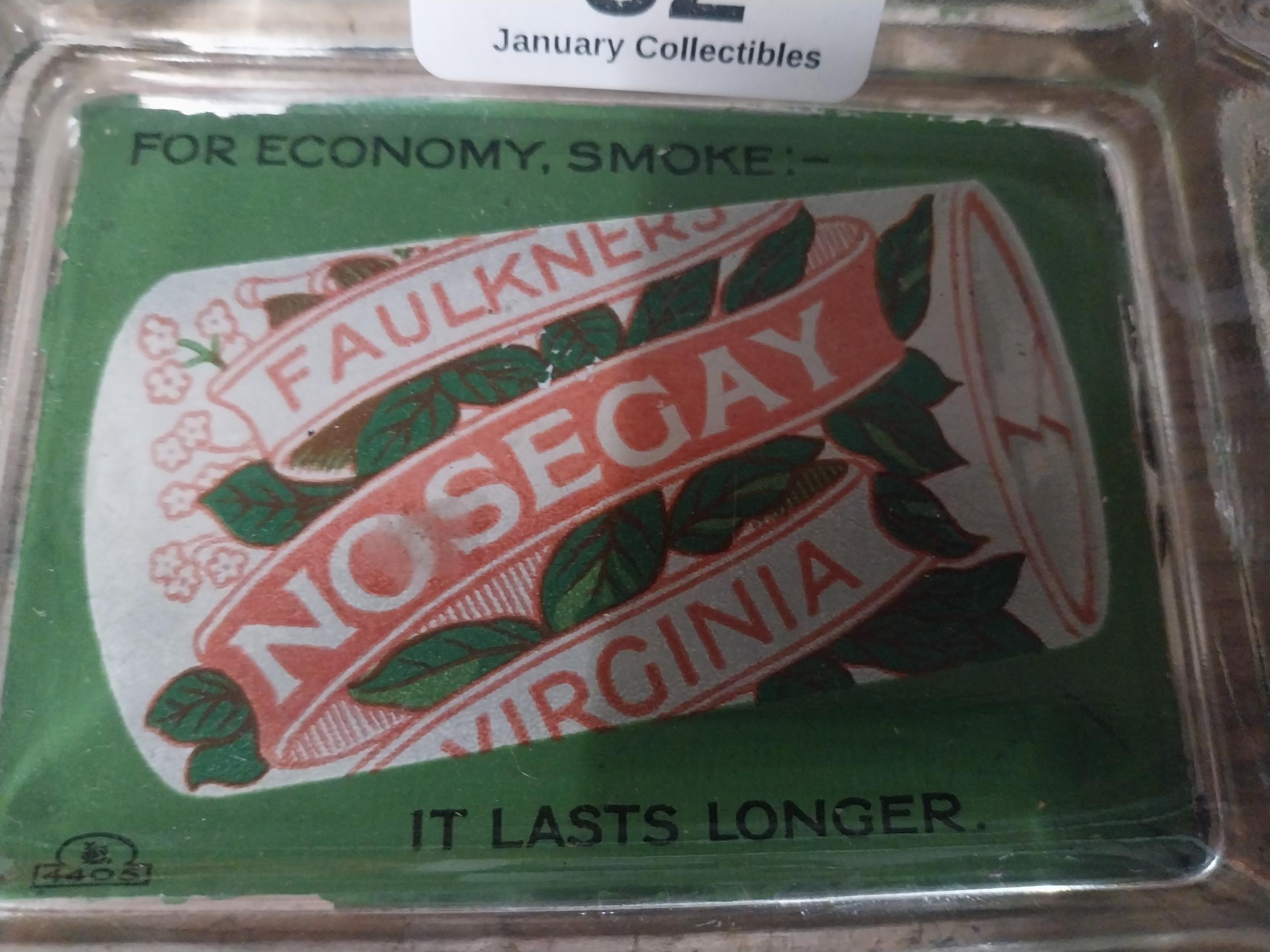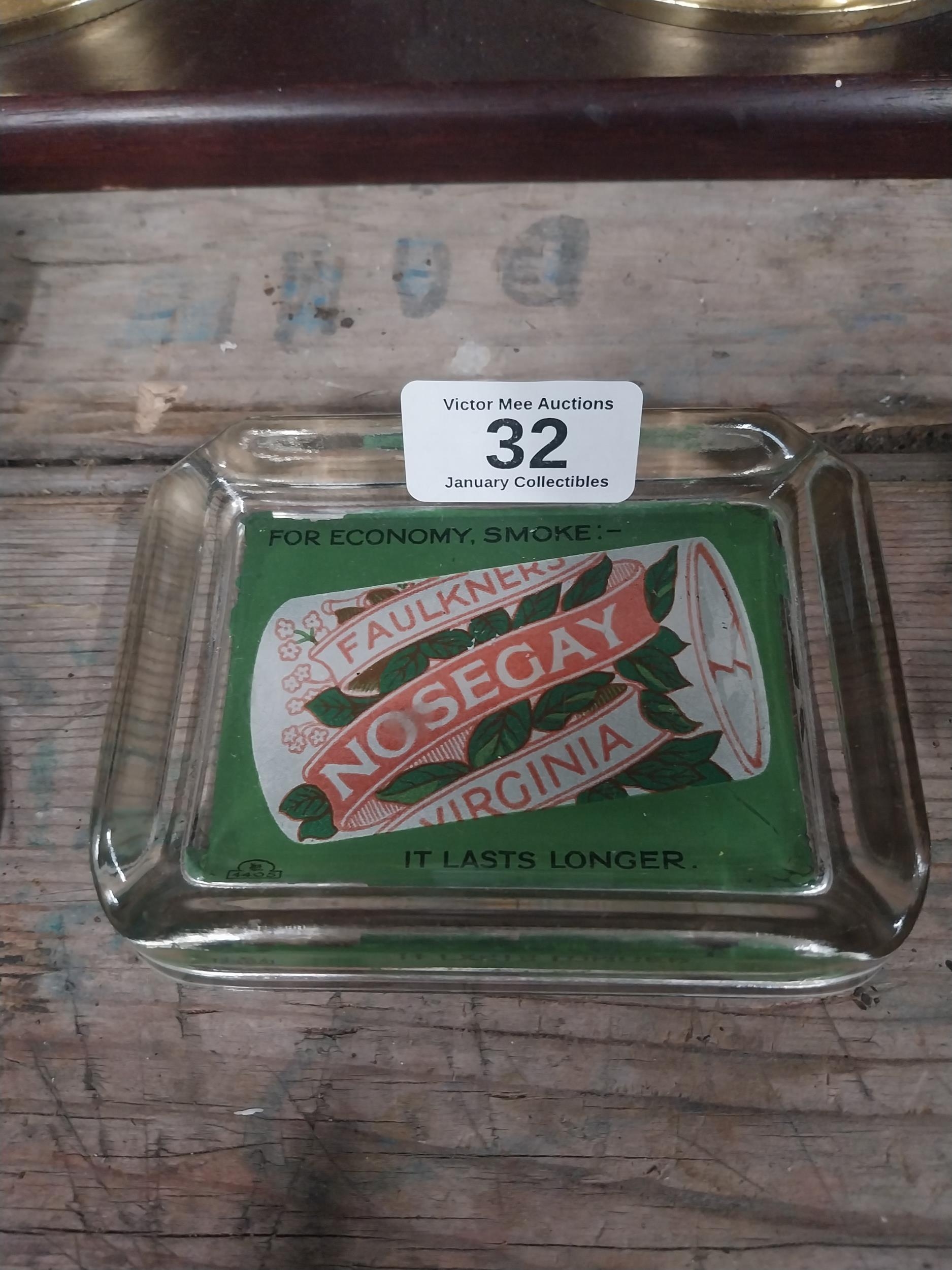 For Economy Smoke - Faulkner's Nosegay Virginia - It Lasts Longer glass advertising ashtray. { 12cm W X 9cm D }.