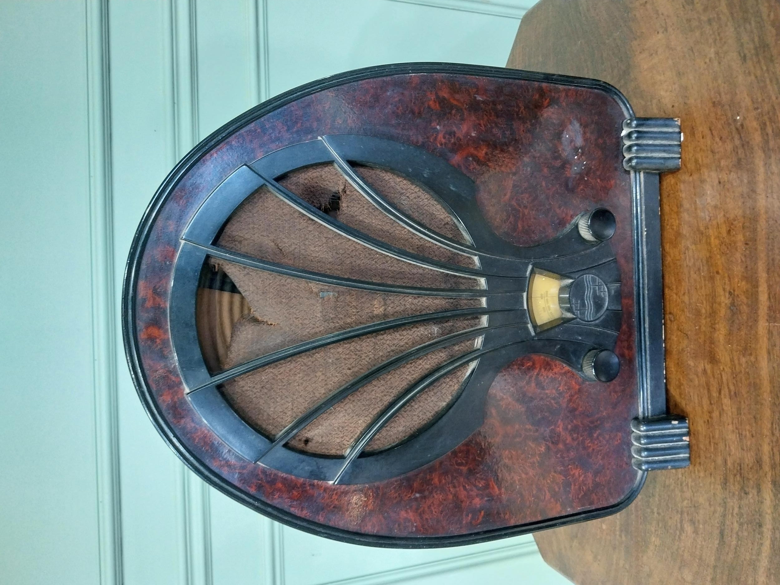1930's bakelite radio, in the Art Deco manner. { 50cm H X 41cm W X 22cm D }.