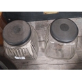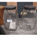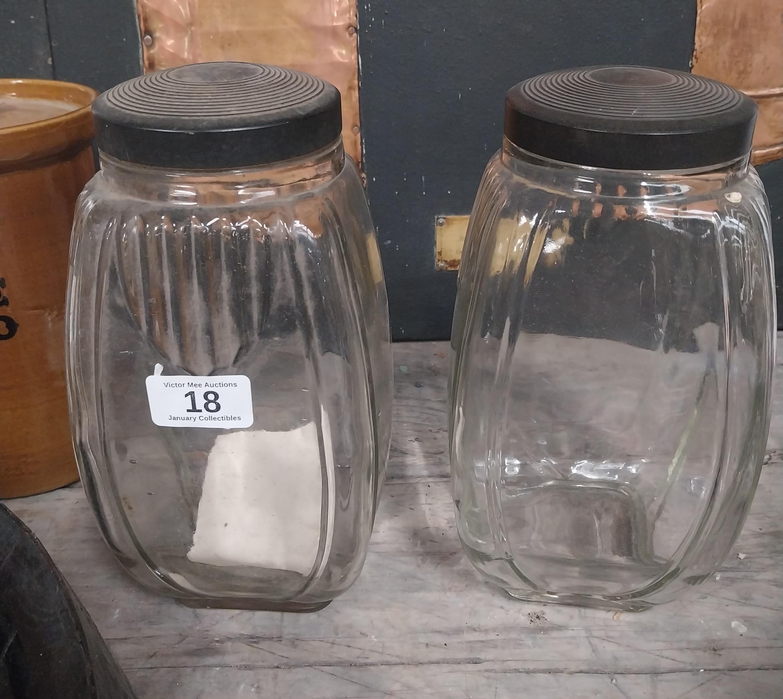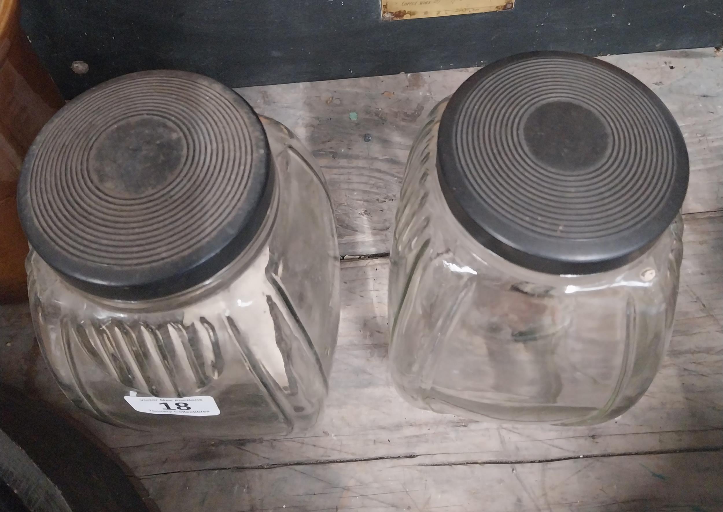 Two 1950's glass sweet jars with bakelite lids. {24 cm H x 12 cm W x 12 cm D}.