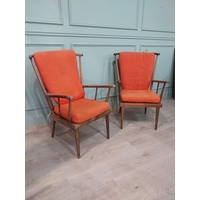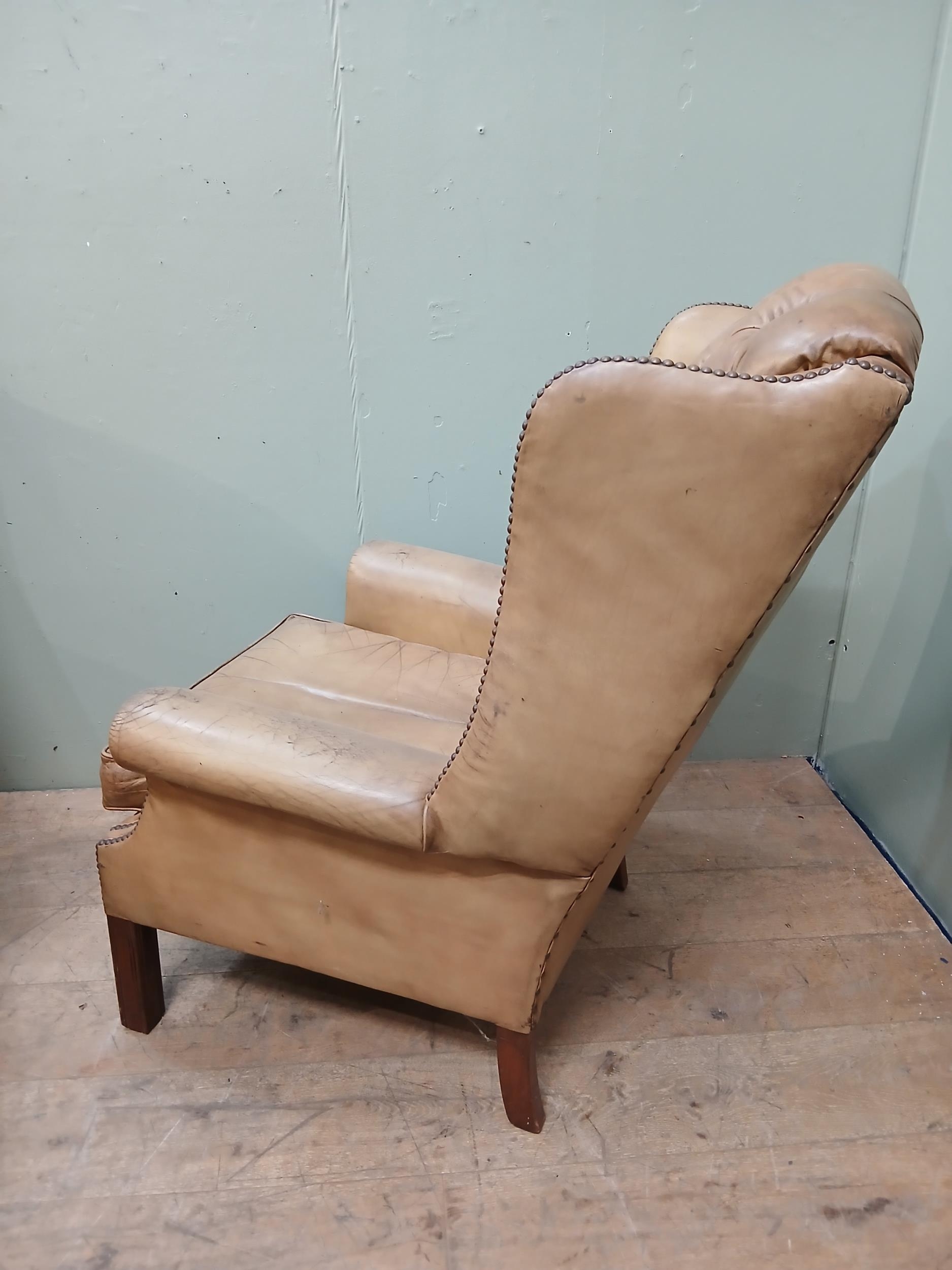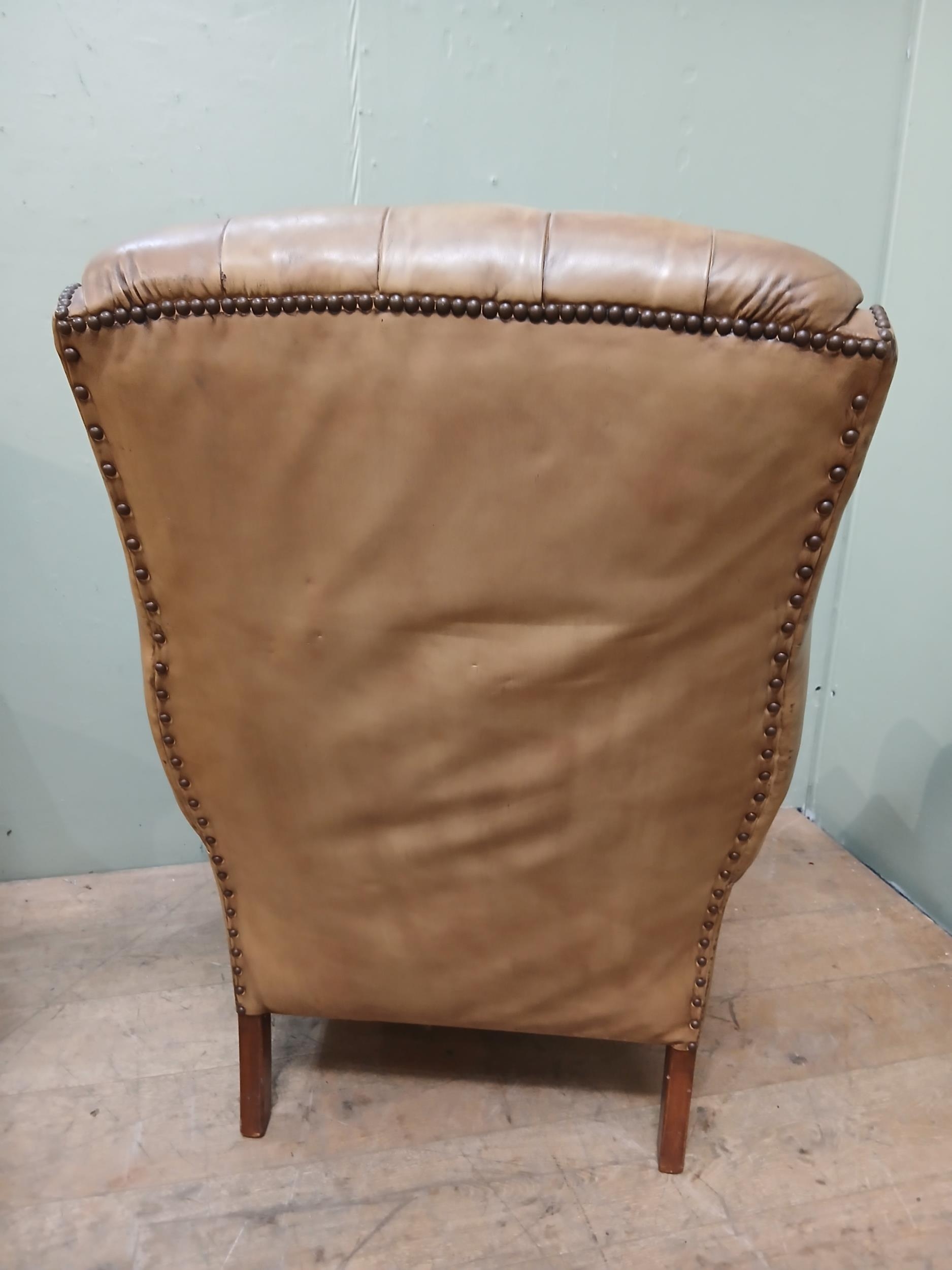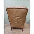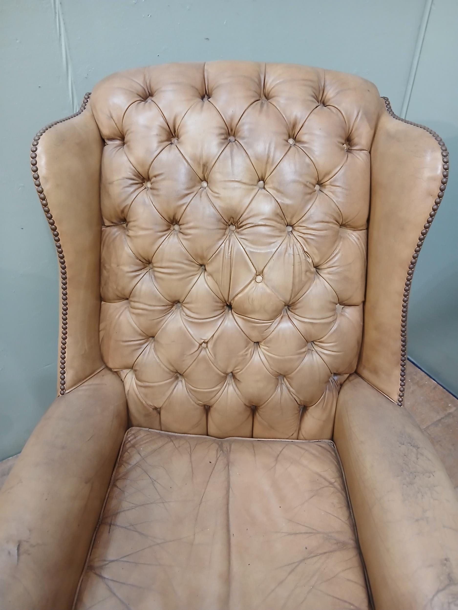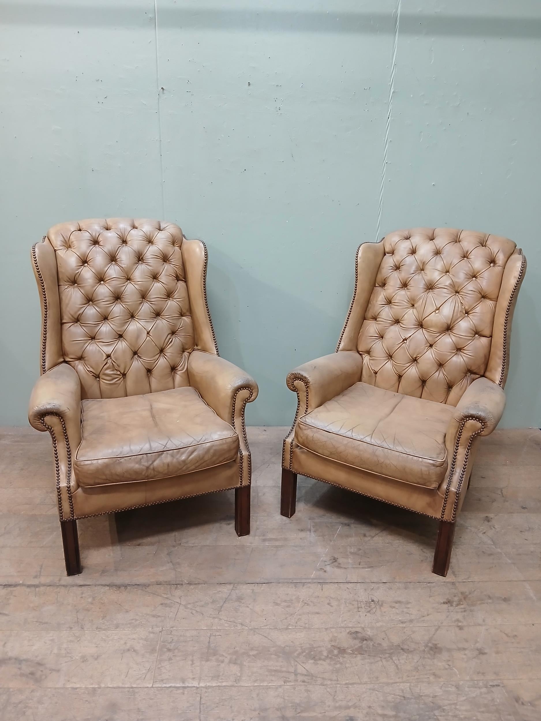 Pair of deep buttoned wing back armchairs on square legs. {H 105cm x W 75cm x D 75cm } NOT AVAILABLE TO VIEW IN PERSON