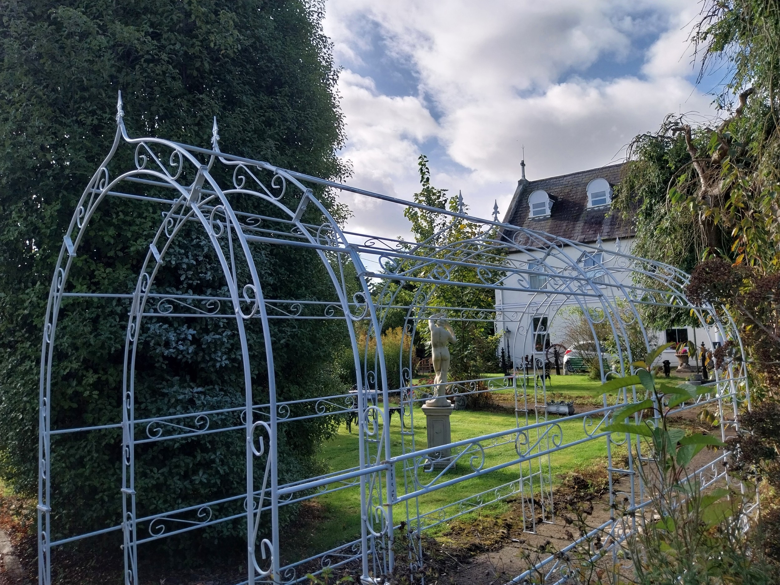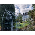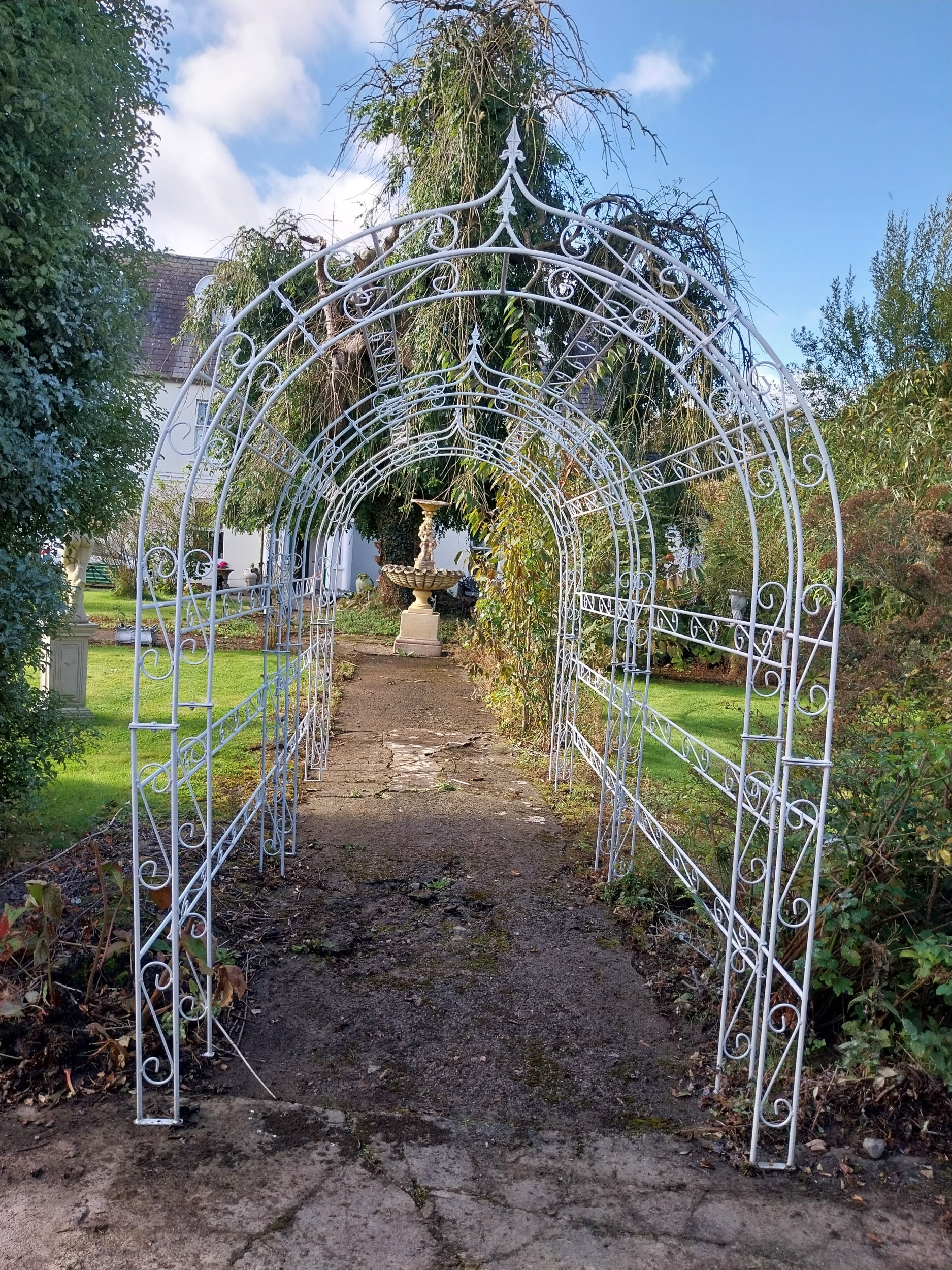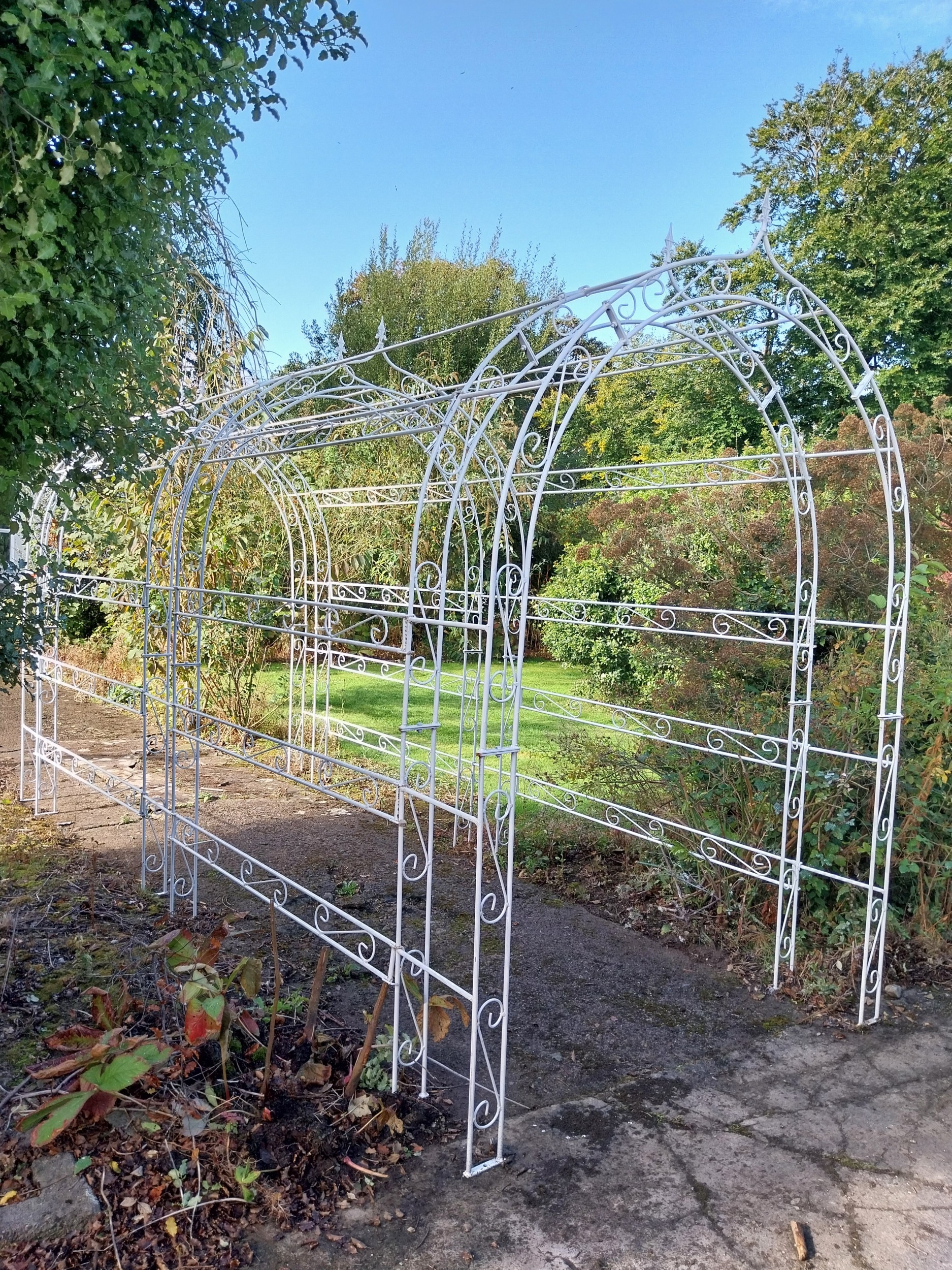 Good quality wrought iron three arch rose walk. { 238cm H X 403cm L X 169cm W }.