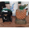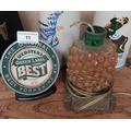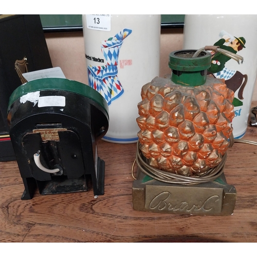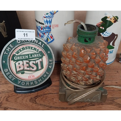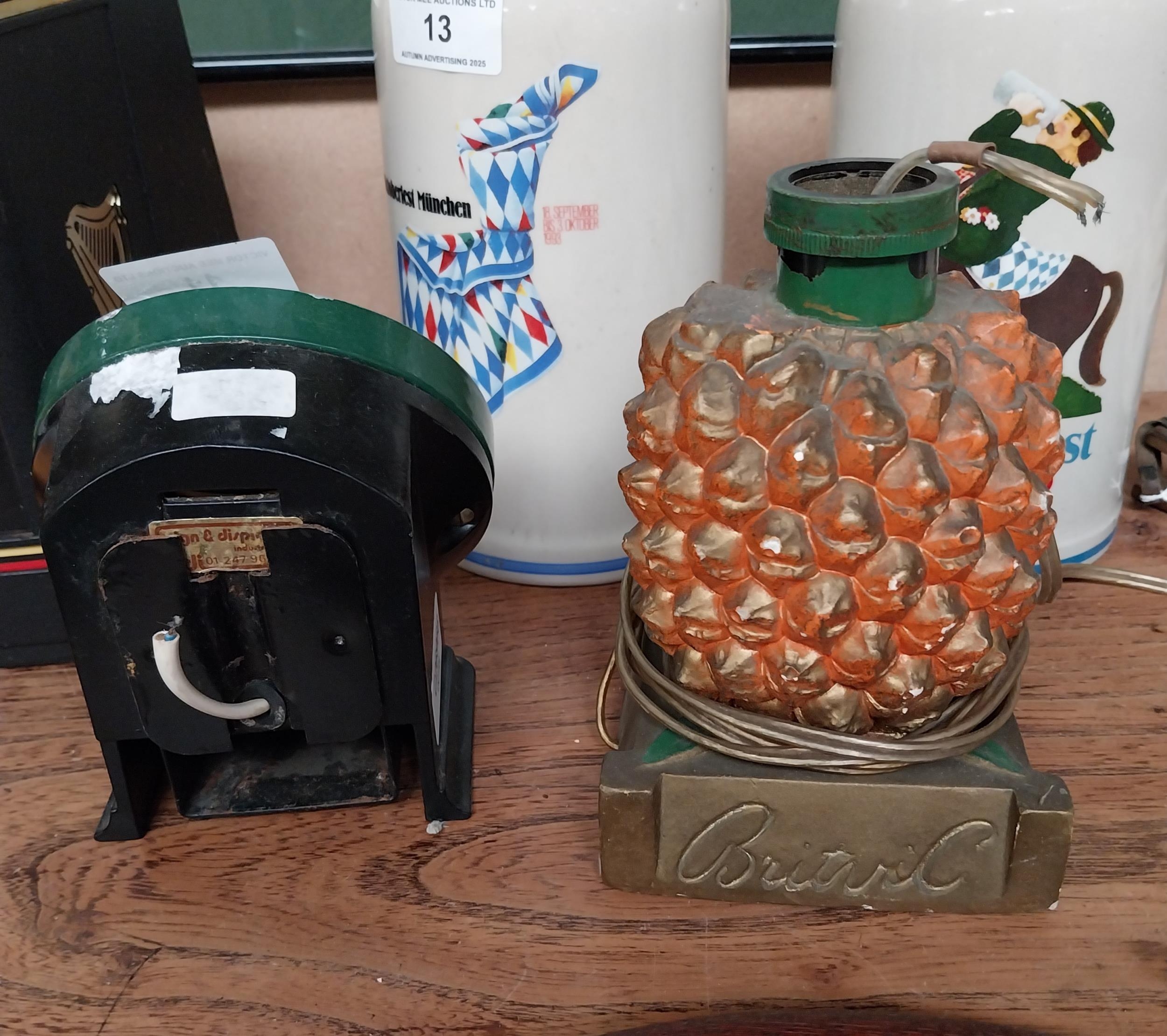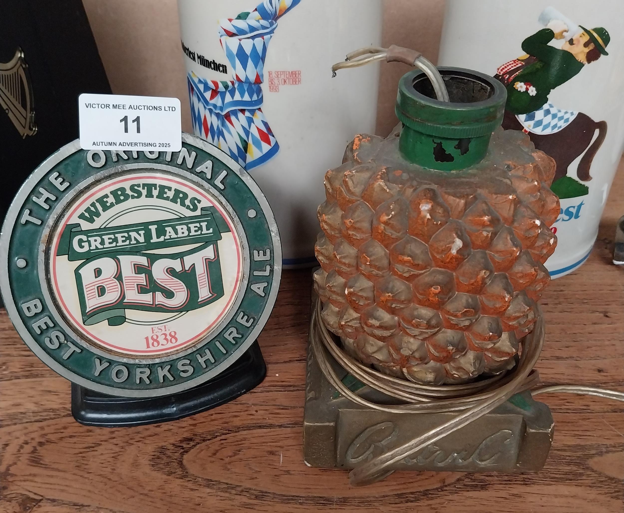 Websters Green Label Best counter font. {13 cm H x 11 cm W x 9 cm D} and 1960's Britvic Orange lamp in the form of a Pineapple. {19 cm H x 10 cm W x 10 cm D}.