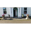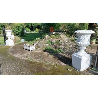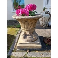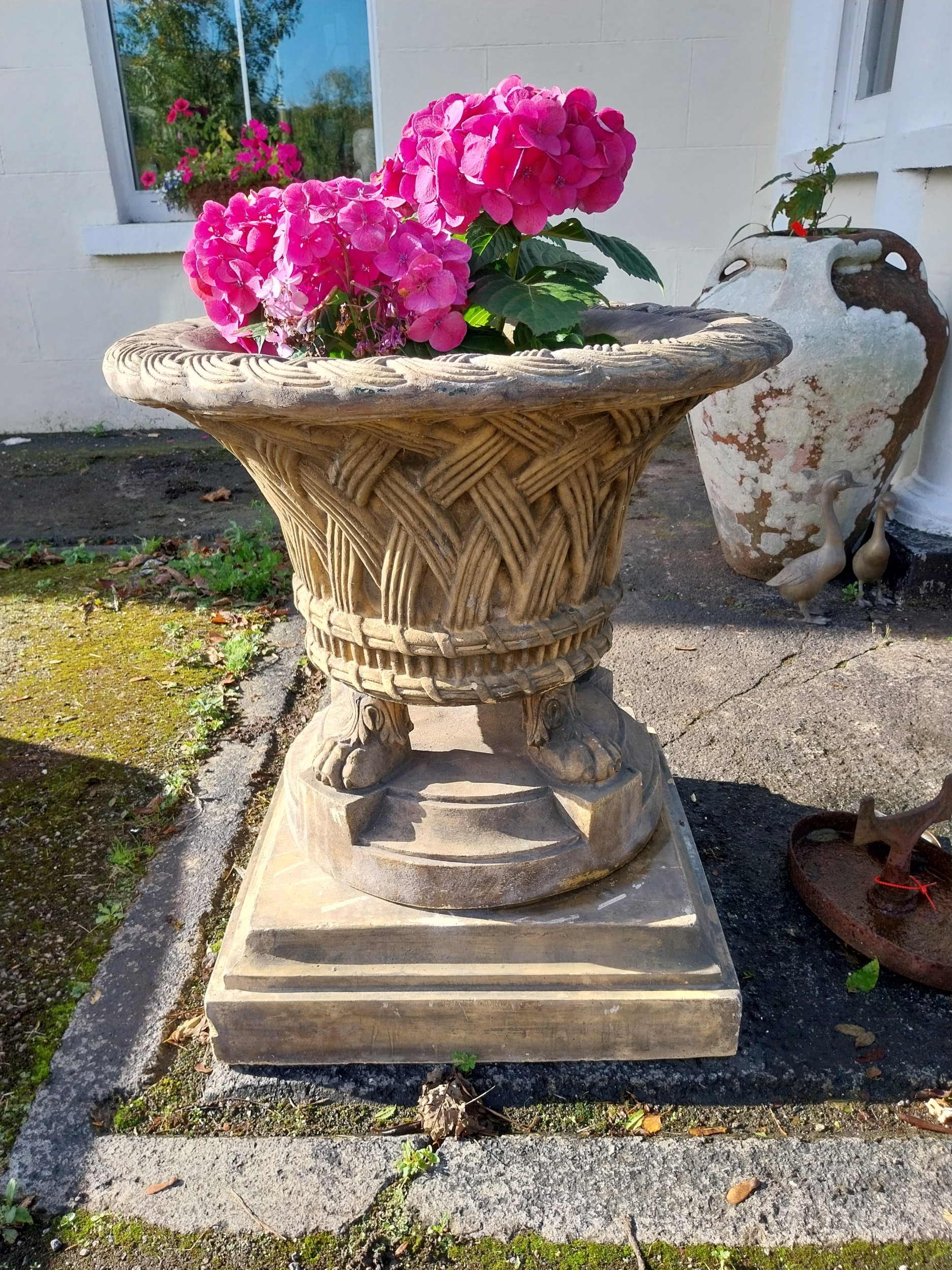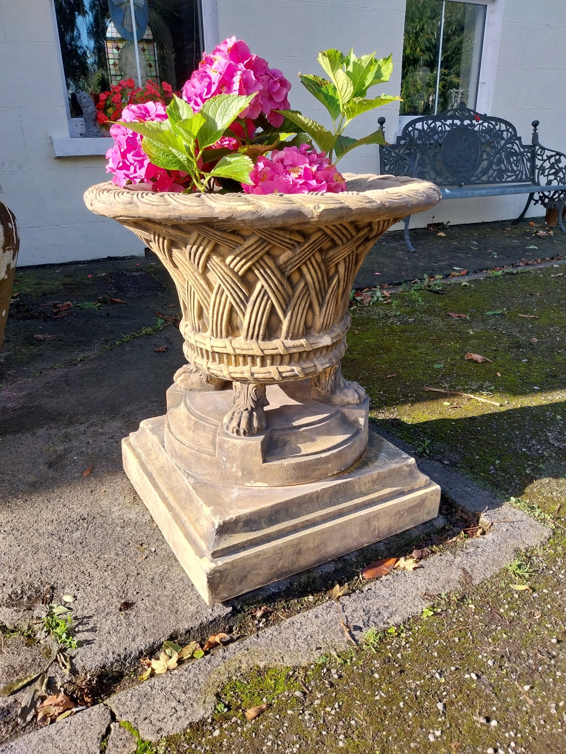 Pair of good quality moulded terracotta lattice design urns, raised on platform bases and lion's paw feet. { 77cm H X 68cm Dia }.