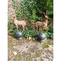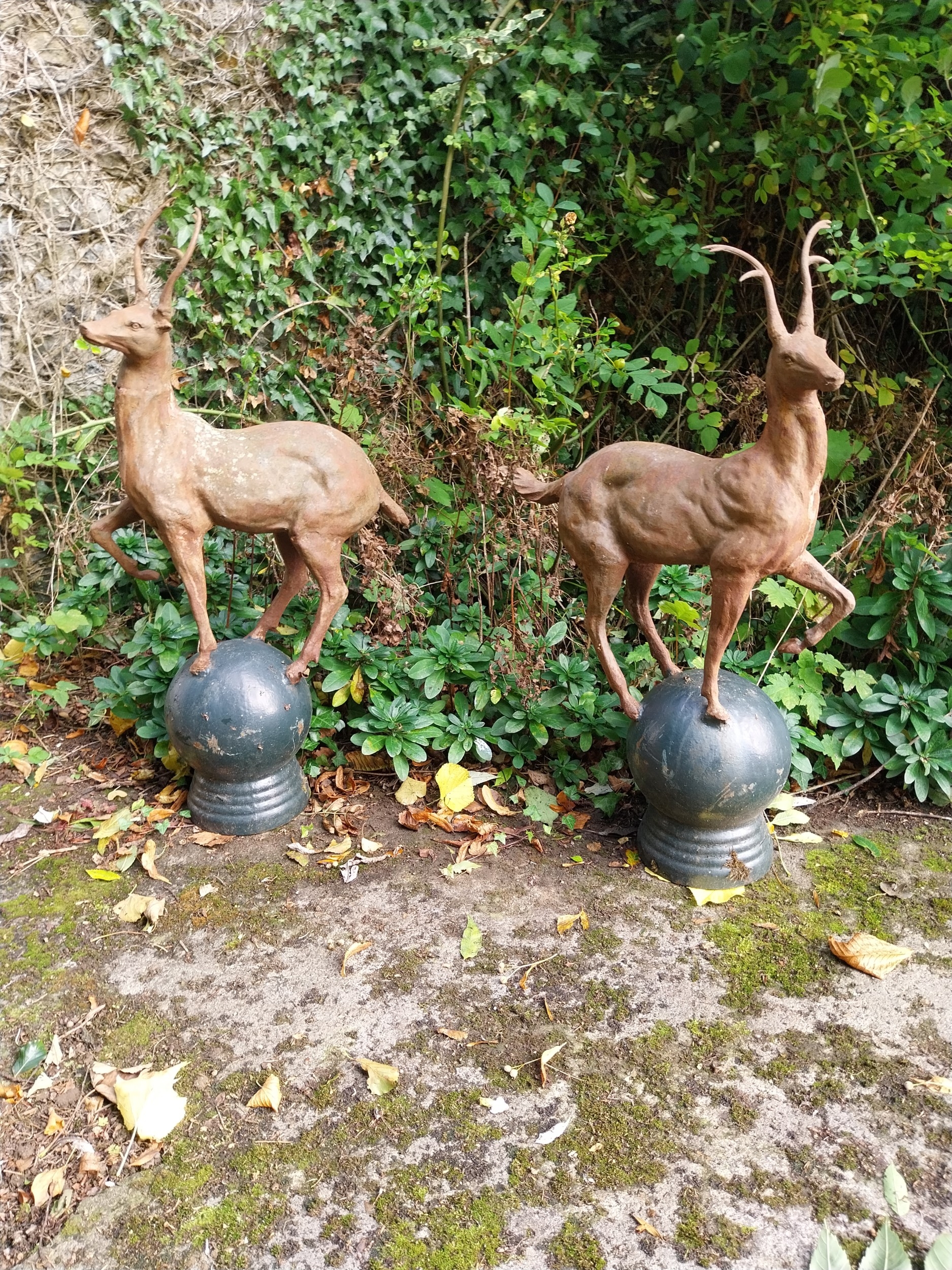 Pair of cast iron models of Stags, mounted on balls. { 90cm H X 57cm W X 25cm D }.