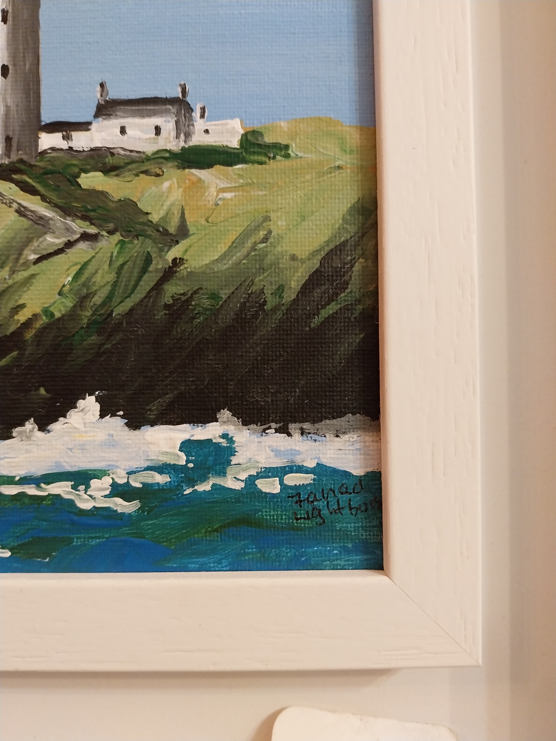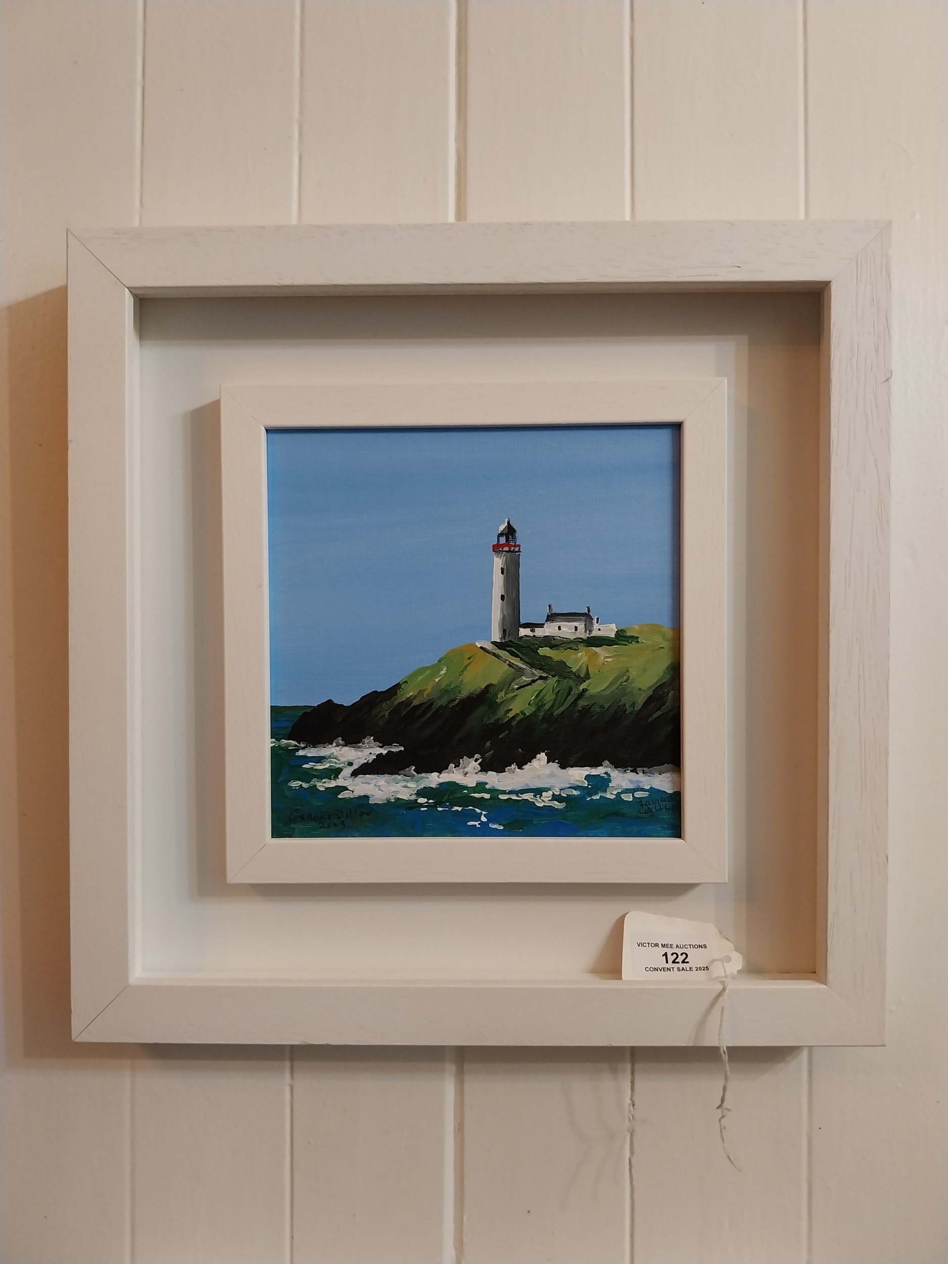 Gerard Dillon The Dingle Light House, Oil on Board, signed, mounted in a painted frame. { 19cm H X 19cm W }.
