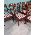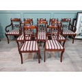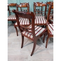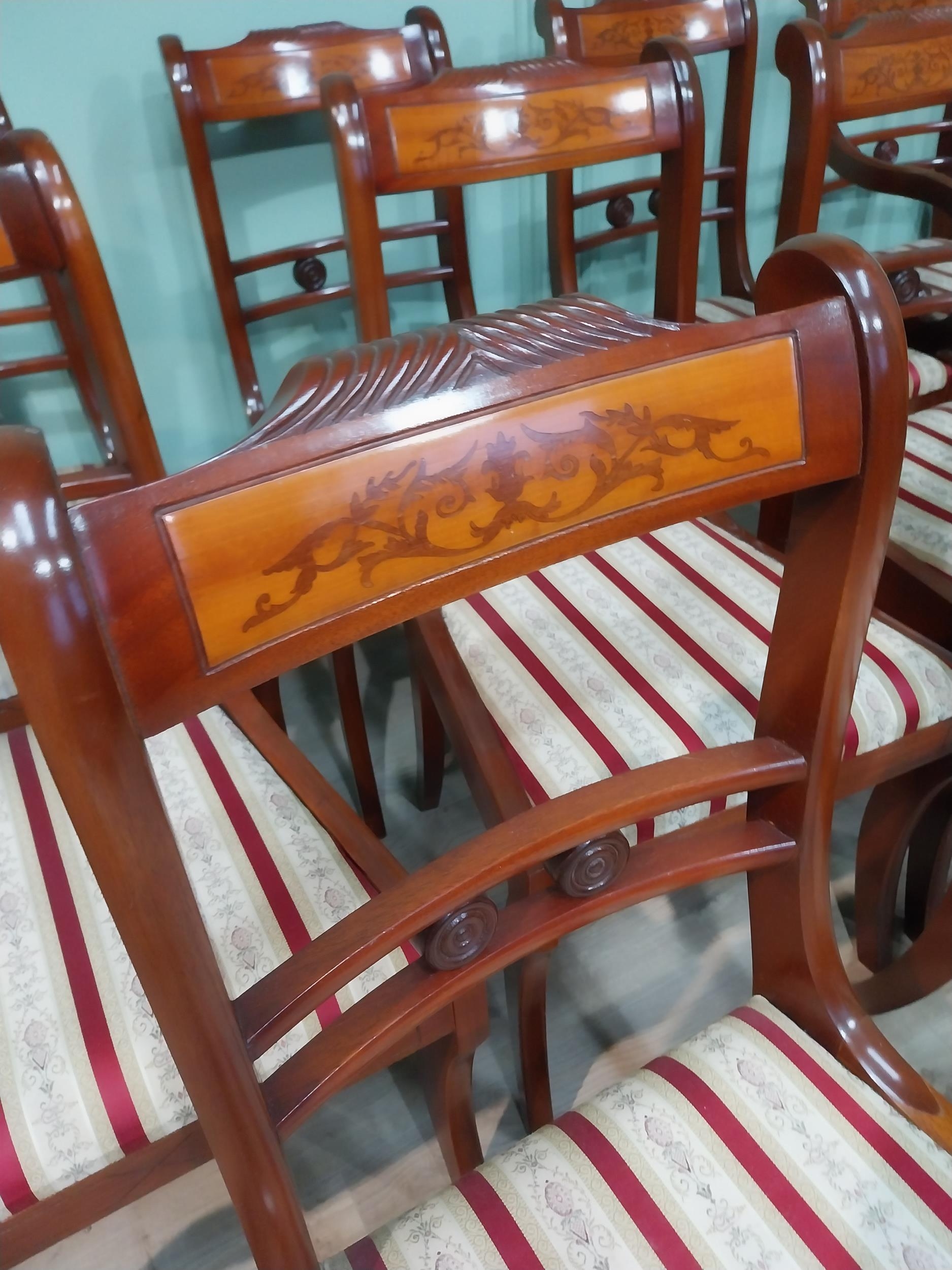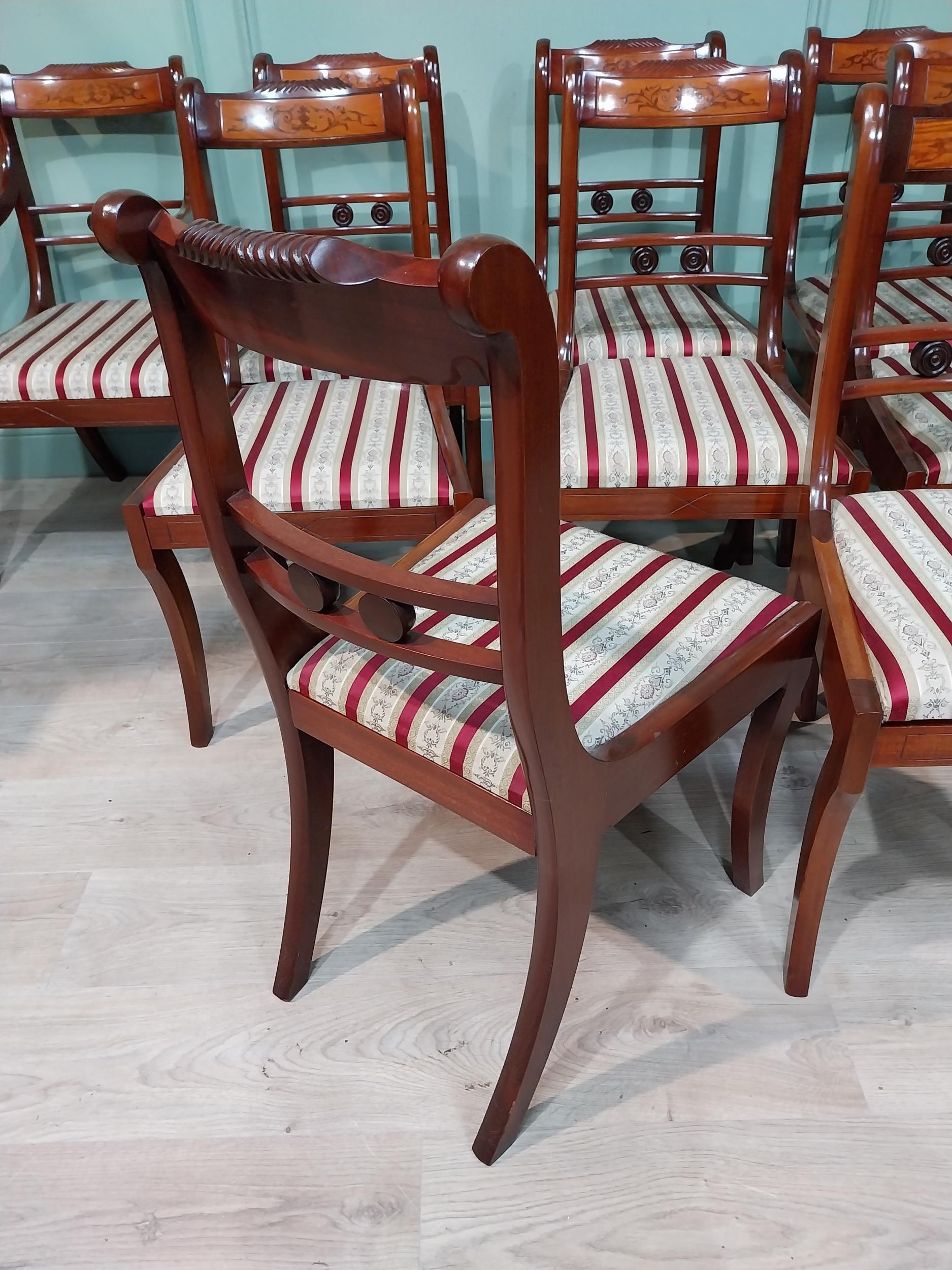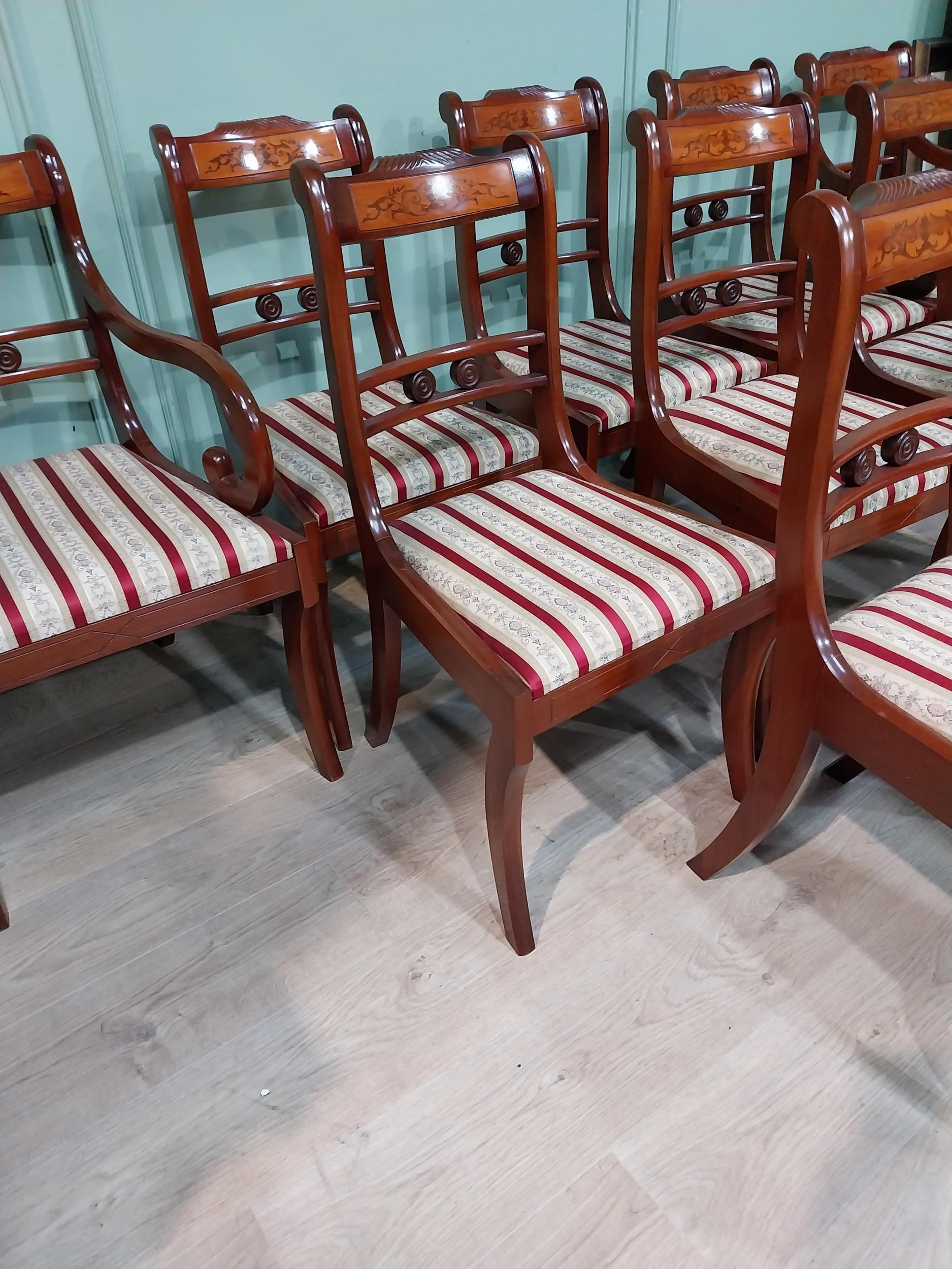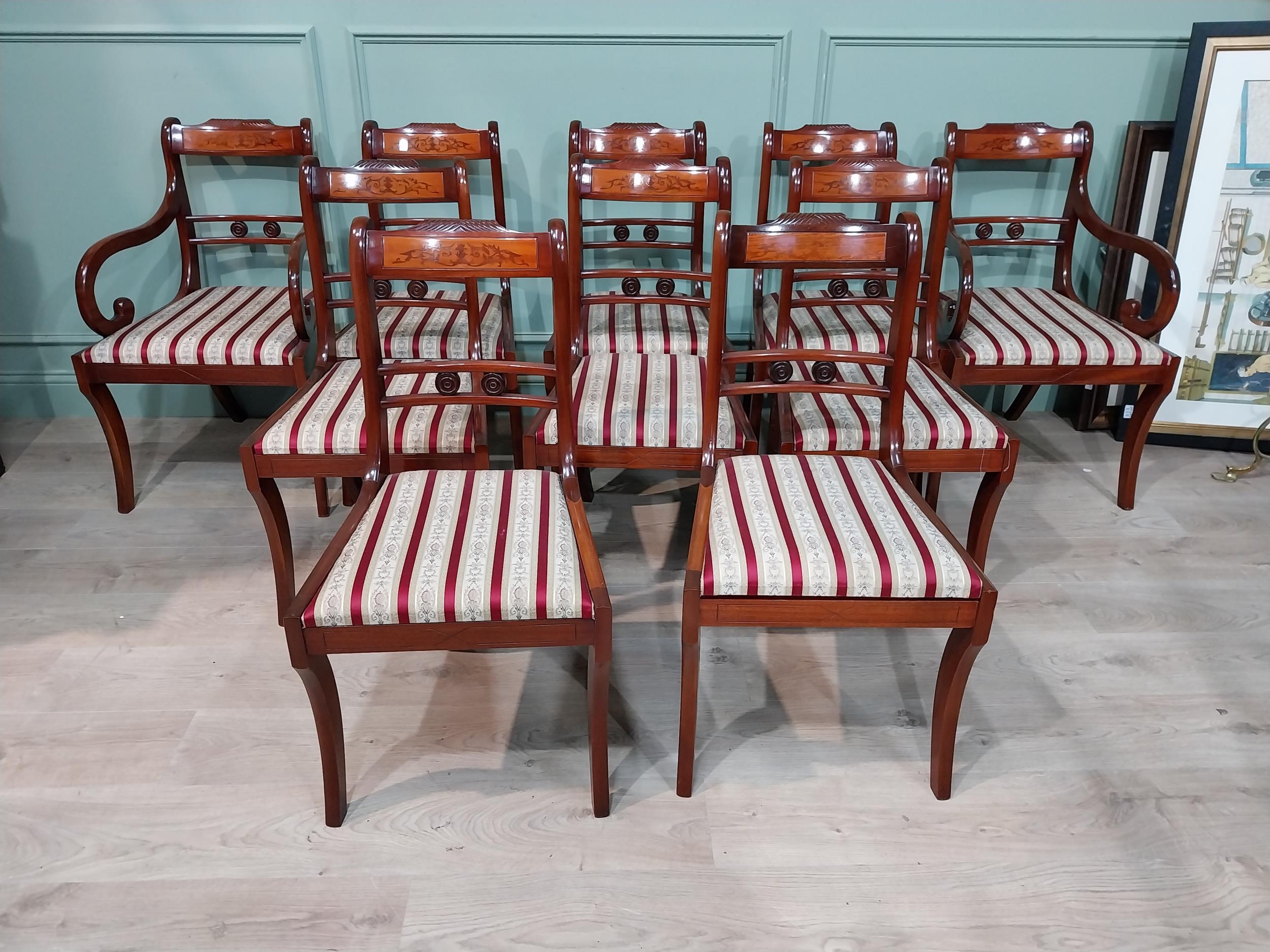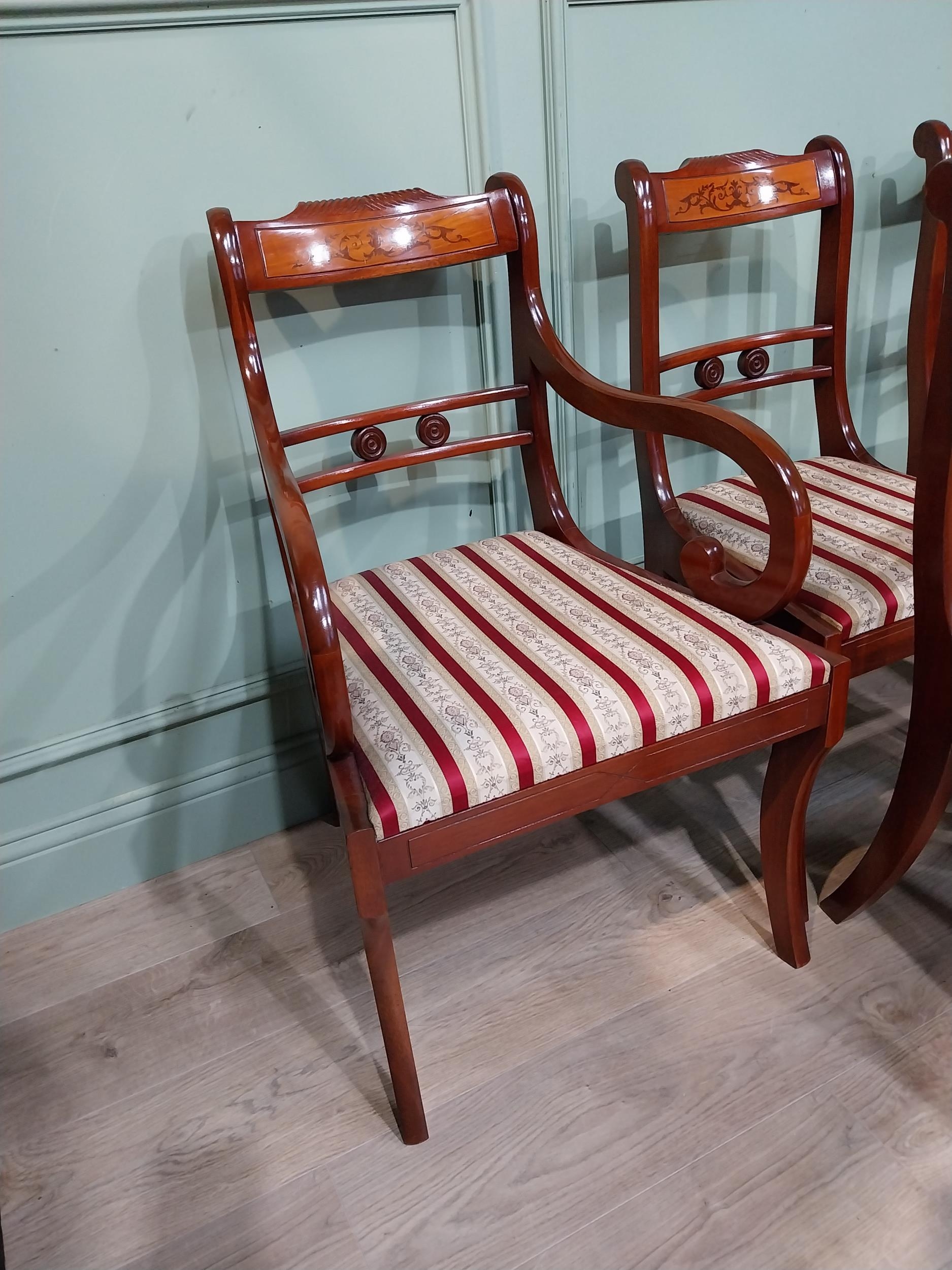 Set of eight mahogany and satinwood upholstered chairs plus two armchairs made by the Robinson Brothers of Milltown, Co Cavan. {88 cm H x 53 cm W x 54 cm D} and {88 cm H x 47 cm W x 46 cm D}.
