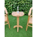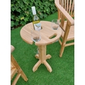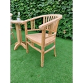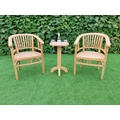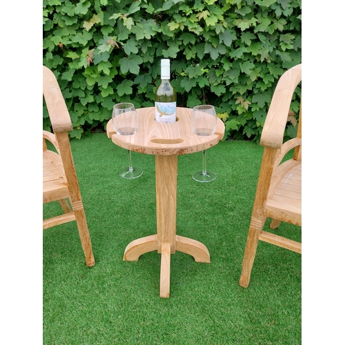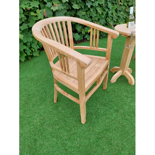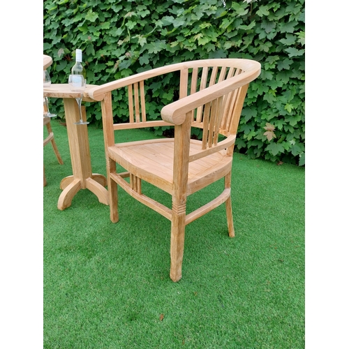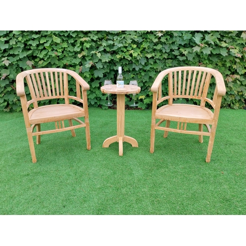 Pair of good quality teak garden armchairs and teak wine table. Chairs {85 cm H x 40 cm W x 44 cm D} and Table {70 cm H x 74 cm Dia.}.