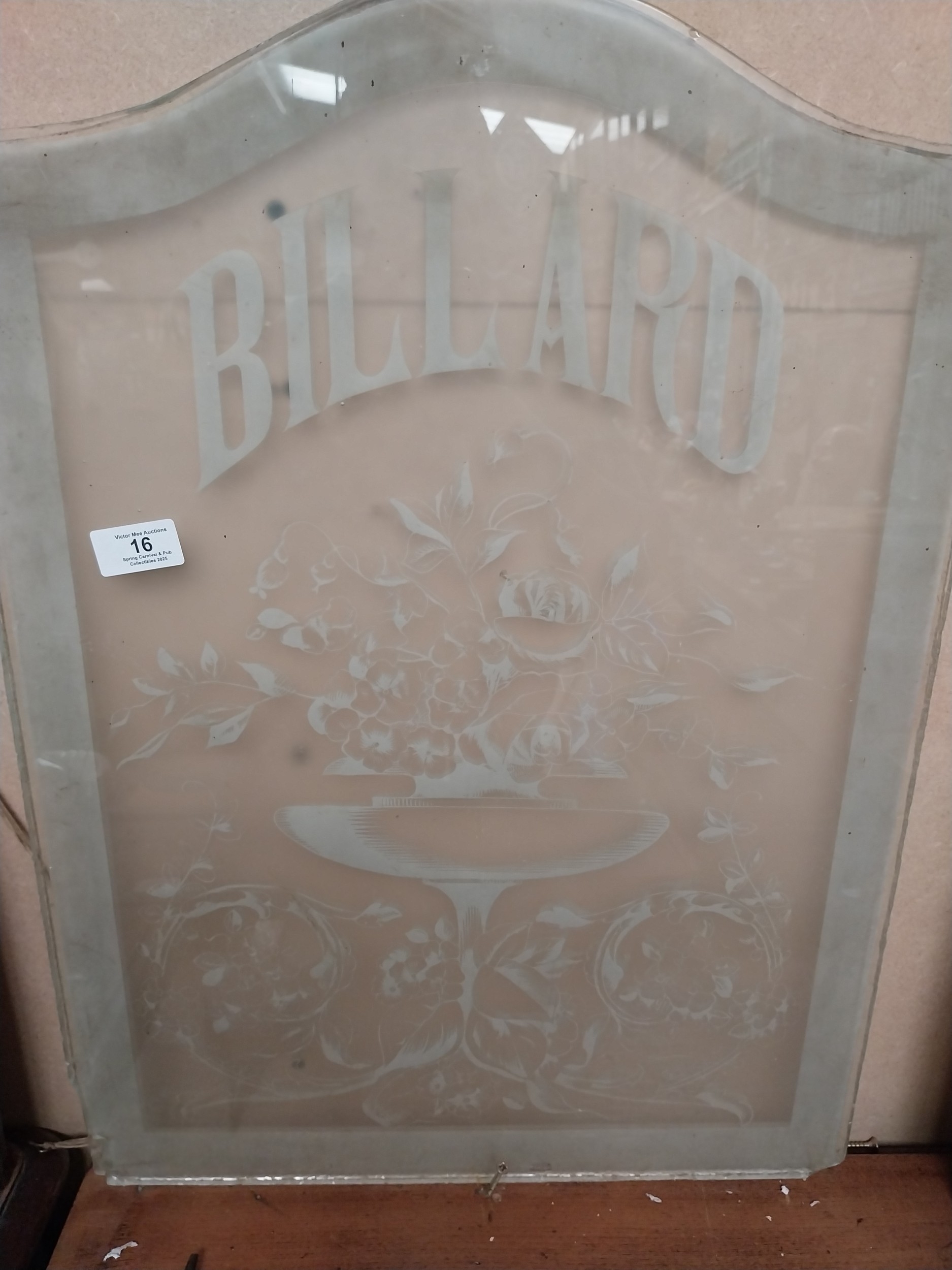 Pair of early 20th C. etched glass Billard panels {60 cm H x 44 cm W}.