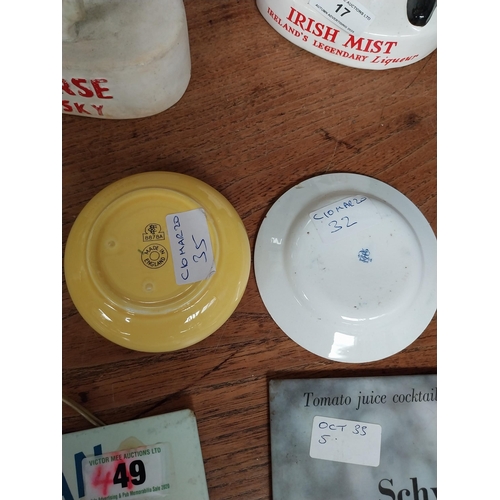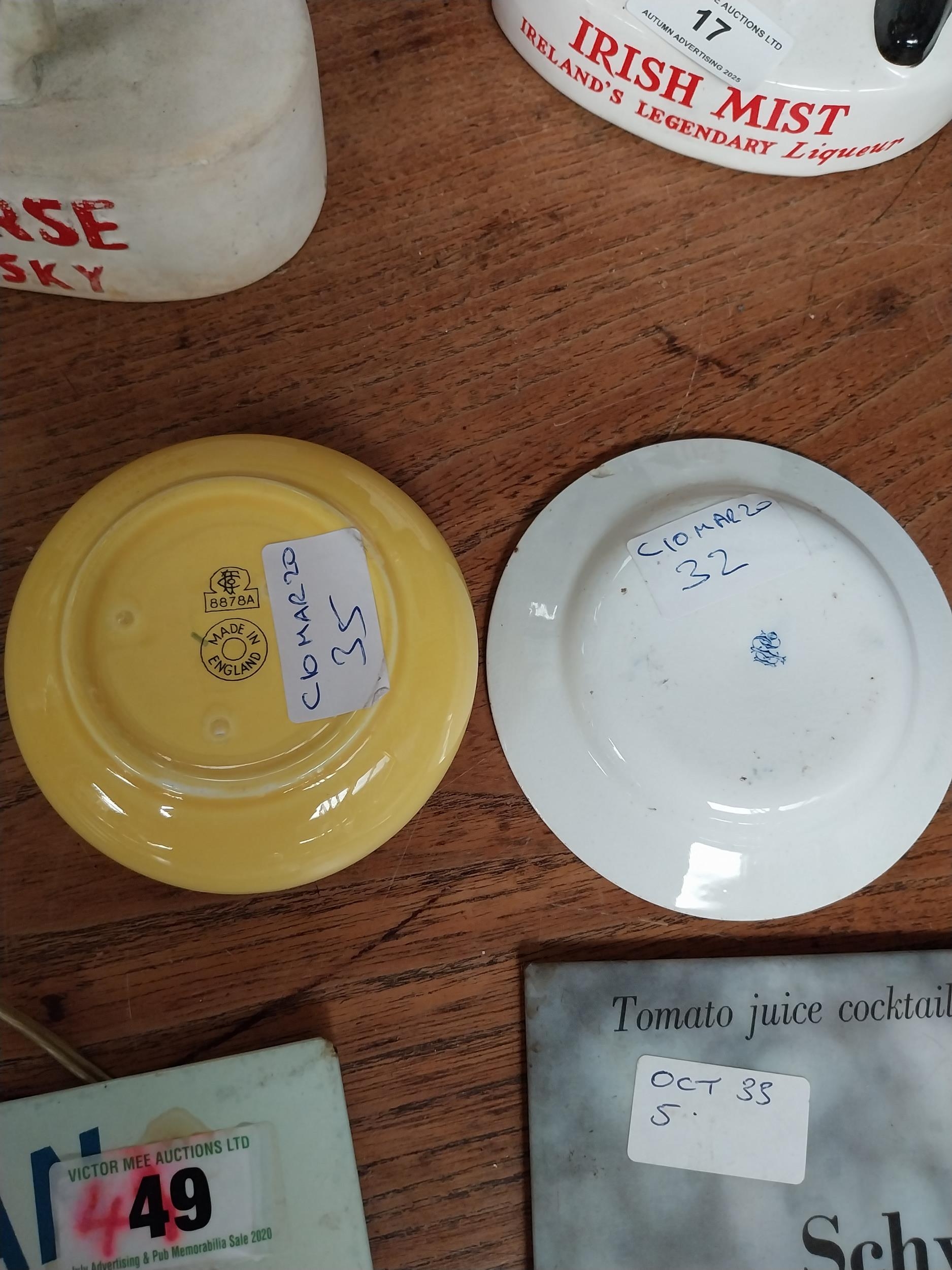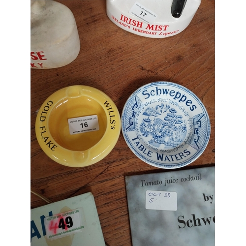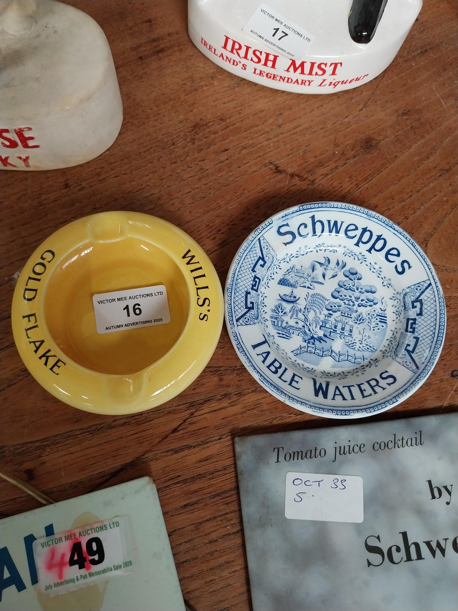 Wills's Gold Flake and Schweppes ceramic advertising ashtray. {3 cm H x 10 cm Dia.} and {2 cm H x 12 cm Dia.}.