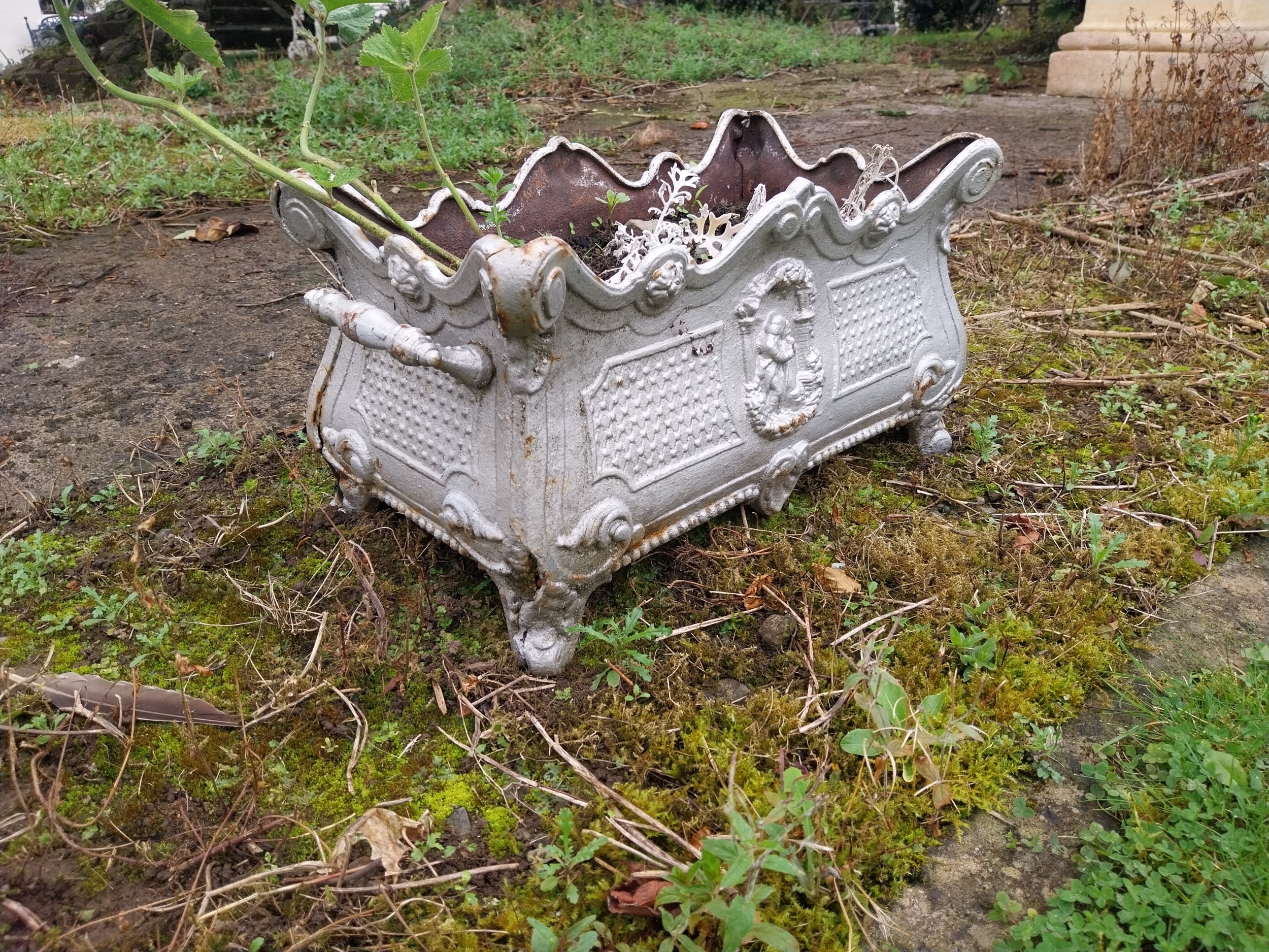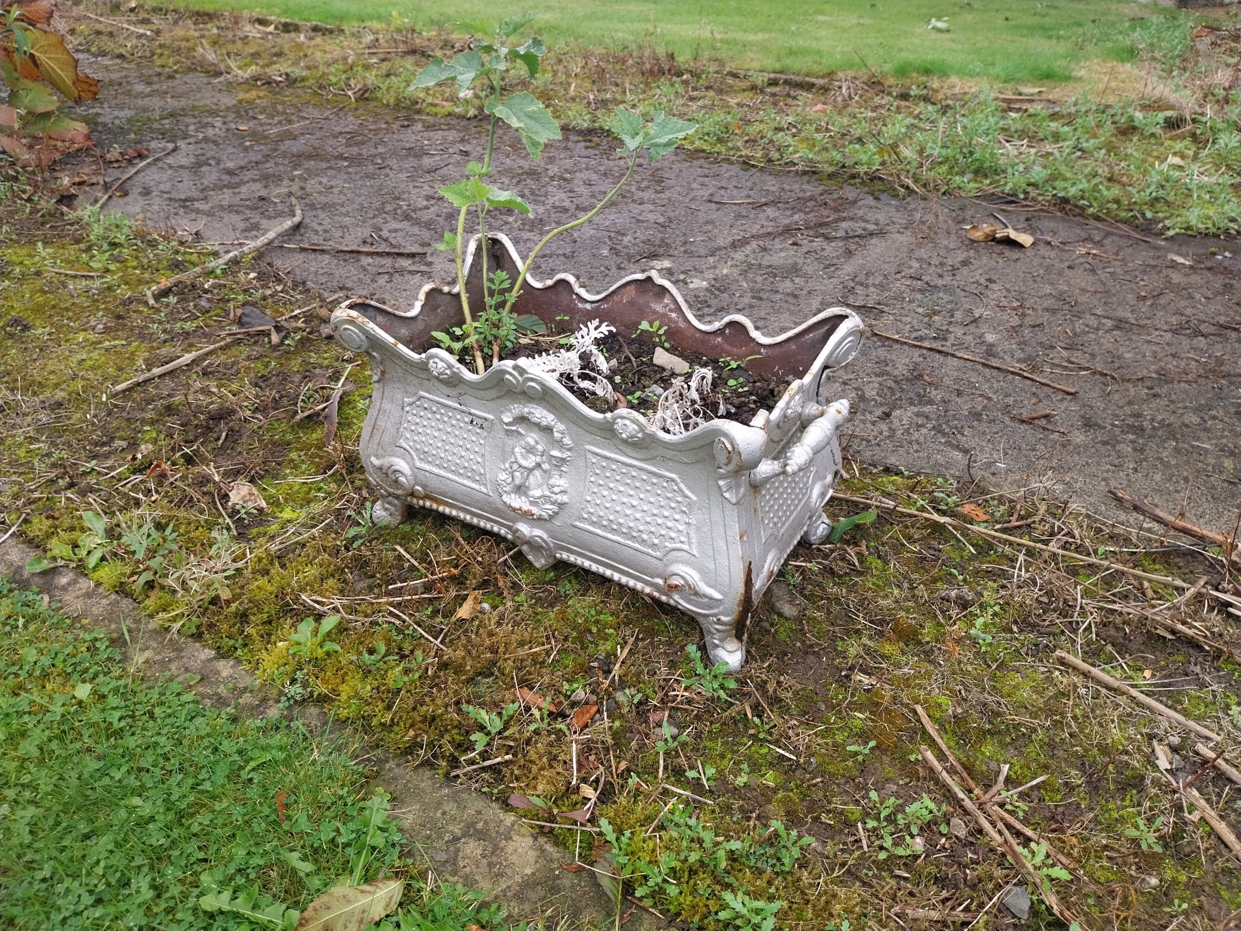 19th. C. cast iron planter. { 27cm H X 55cm W X 30cm D }.