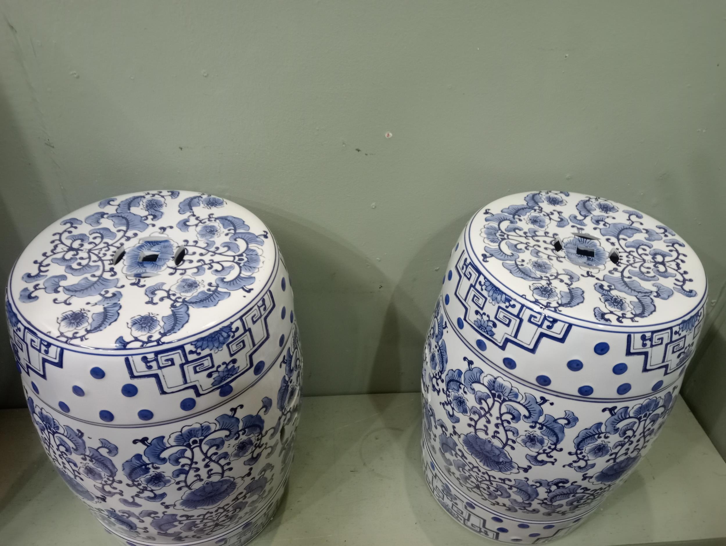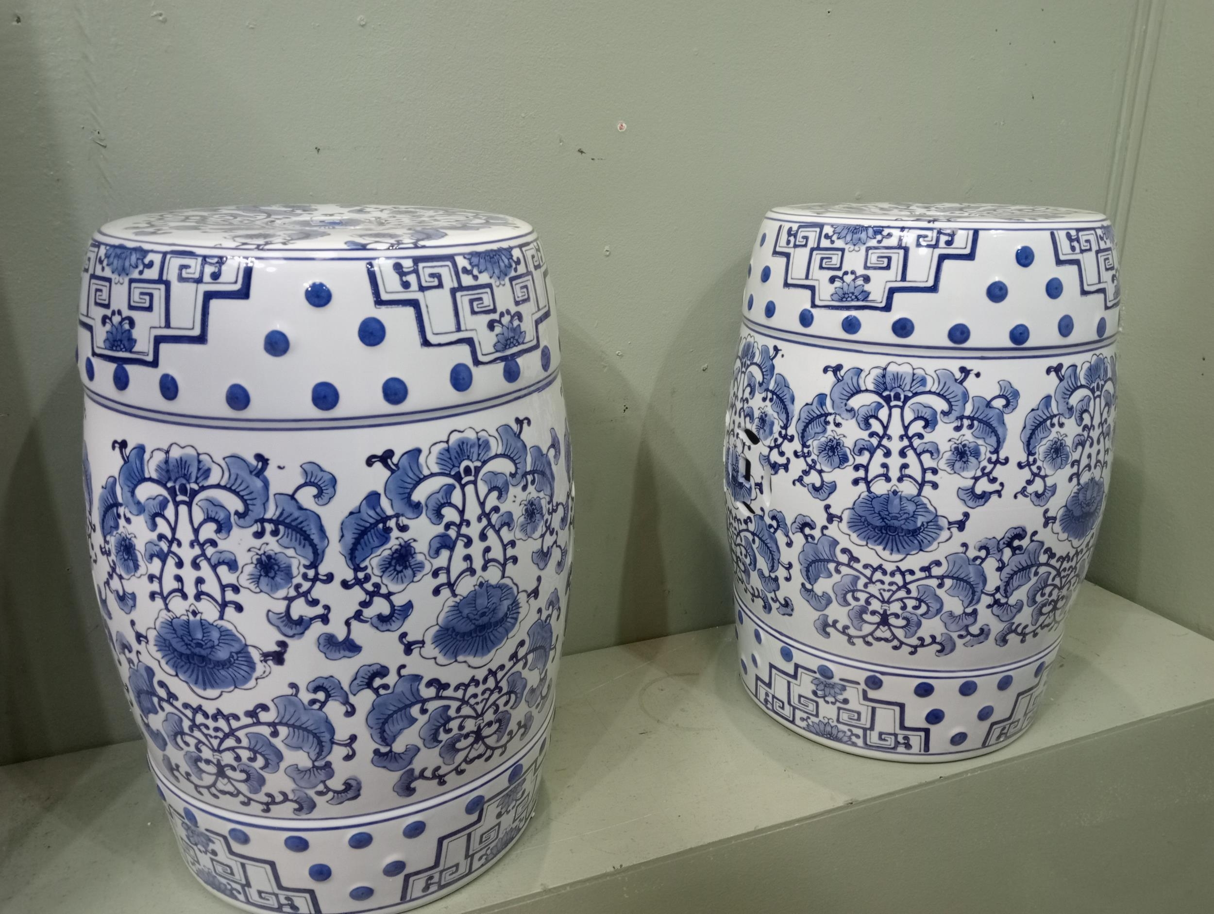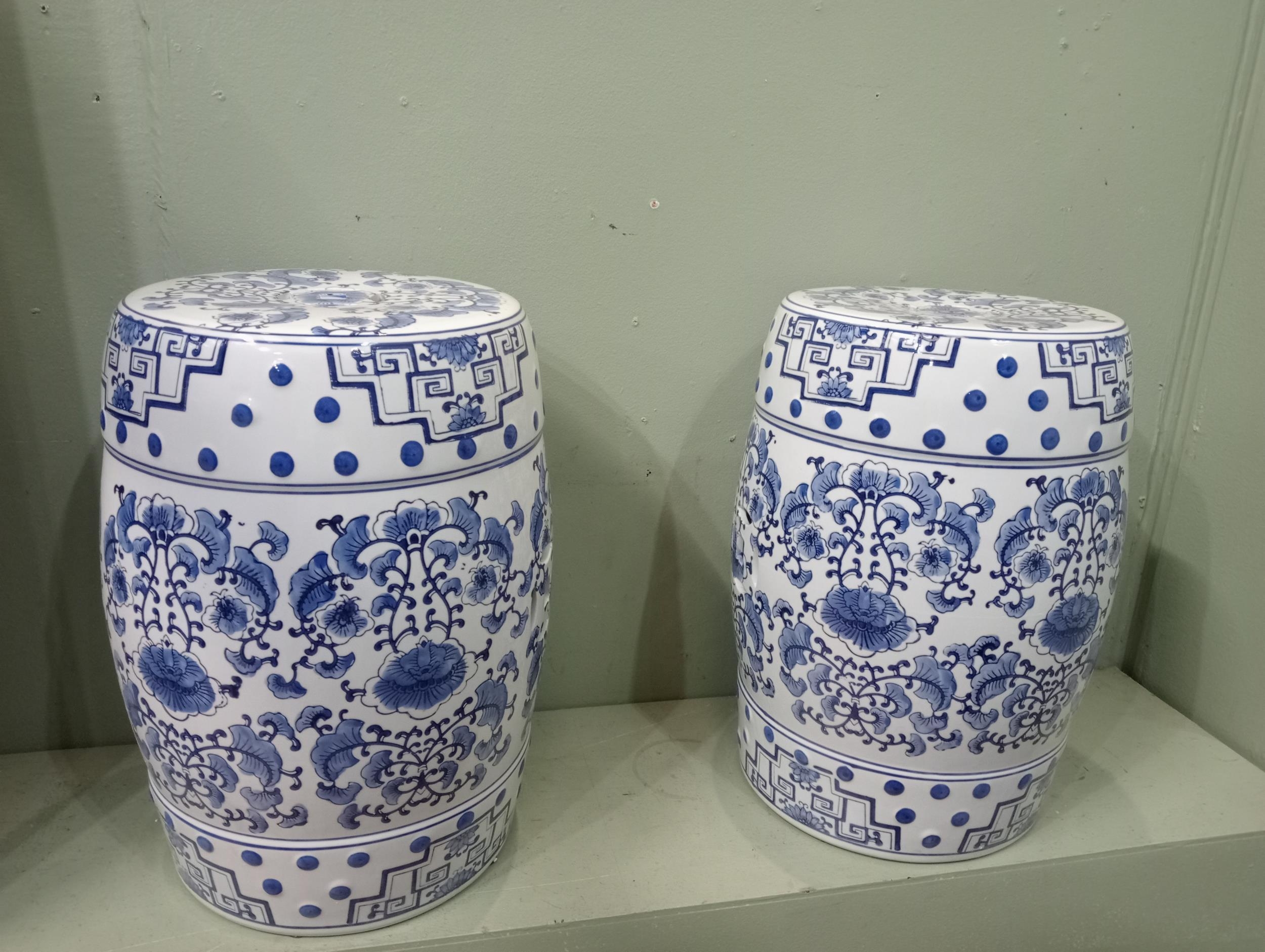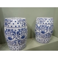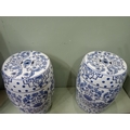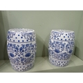 Pair of ceramic blue and white garden stools. {H 46cm x Dia 30cm } NOT AVAILABLE TO VIEW IN PERSON