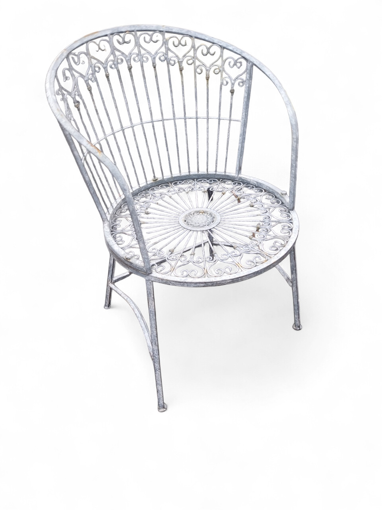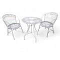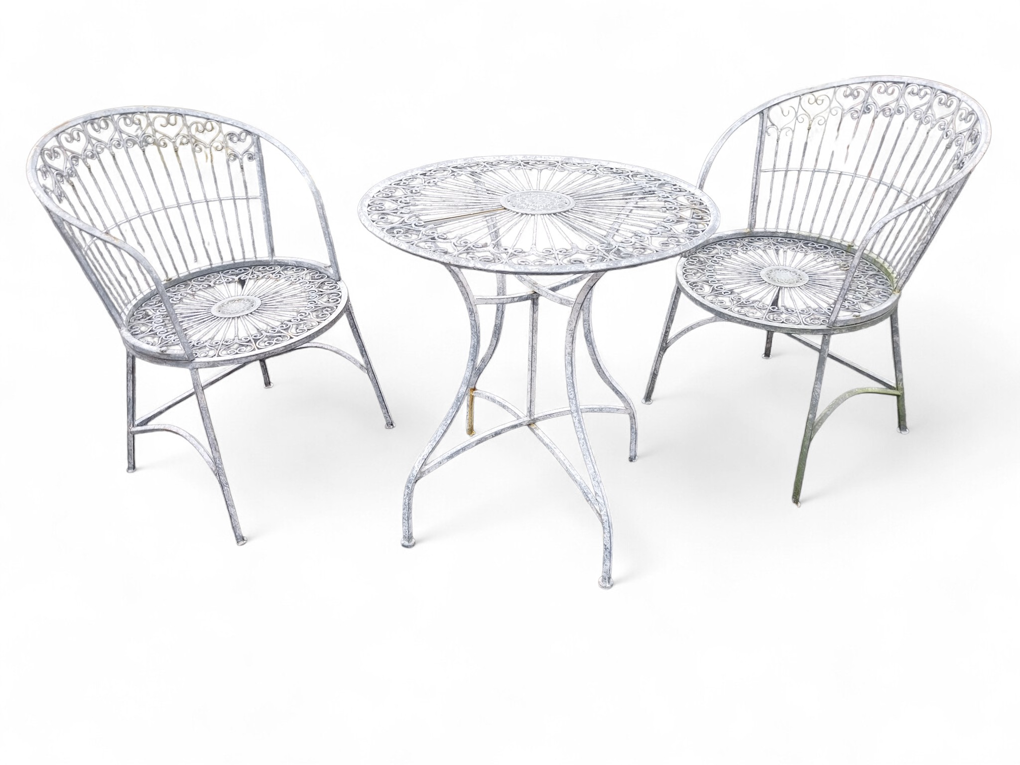 French style metal garden table and two chairs. Table {75 cm H x 80 cm Dia.} and Chairs {87 cm H x 56 cm W x 70 cm D}.