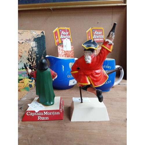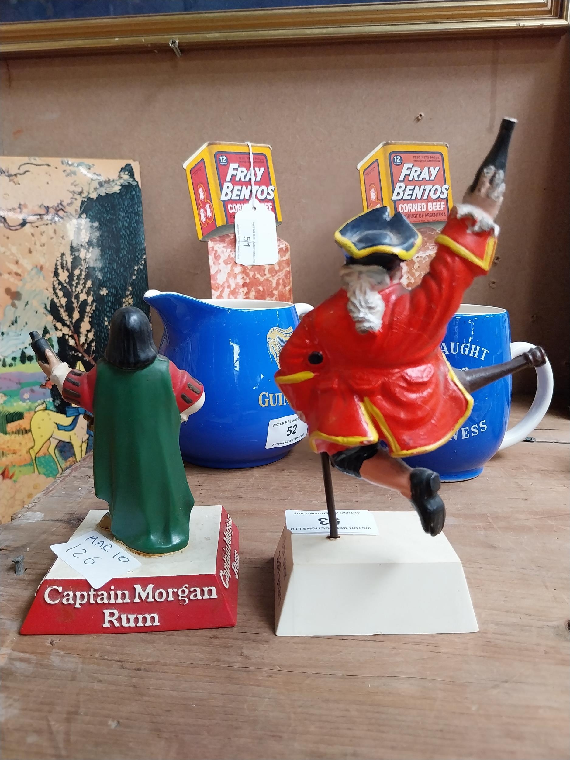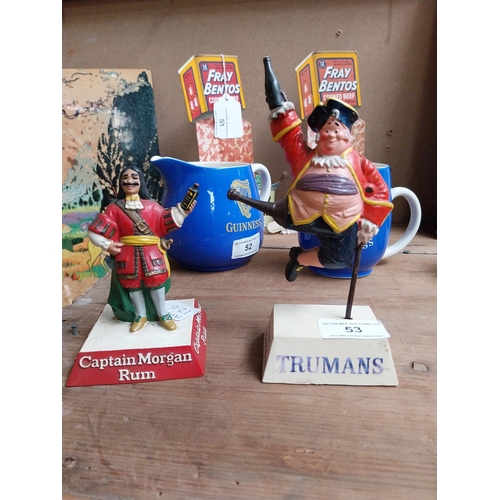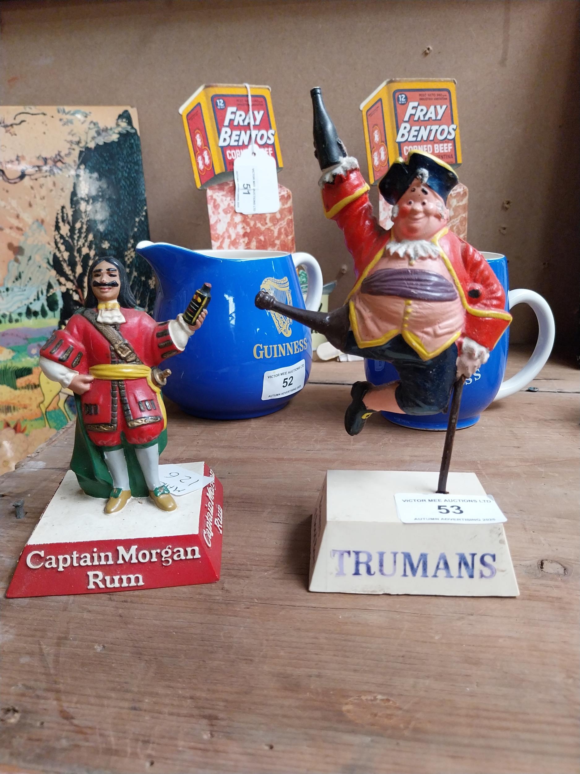 Trumans Beer advertising figure {19 cm H x 10 cm W x 3 cm D} and Captain Morgan Rum advertising figure {13 cm H x 8 cm W x 8 cm D}.