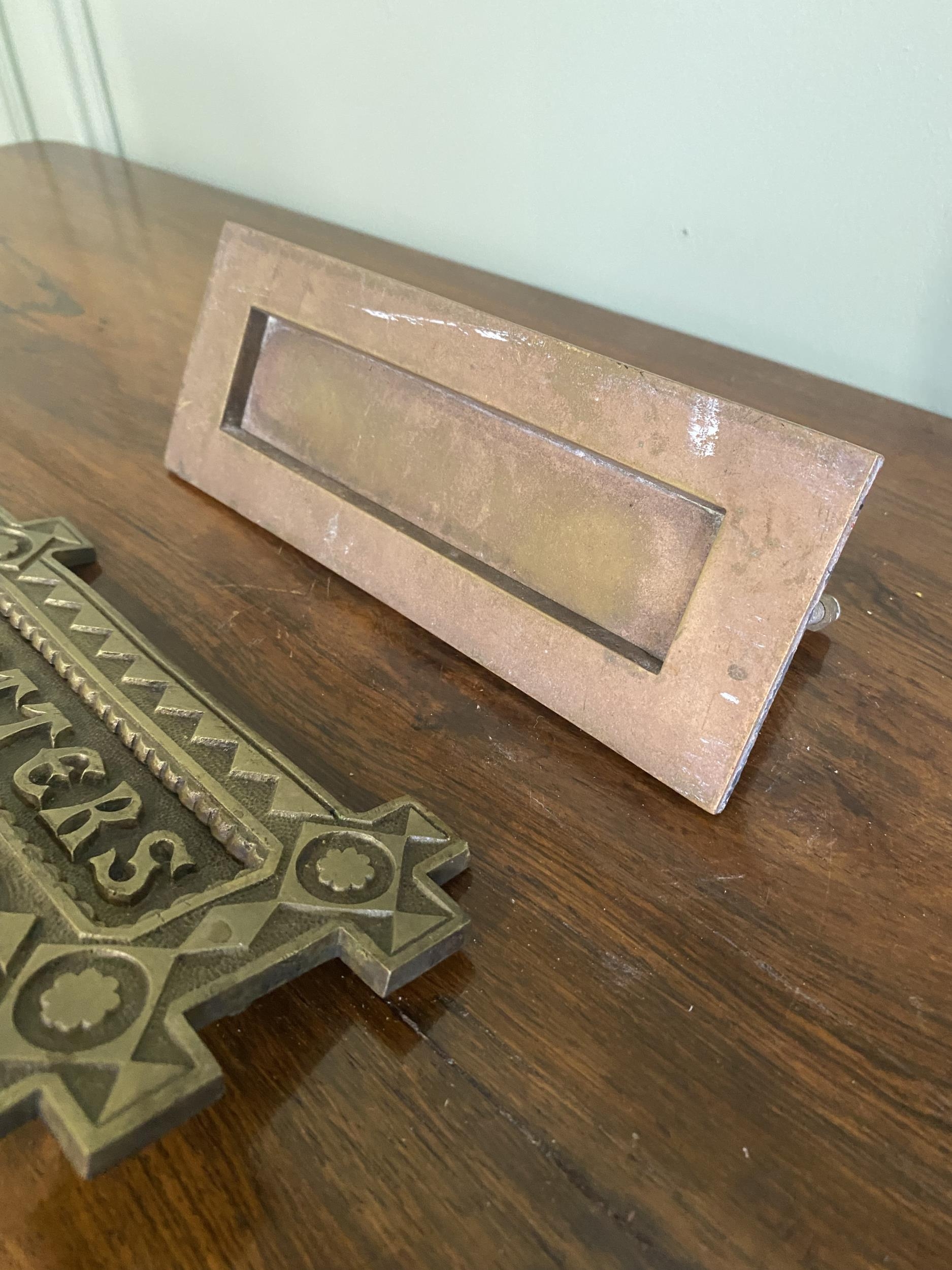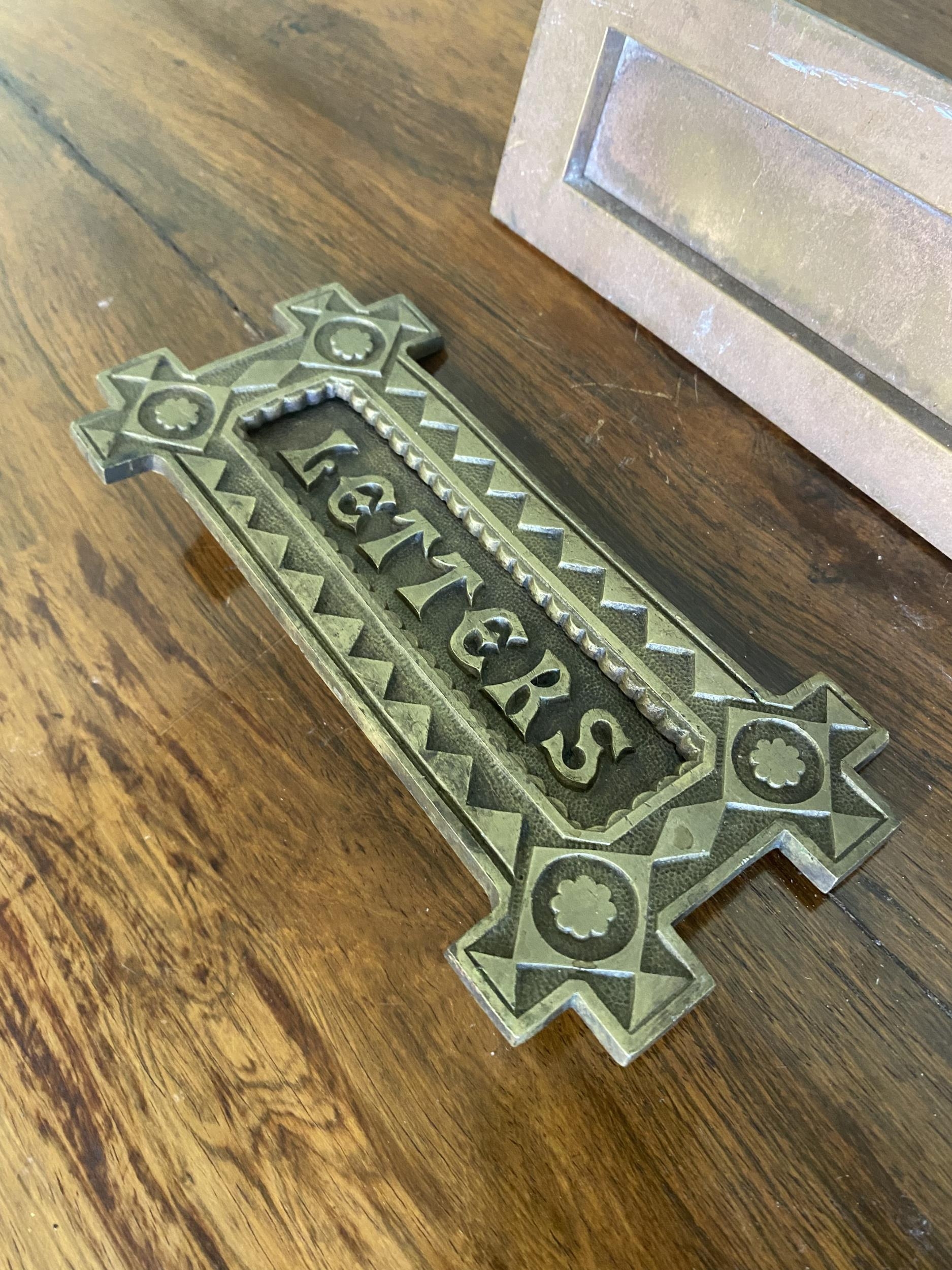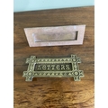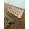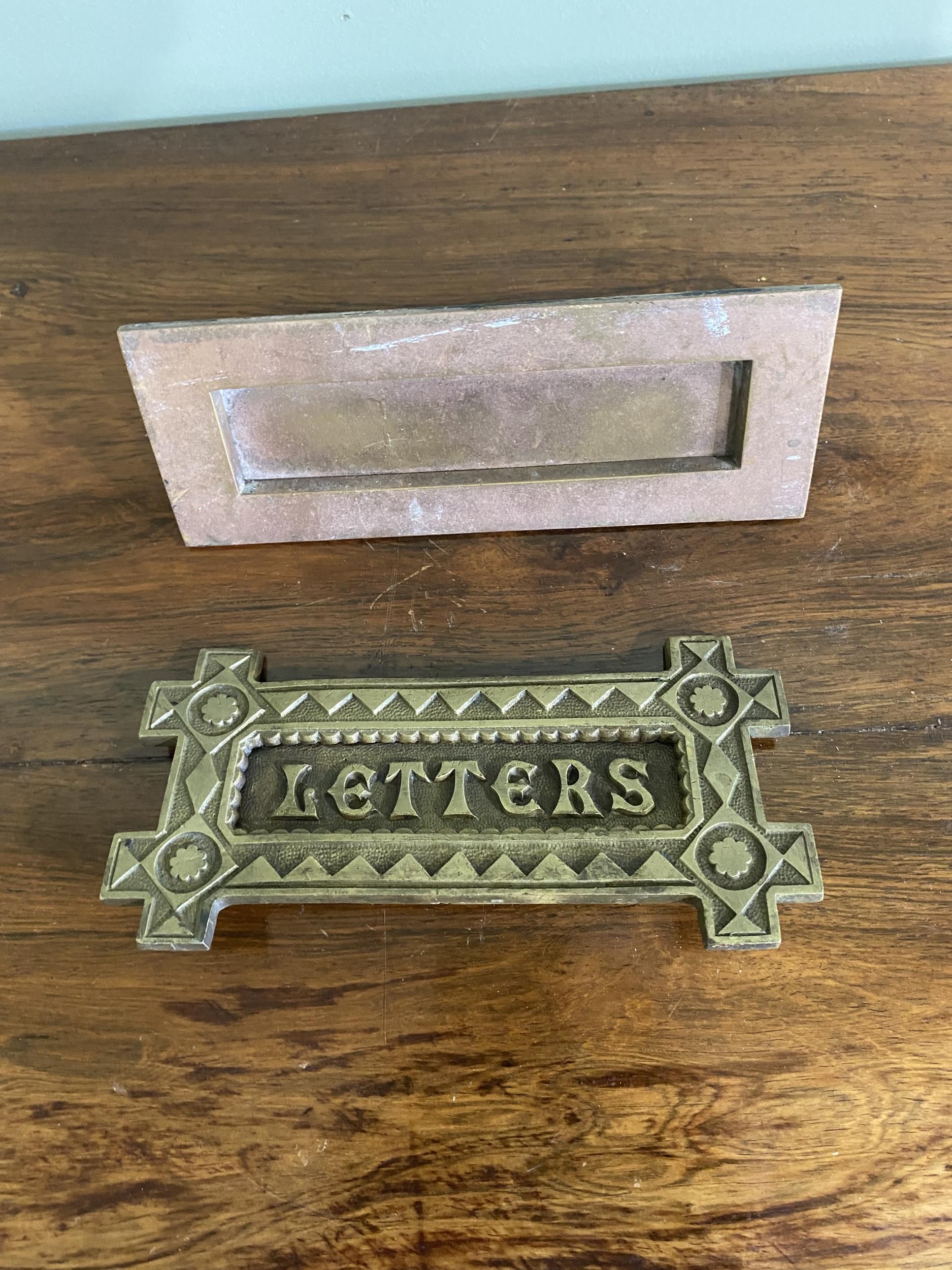 Two early 20th C. brass door letter boxes {8 cm H x 20 cm W x 6 cm D and 9 cm W x 19 cm W}.