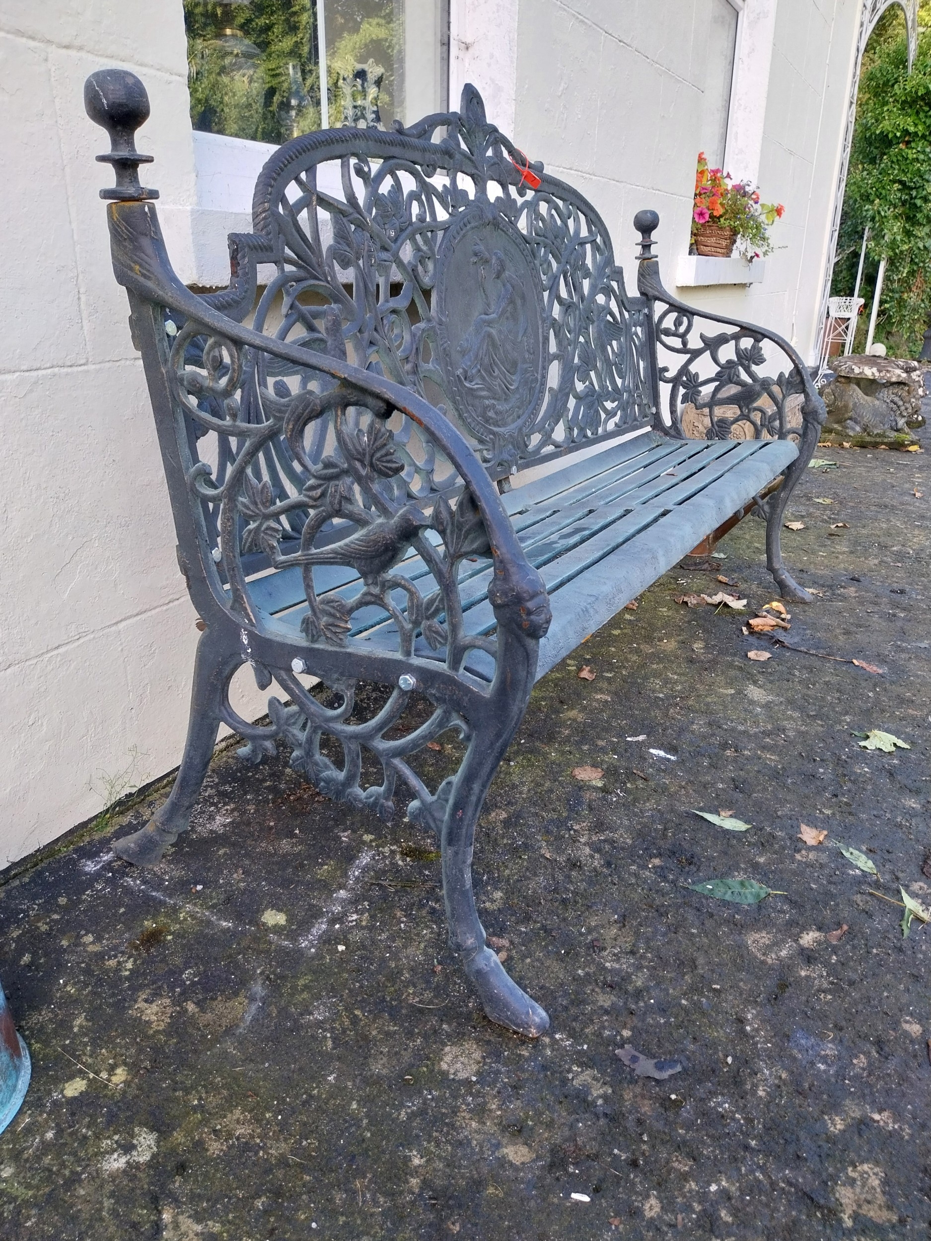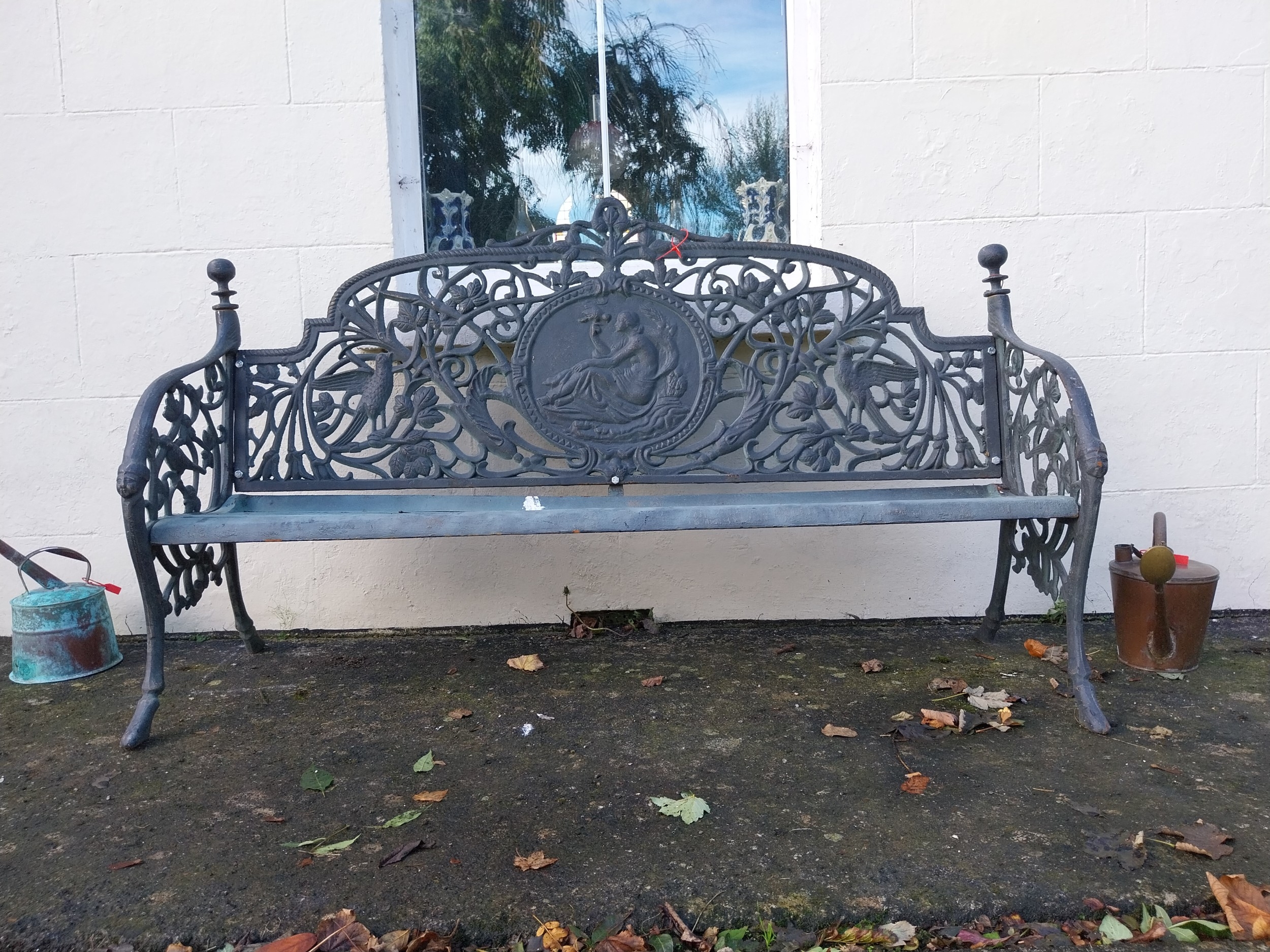 Decorative French cast iron three seater garden bench. { 112cm H X 187cm W X 60cm D }.