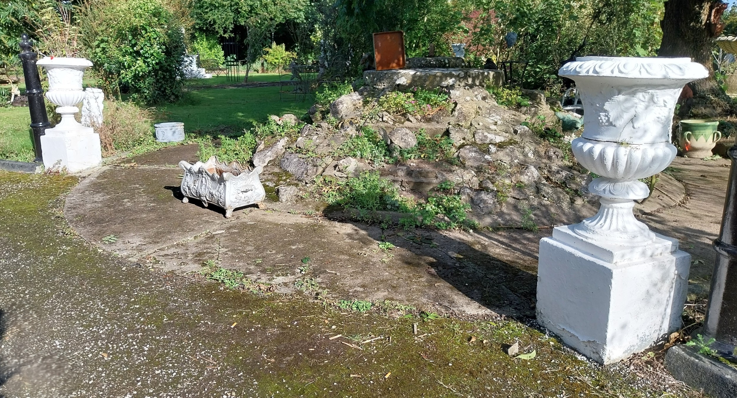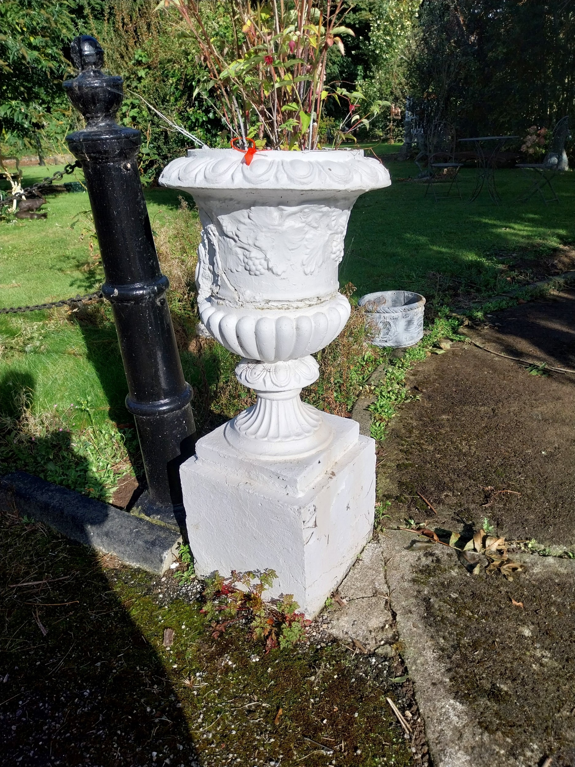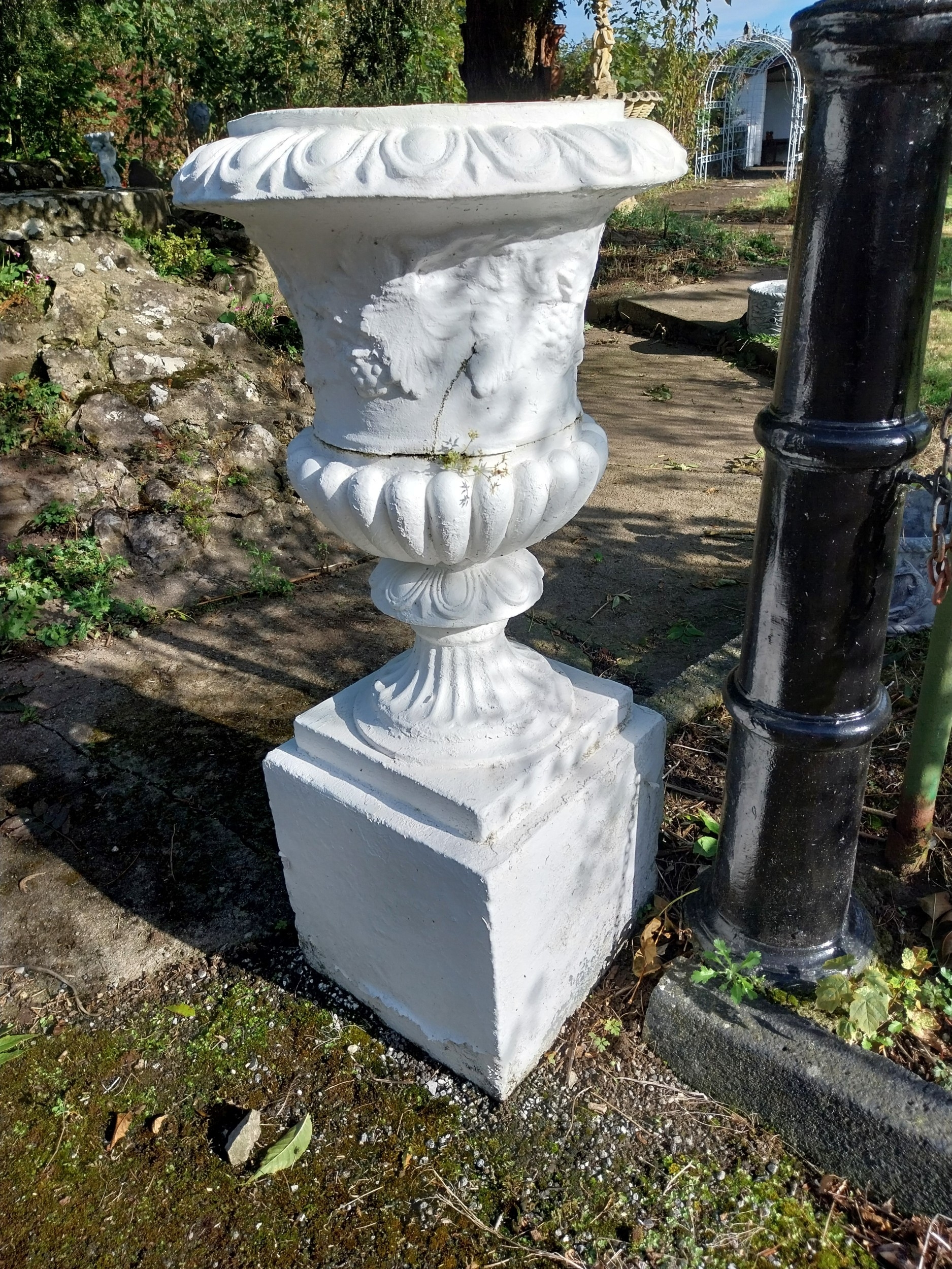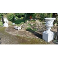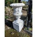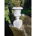 Pair of early 20th. C. moulded stone urns, the bowls decorated with grape vines, mounted on pedestals. { 109cm H X 50cm Dia }.
