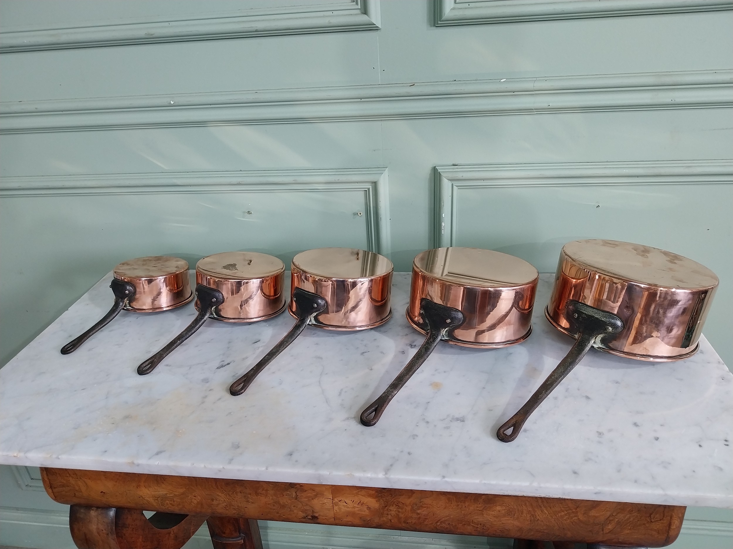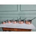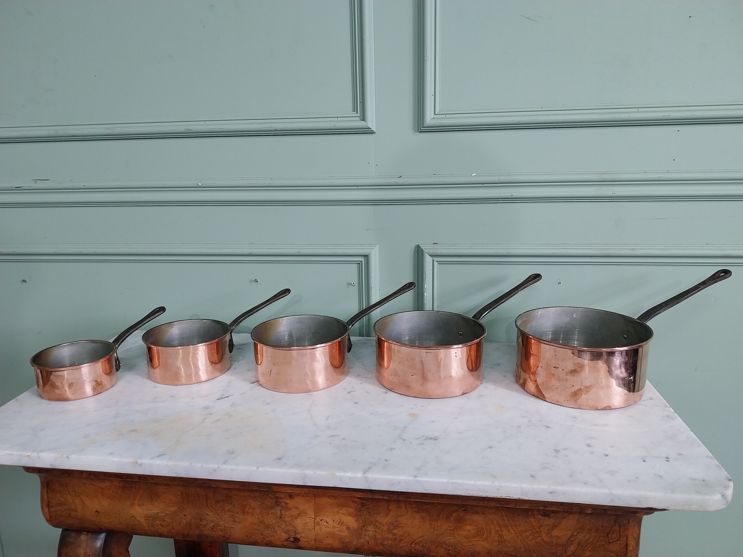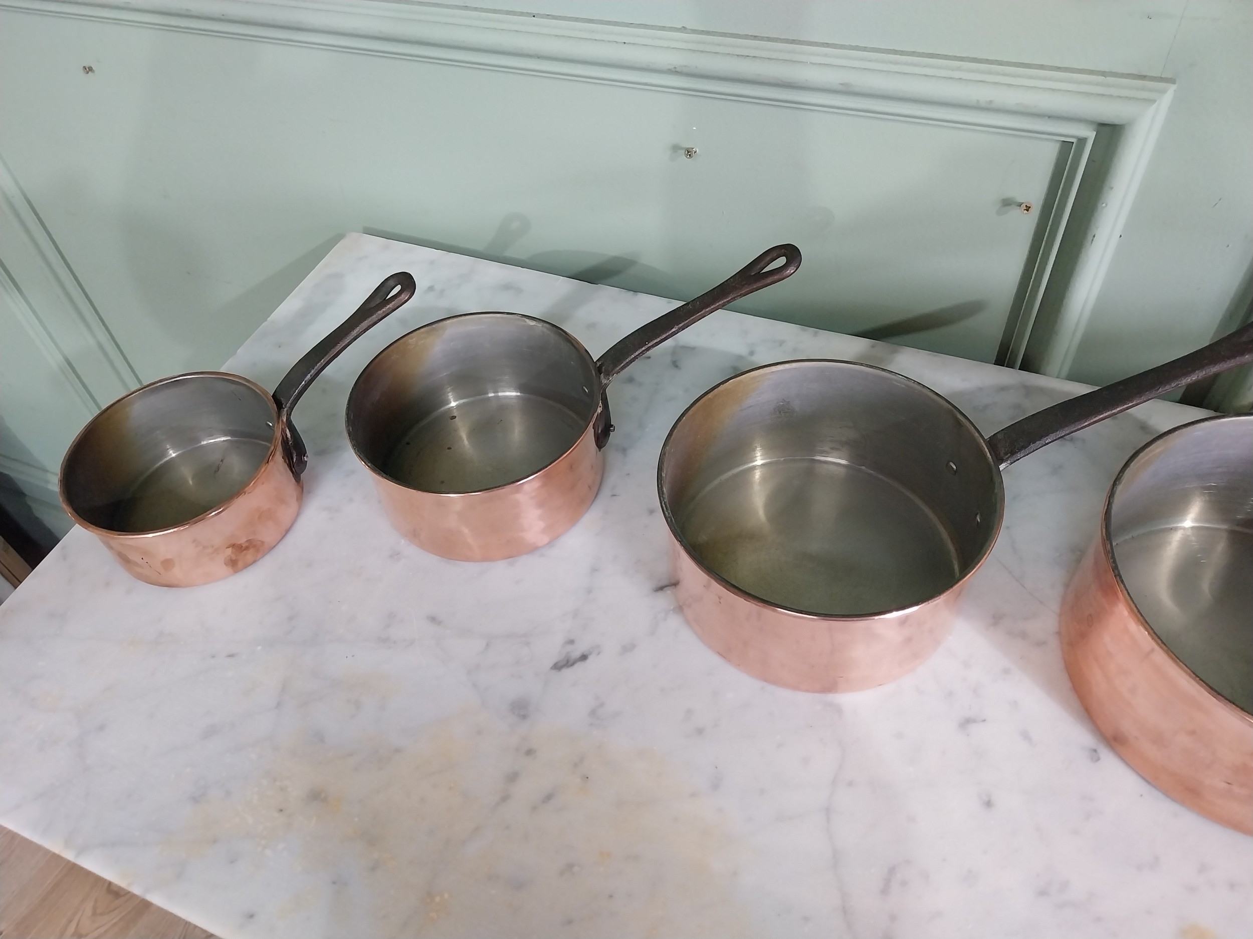 Set of five early 20th C. copper set of graduated saucepans with wrought iron handles. {17 cm H x 39 cm W x 21 cm D to 10 cm H x 24 cm W x13 cm D}.