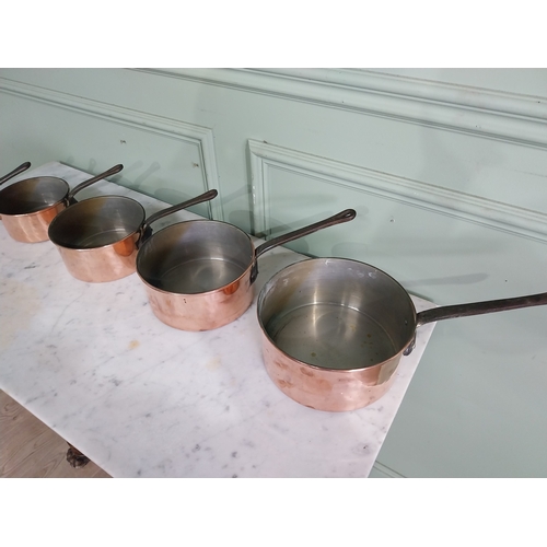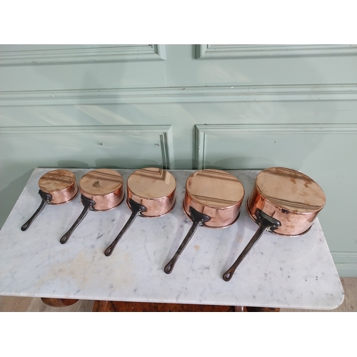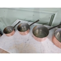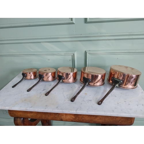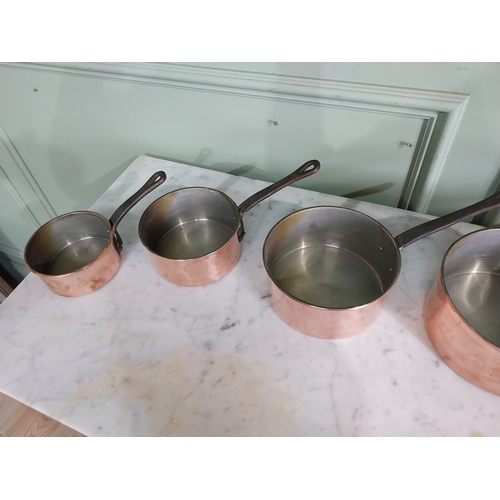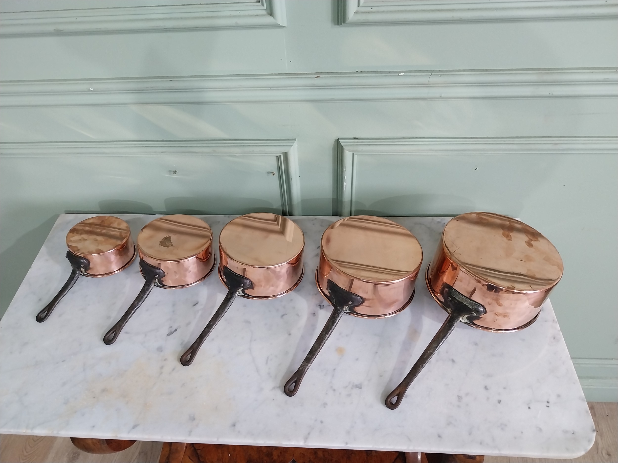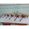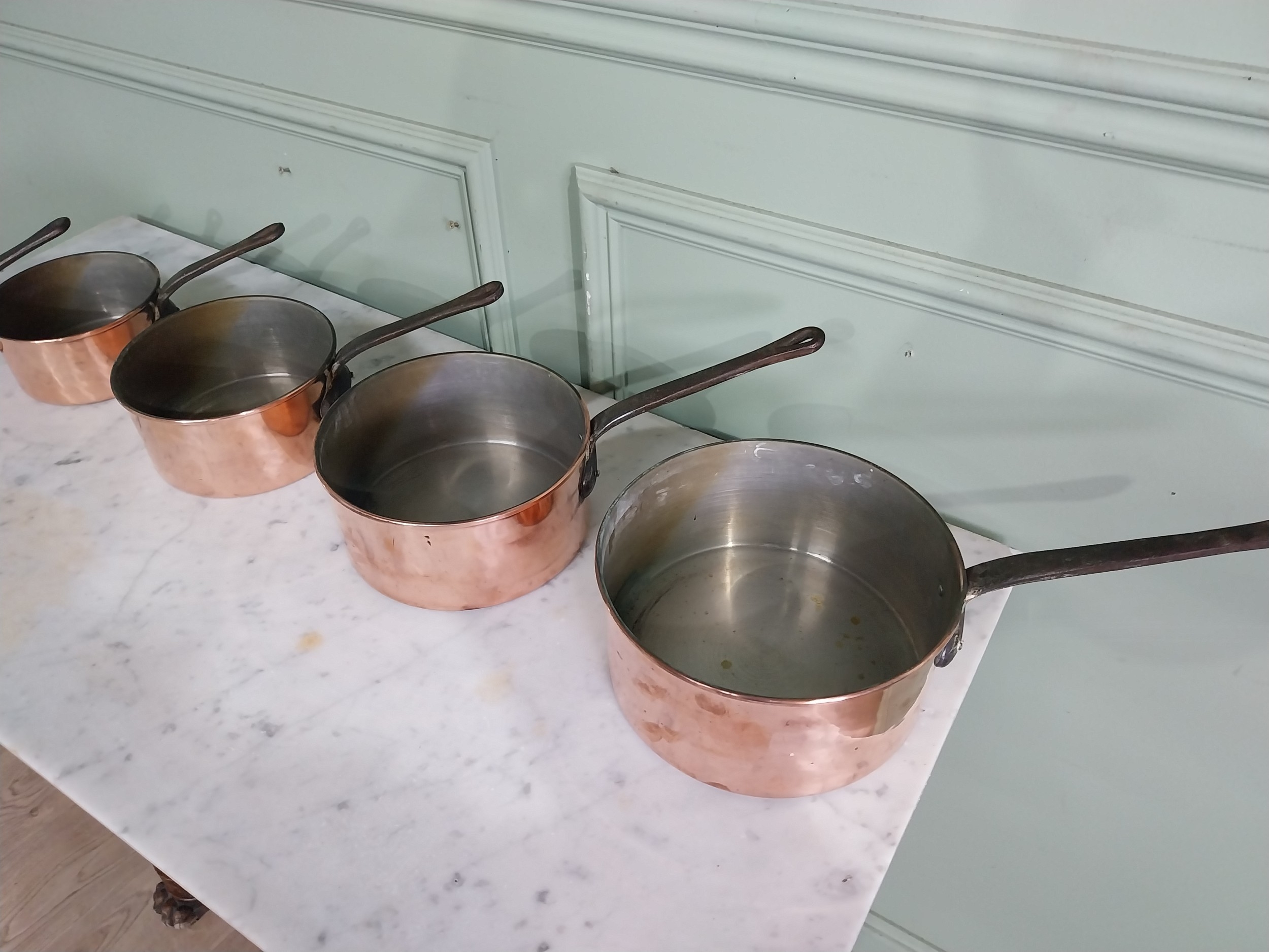 Set of five early 20th C. copper set of graduated saucepans with wrought iron handles. {17 cm H x 39 cm W x 21 cm D to 10 cm H x 24 cm W x13 cm D}.