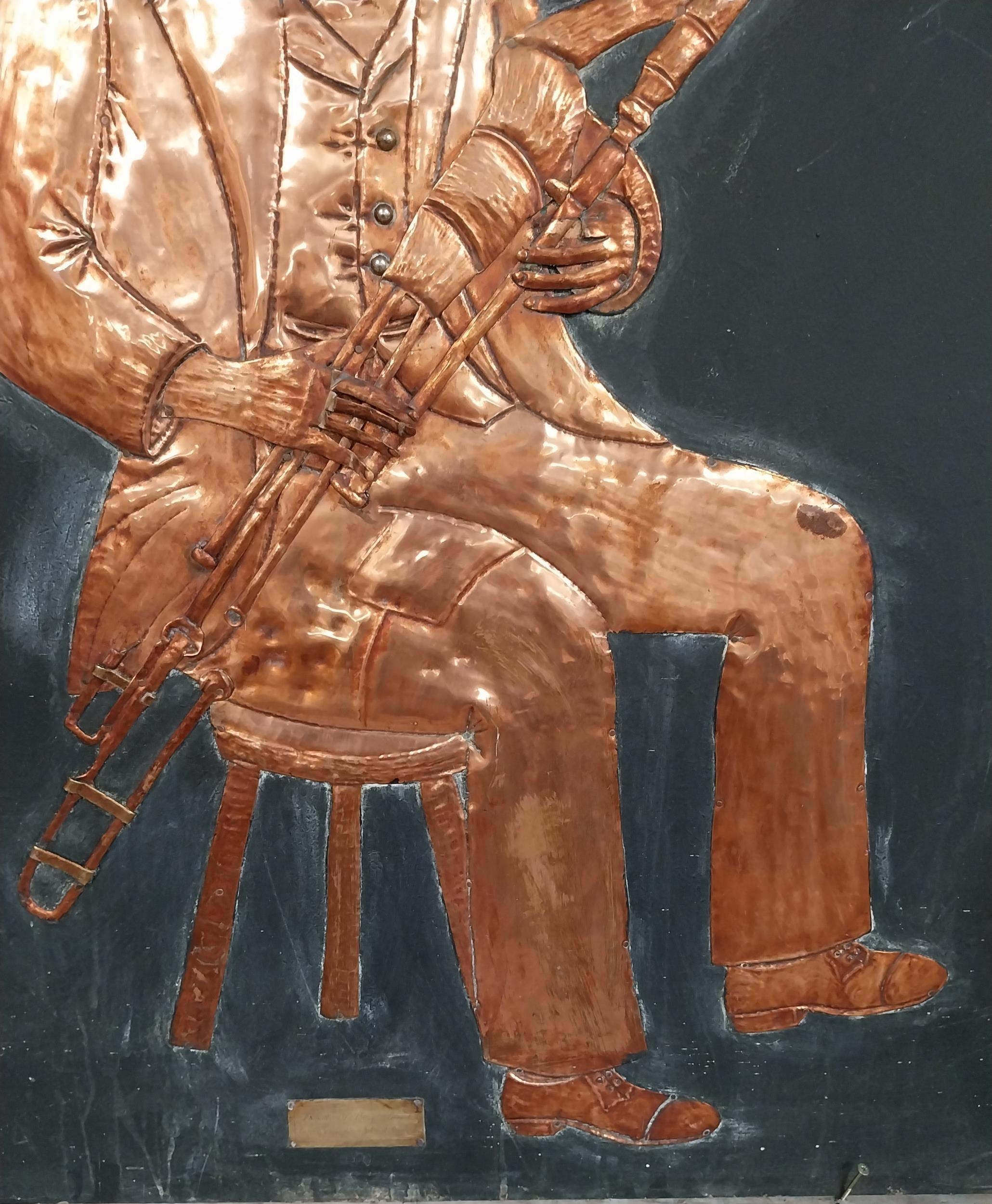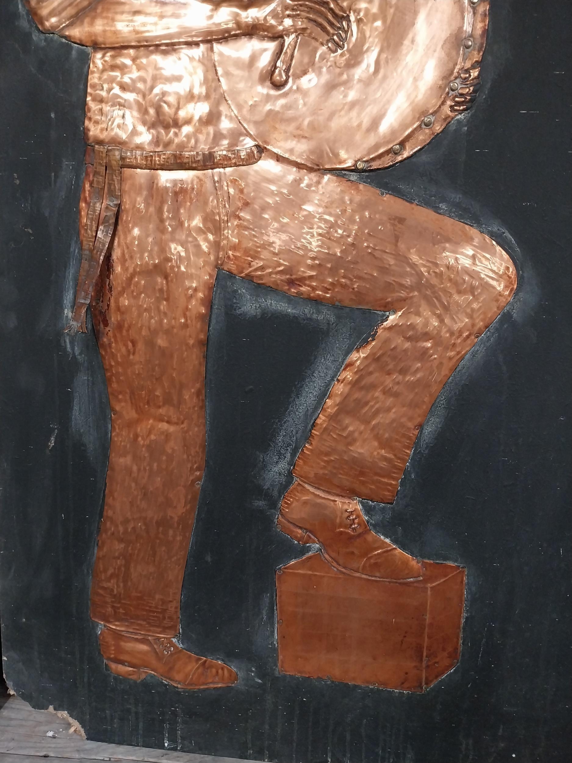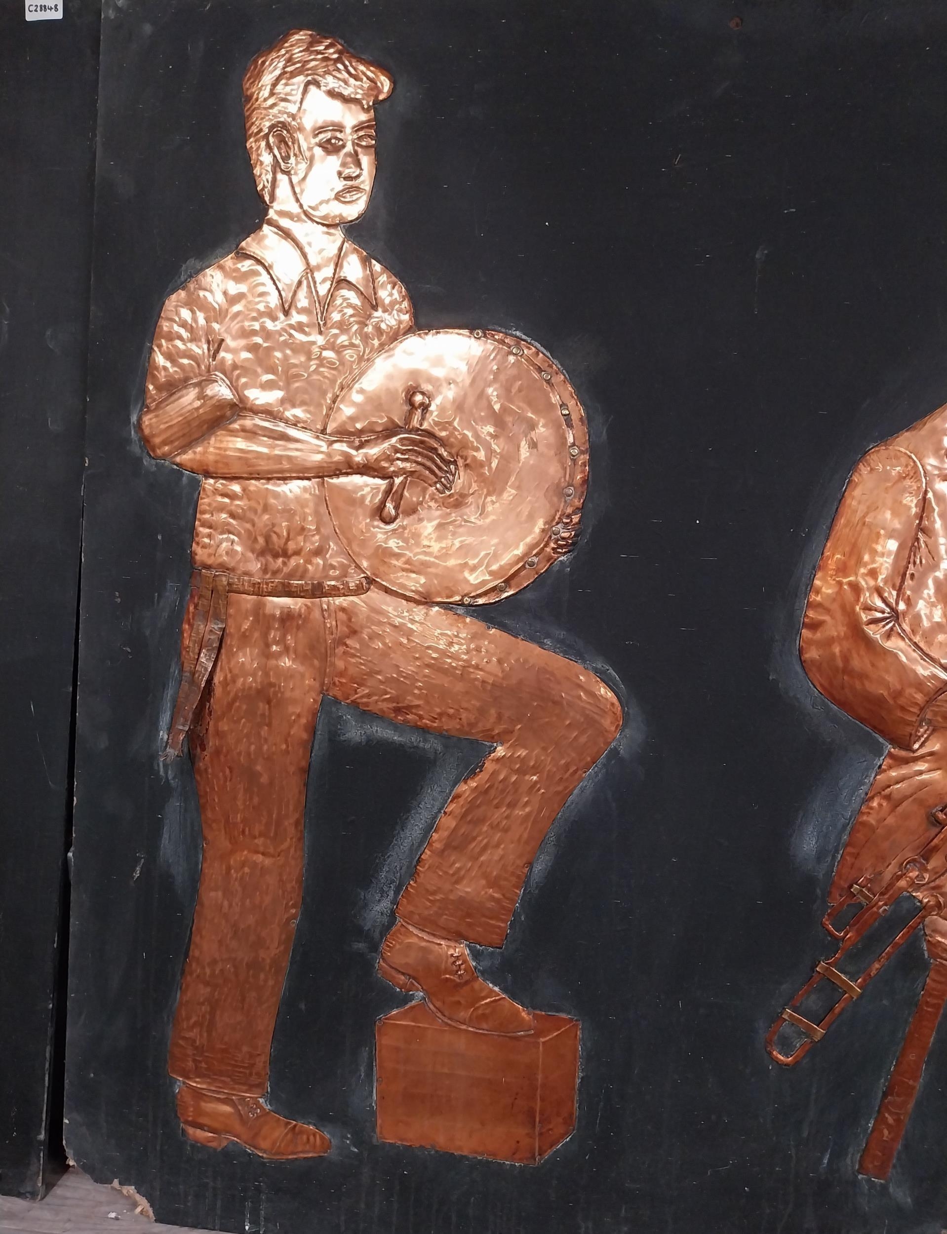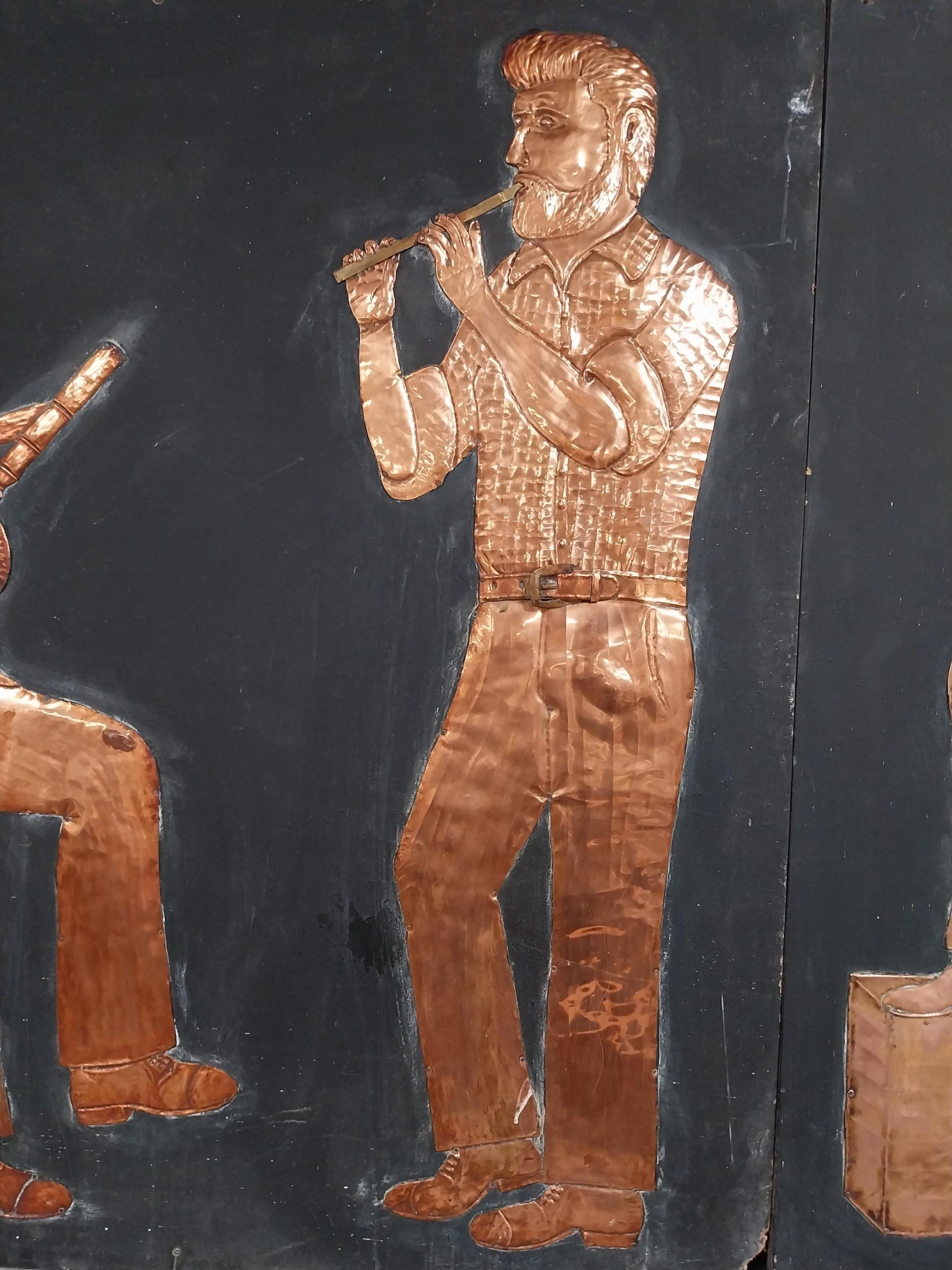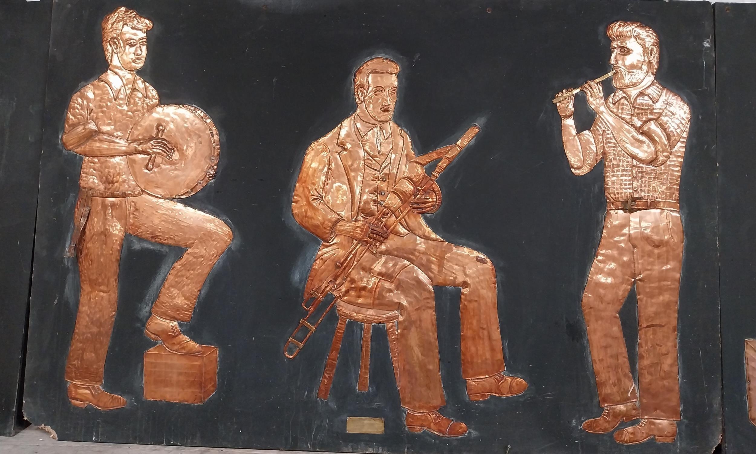 Three embossed coppers figures of Bodhran Player, Pipe Player and Tin Whistle Player on painted board originally from Slattery's Pub Capel Street with brass plaque Drawings by Brian Mc Cormack and Copper works by John A Brennan. {122 cm H x 183 cm W}.
