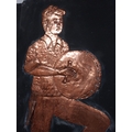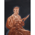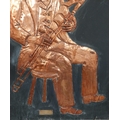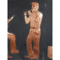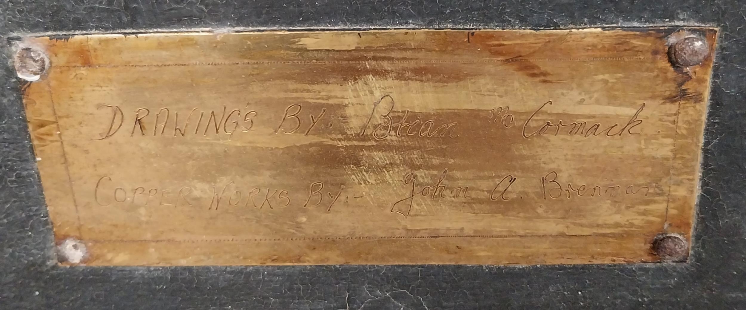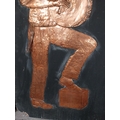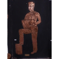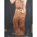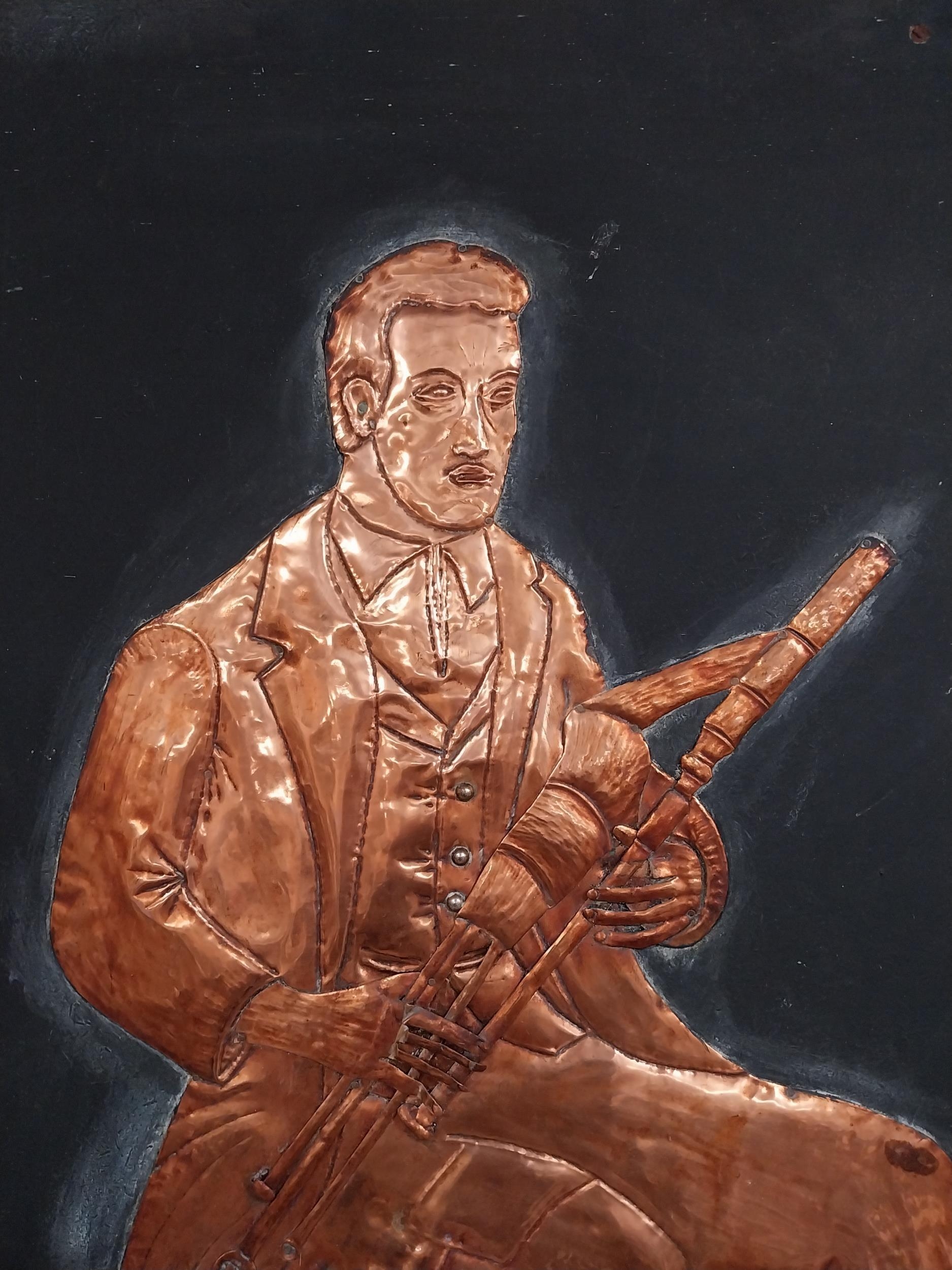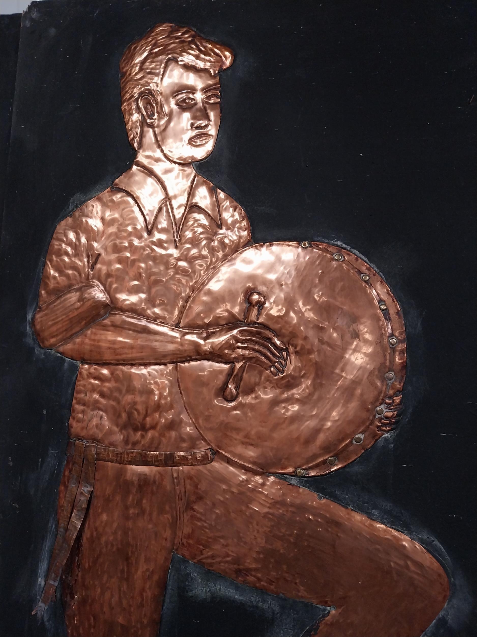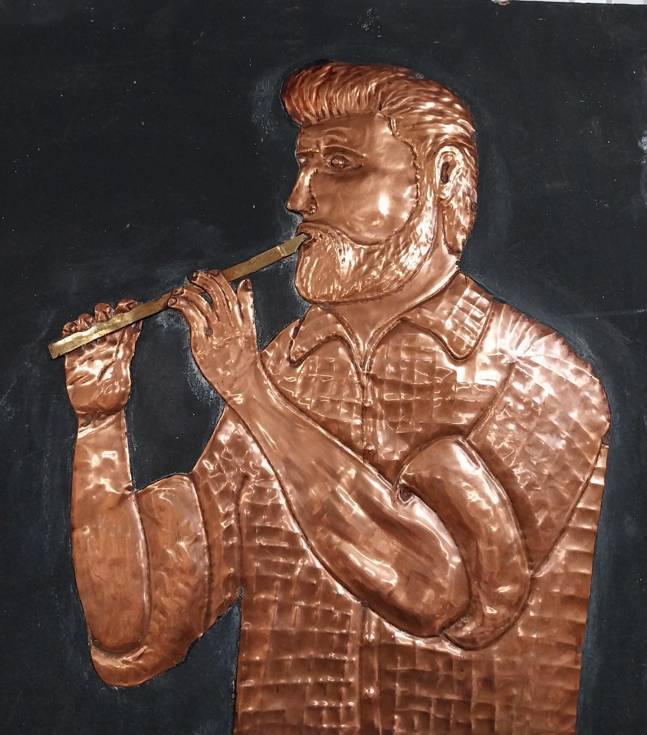 Three embossed coppers figures of Bodhran Player, Pipe Player and Tin Whistle Player on painted board originally from Slattery's Pub Capel Street with brass plaque Drawings by Brian Mc Cormack and Copper works by John A Brennan. {122 cm H x 183 cm W}.