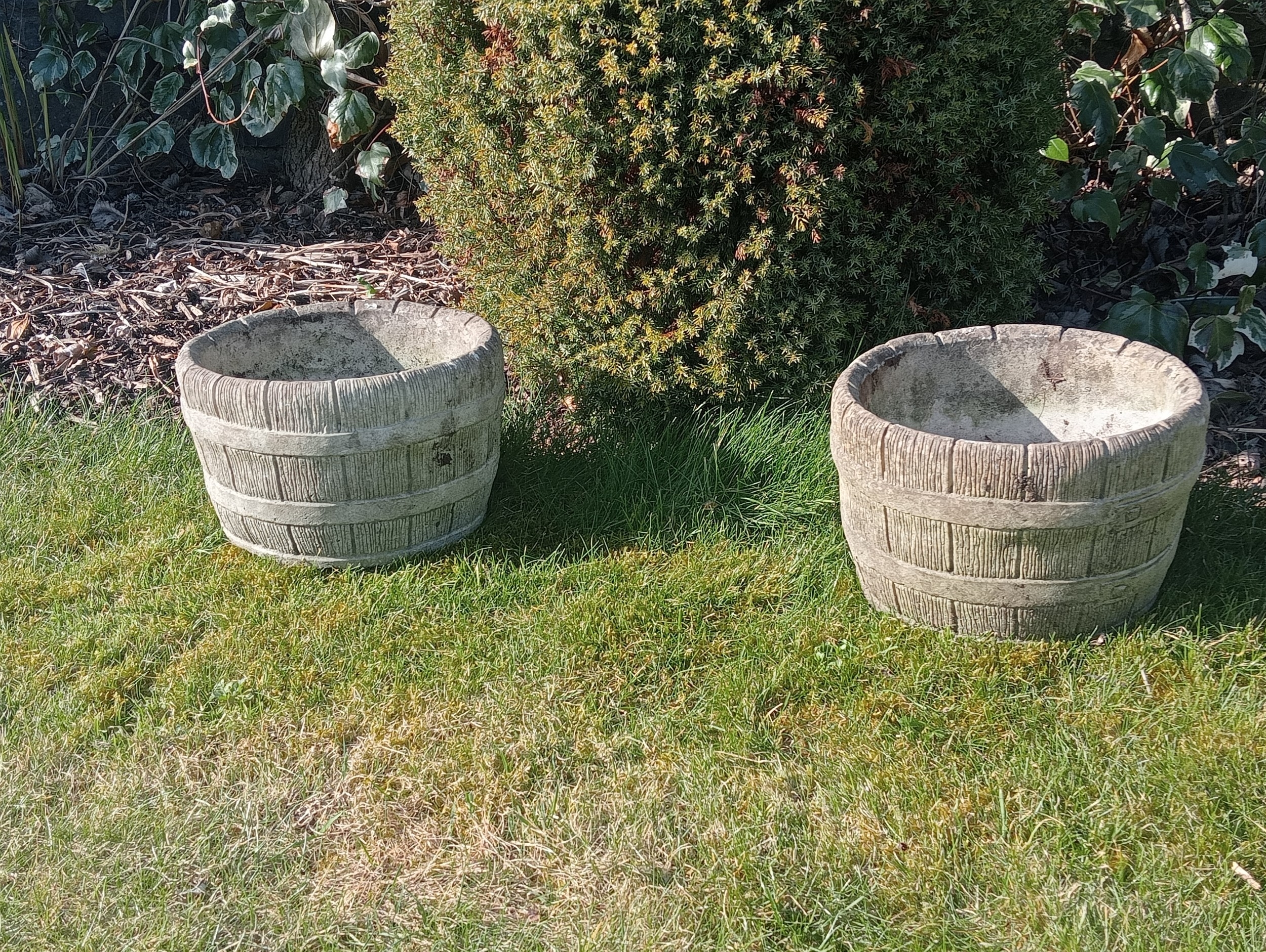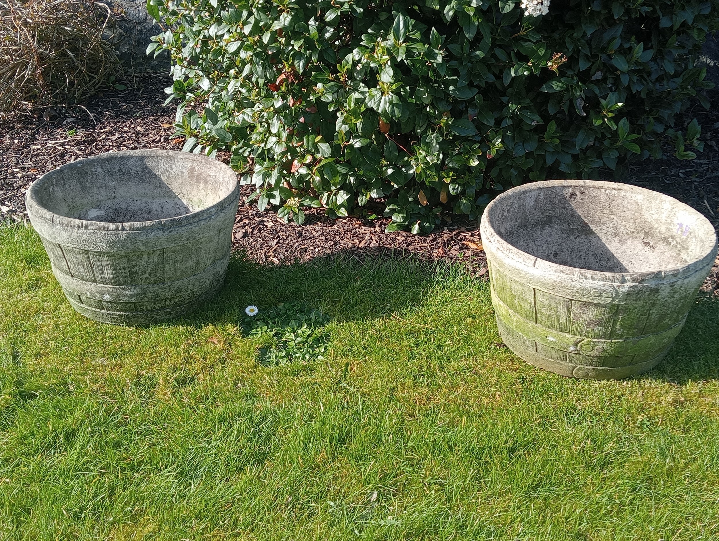 Pair of composition stone planters in the barrel form (H 20cm x Dia 30cm )