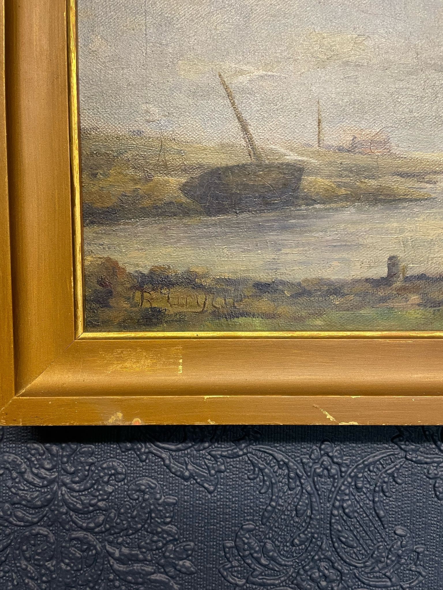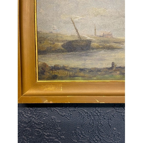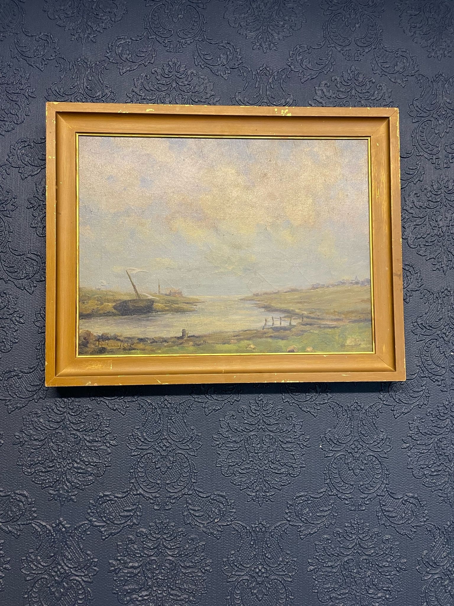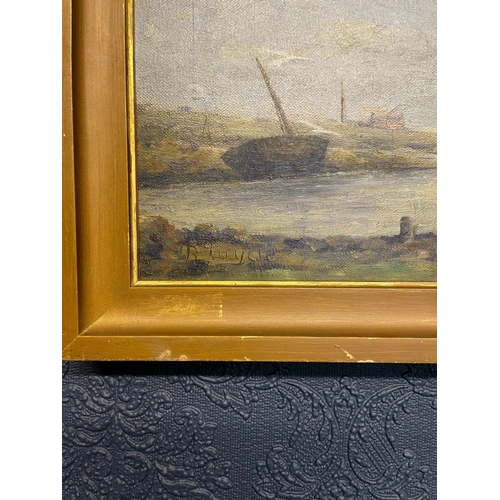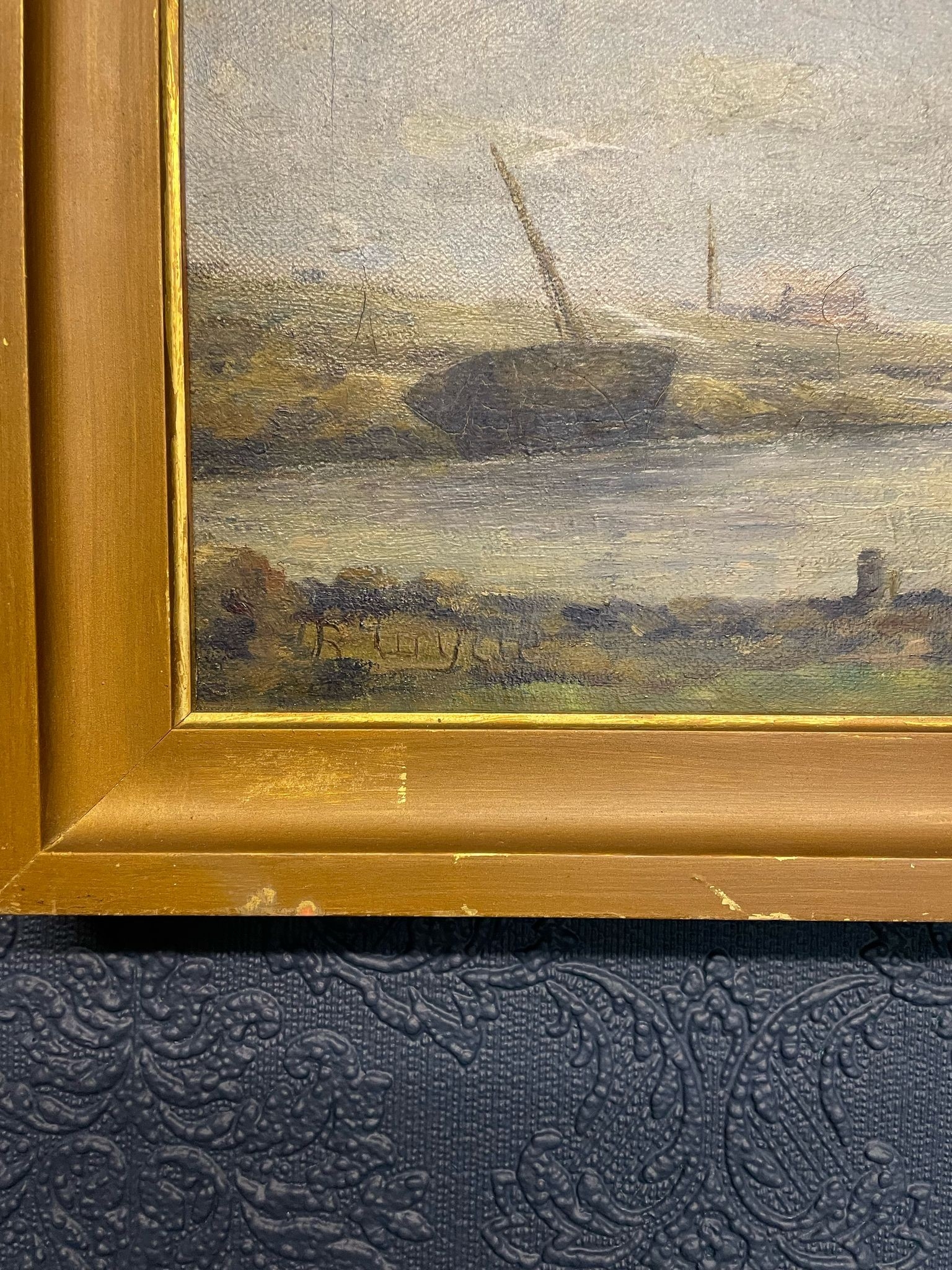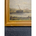 19th. C. The Inlet Oil on Canvas, signed bottom left, mounted in a gilt frame. { 38 cm H X 48 cm W }.
