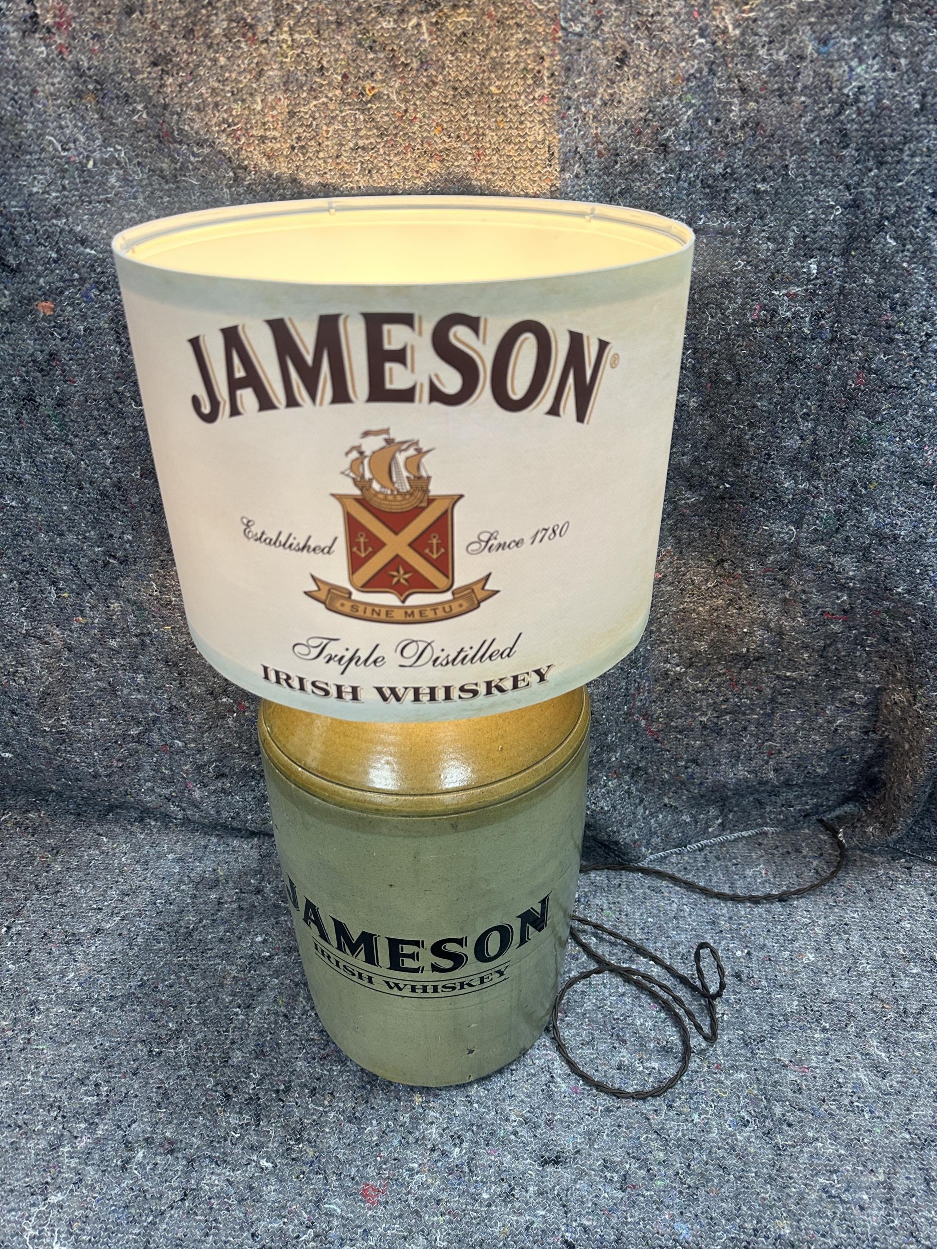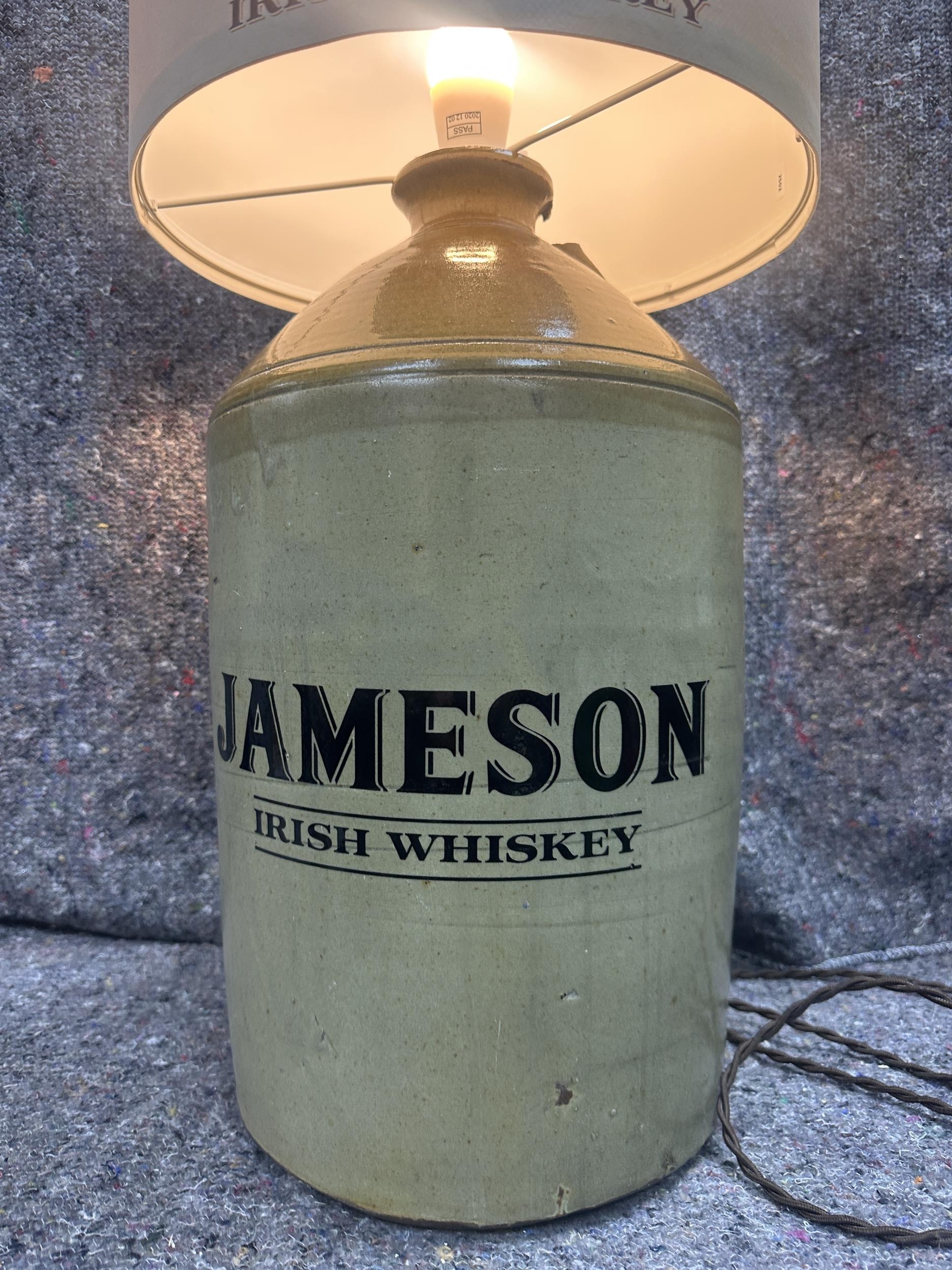 Jameson three gallon Irish Whiskey stoneware flagon lamp with cream Jameson shade {63cm H x 33cm Dia.}