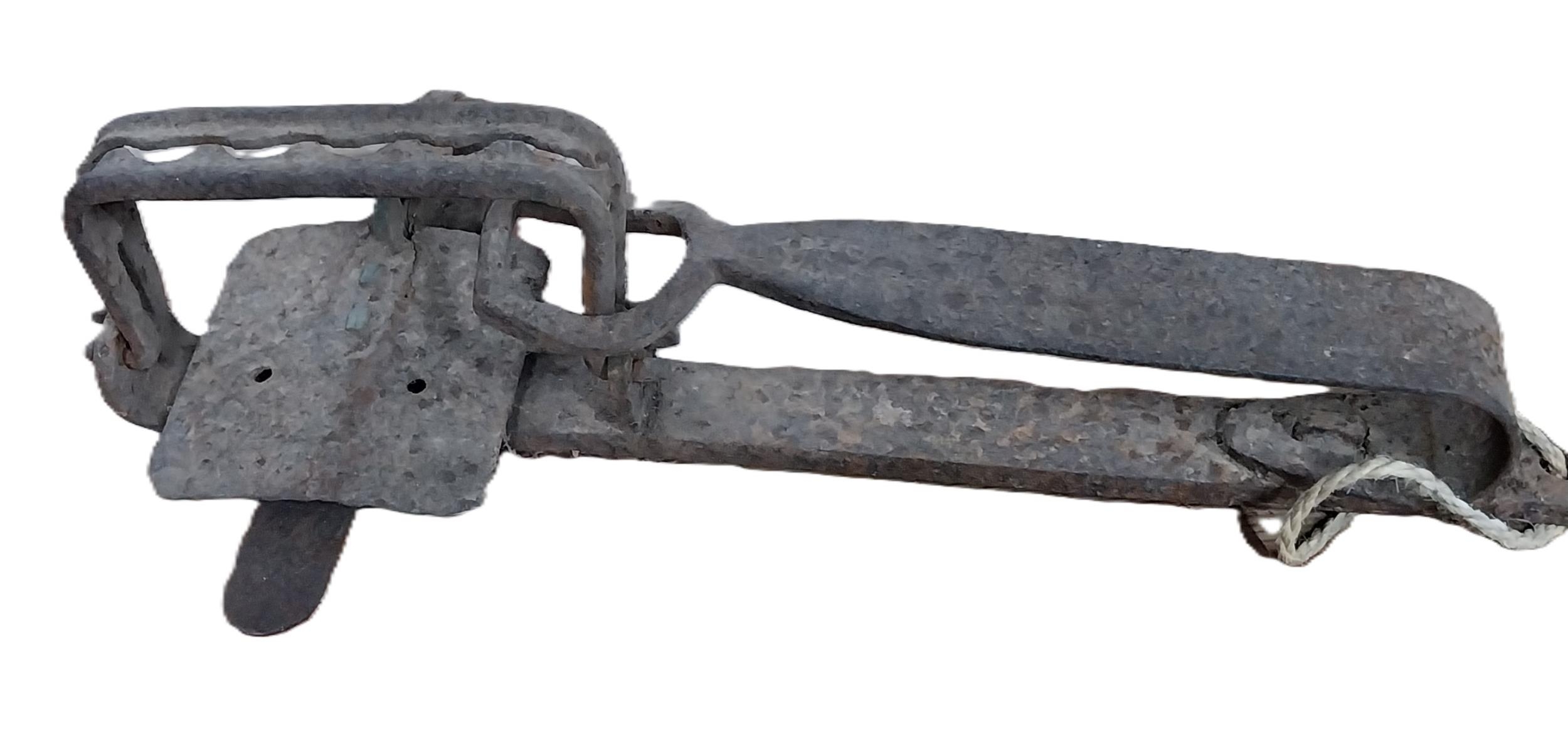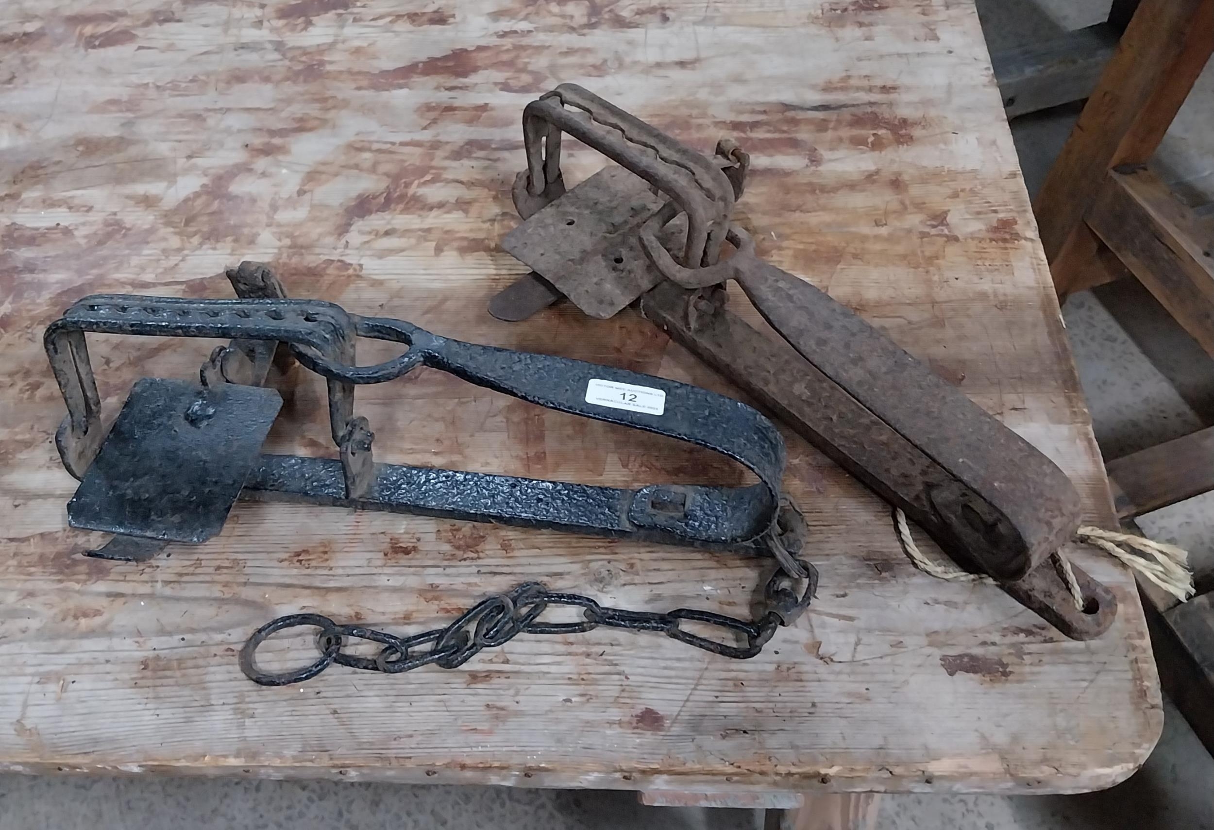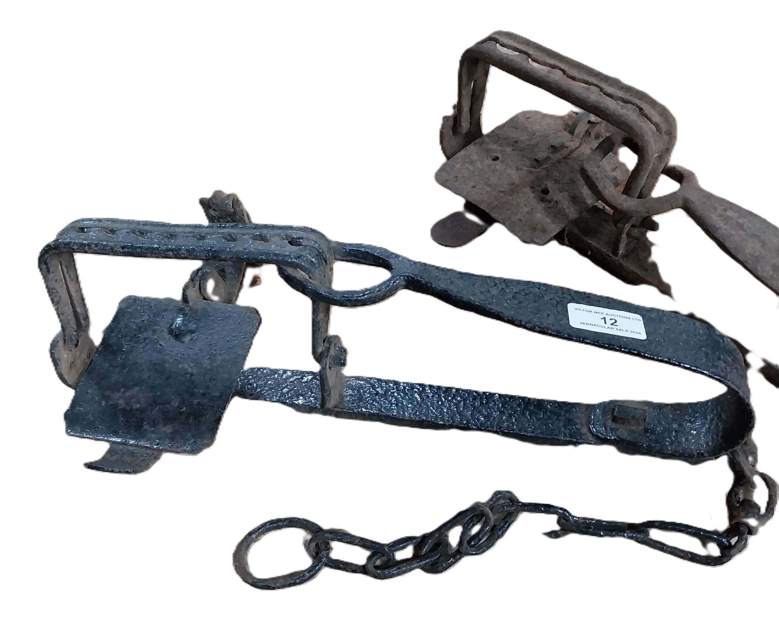 Two 19th C. metal gin traps. {13 cm H x 40 cm W x 19 cm D}.