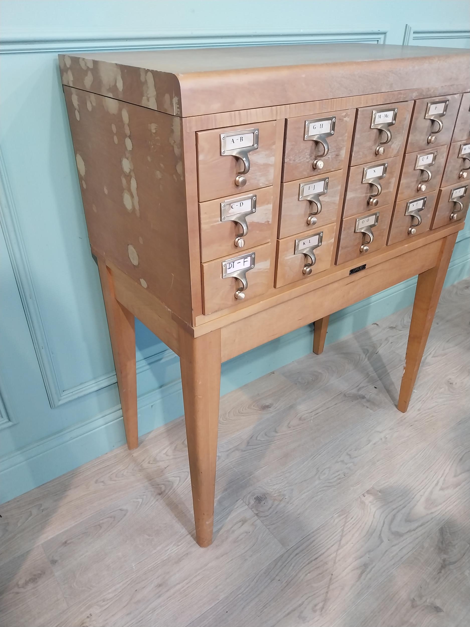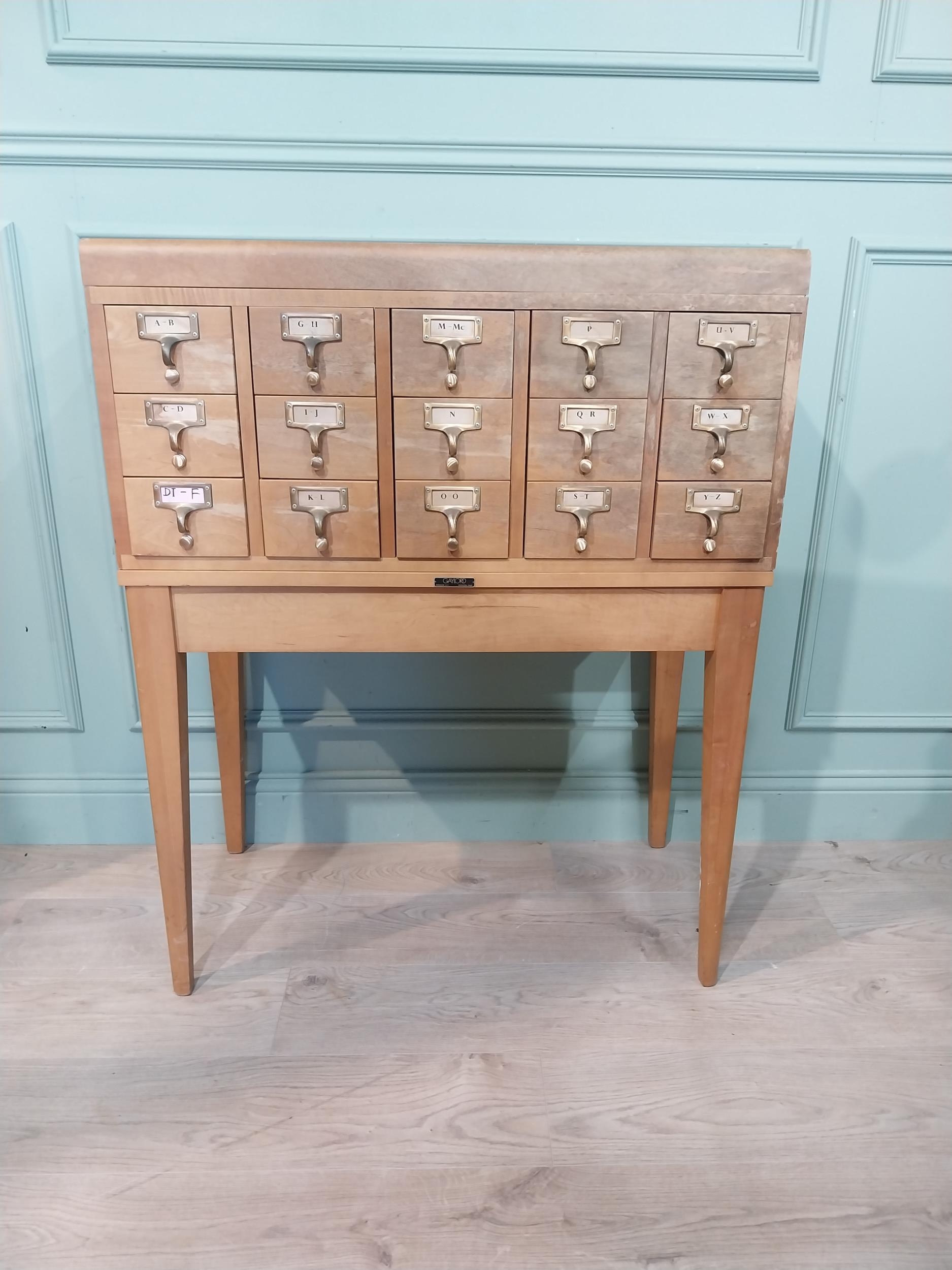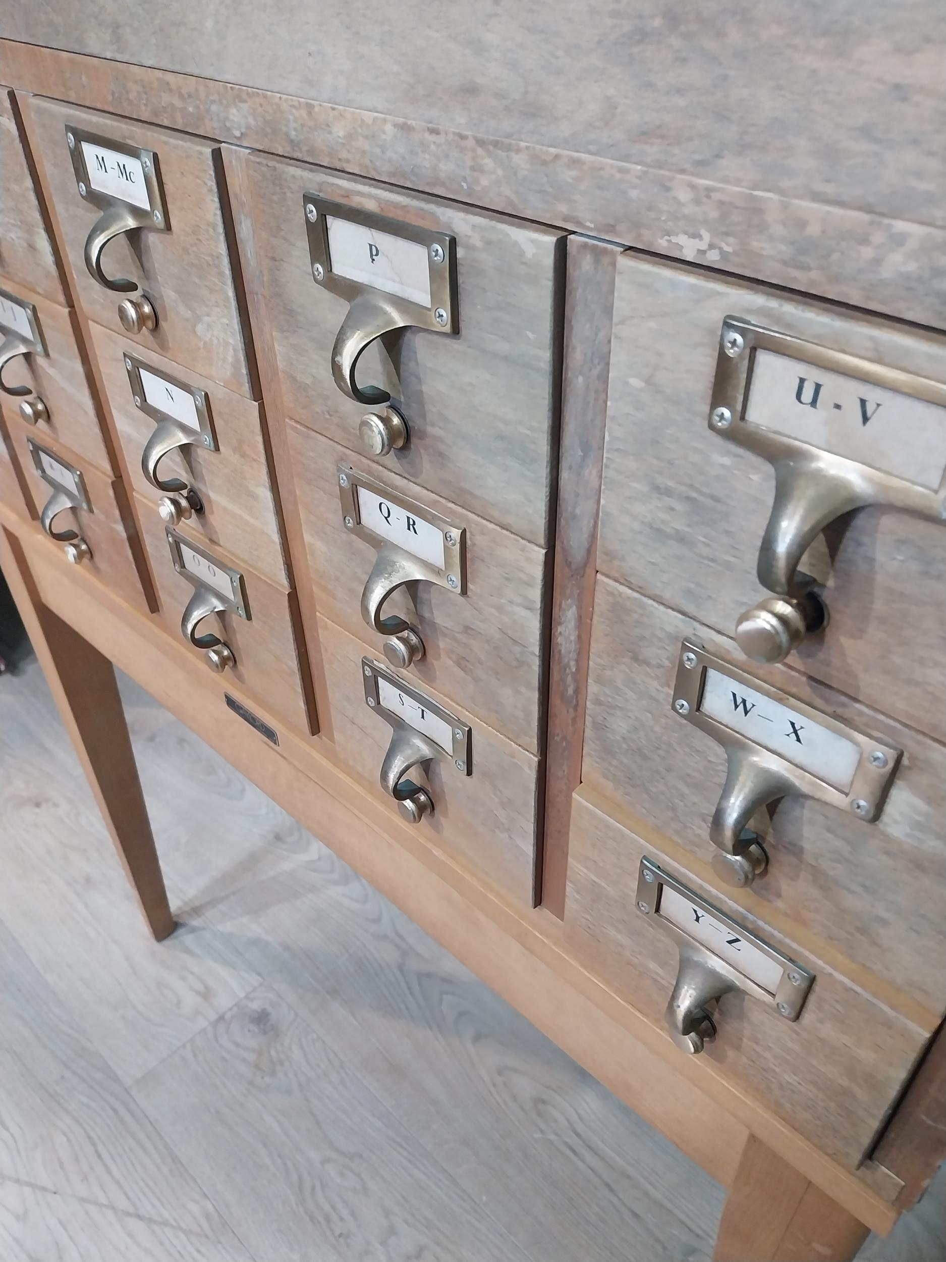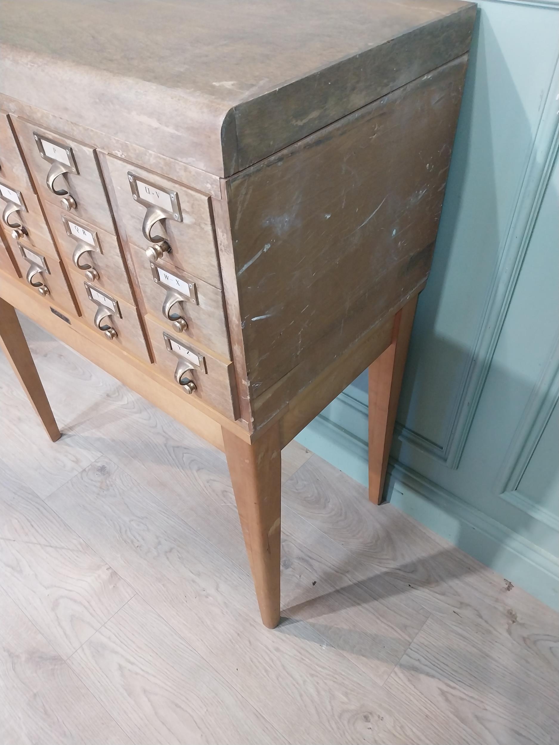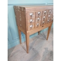 1950's oak bank of twelve drawers with brass handles on tapered legs. {104 cm H x 84 cm W x 44 cm D}.