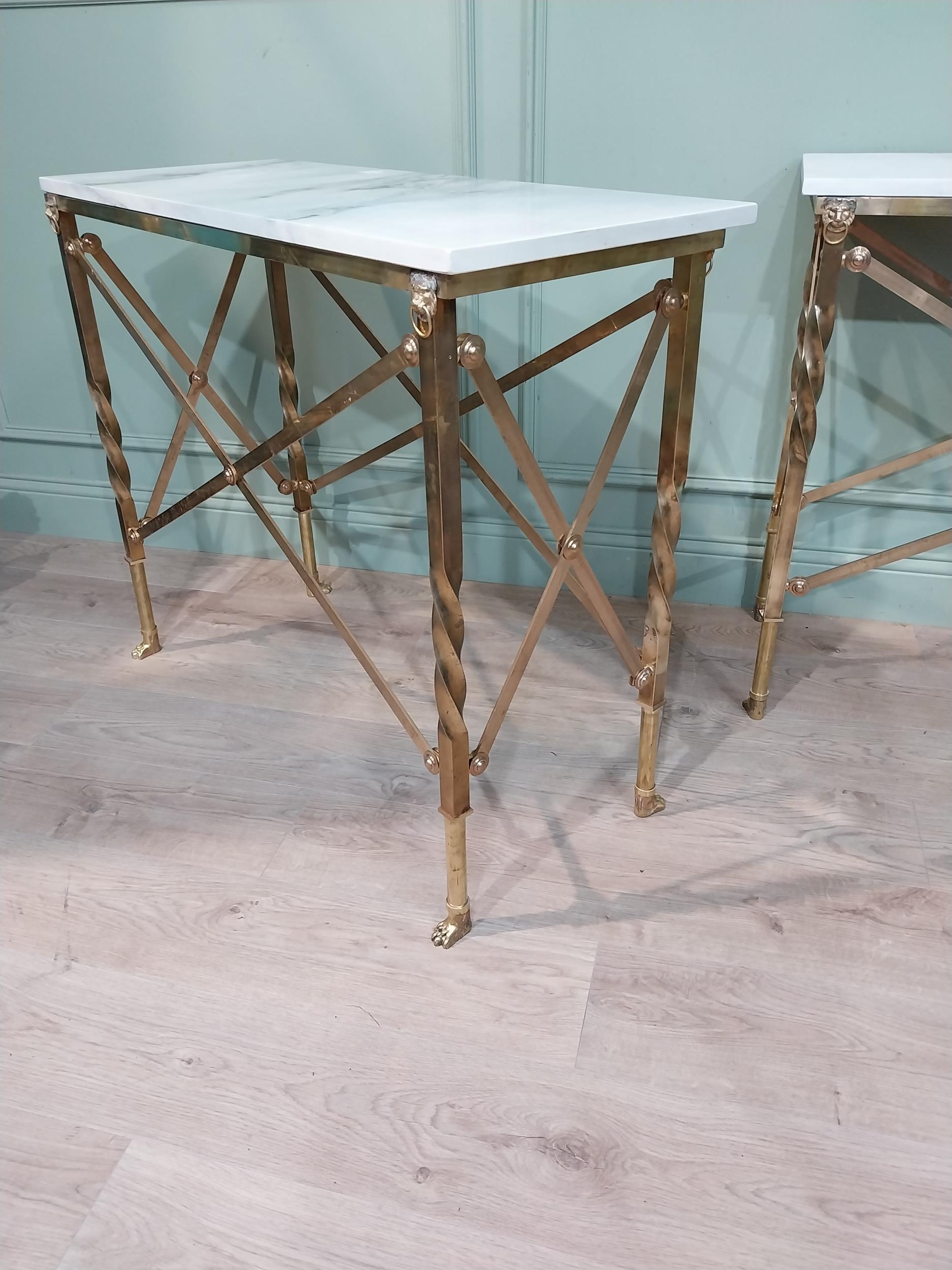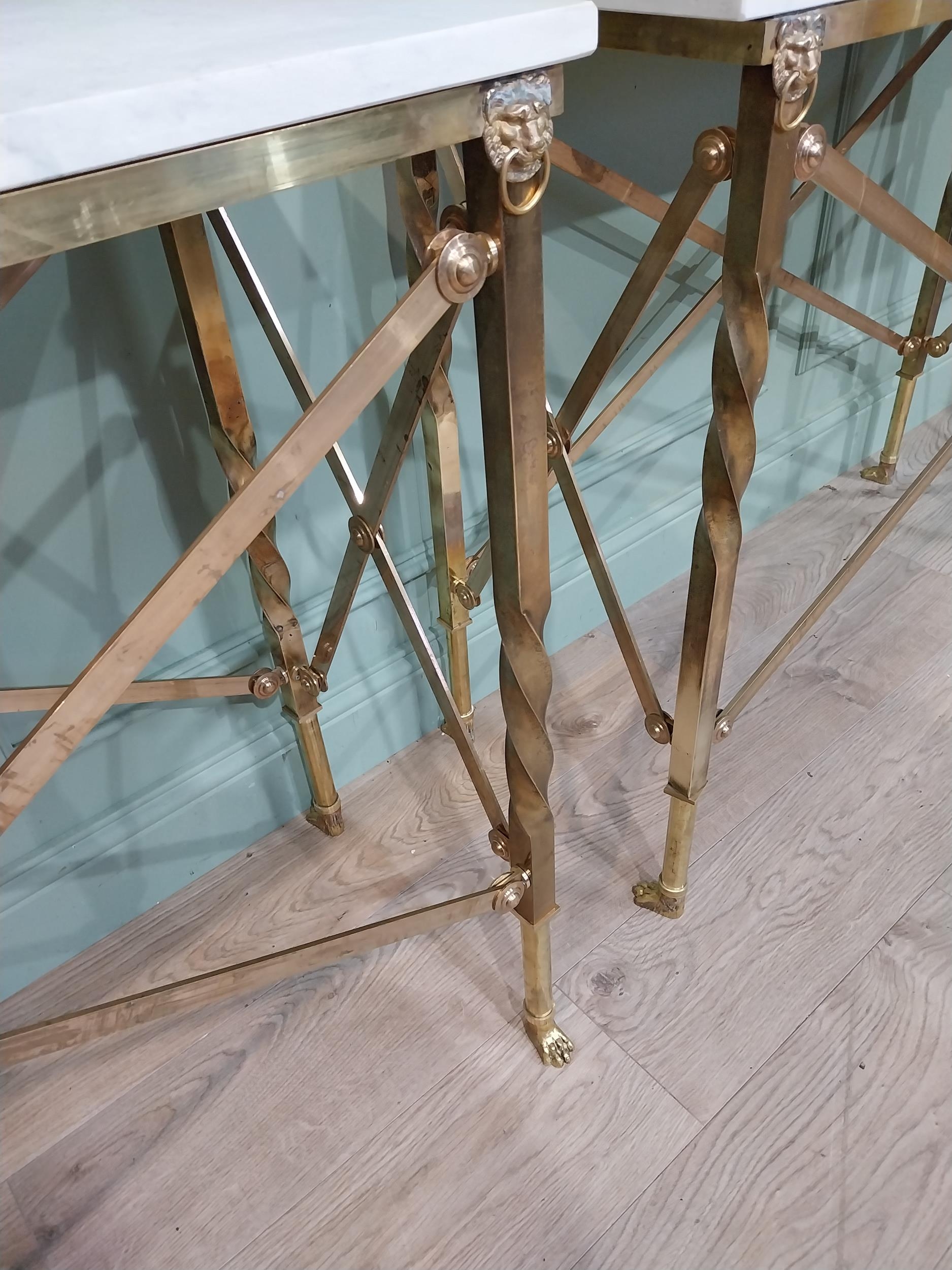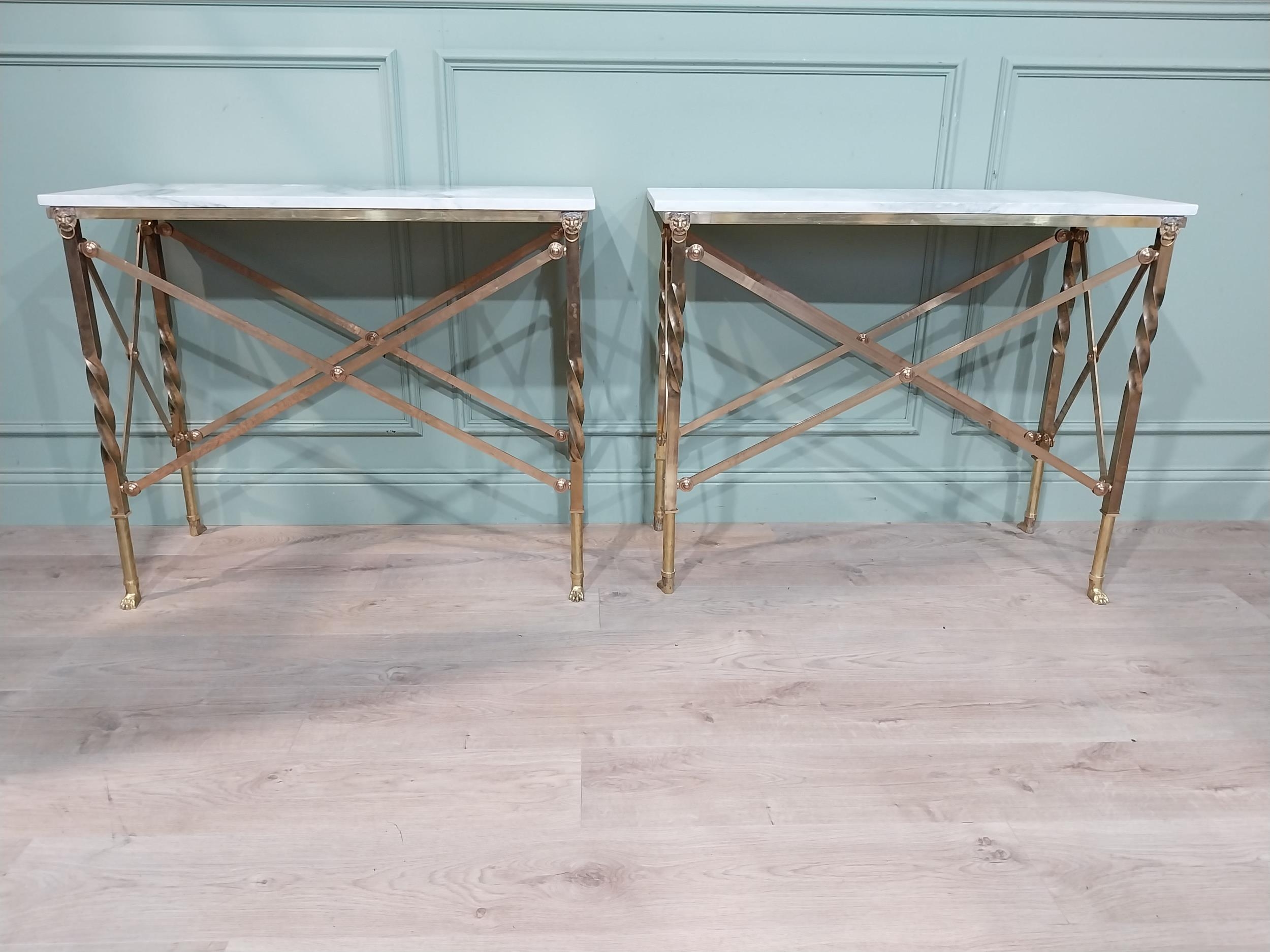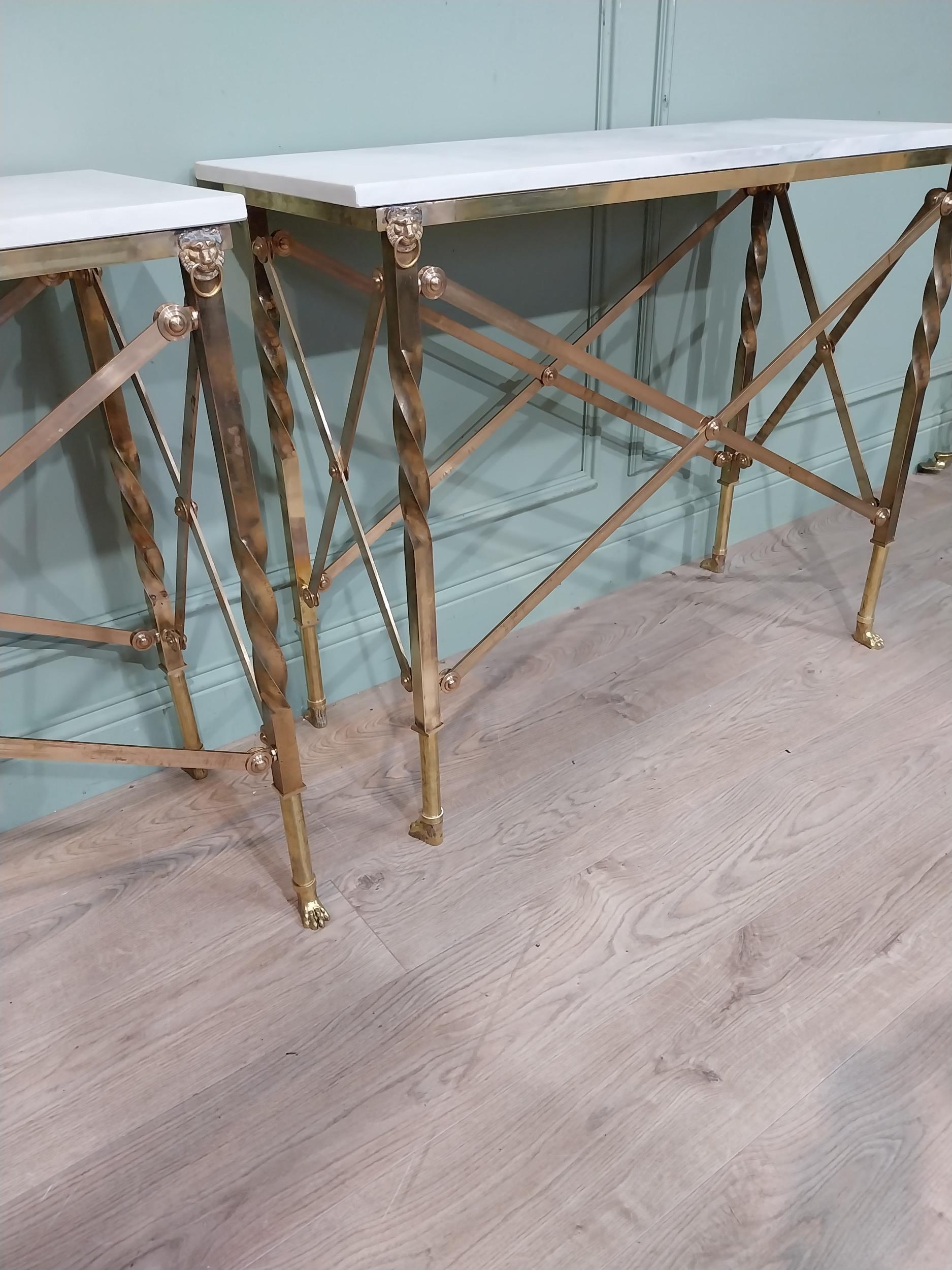 Pair of exceptional quality brass marble topped Console tables in the Empire style decorated with Lion's masks and Lion's paw feet. {82 cm H x 100 cm W x 41 cm D}.