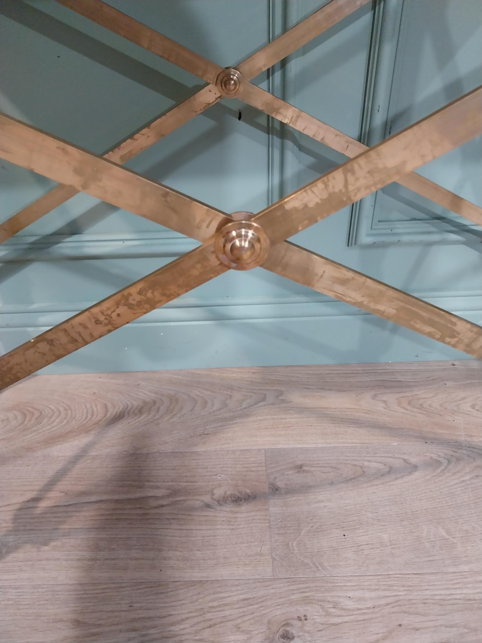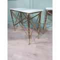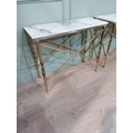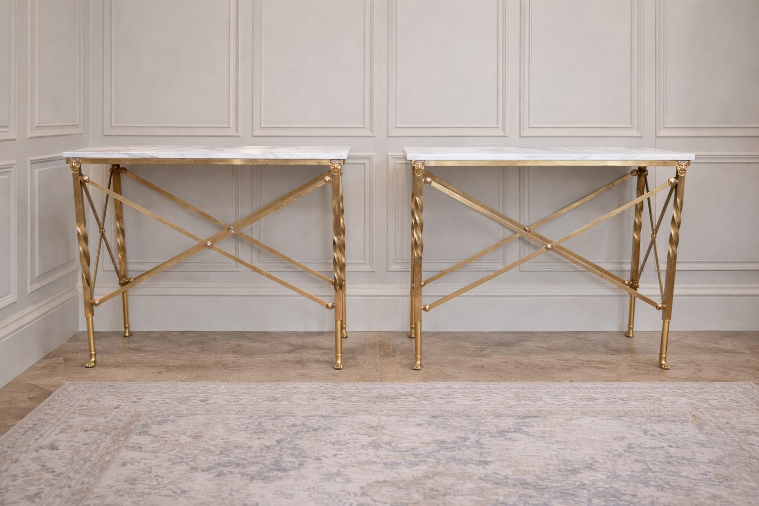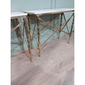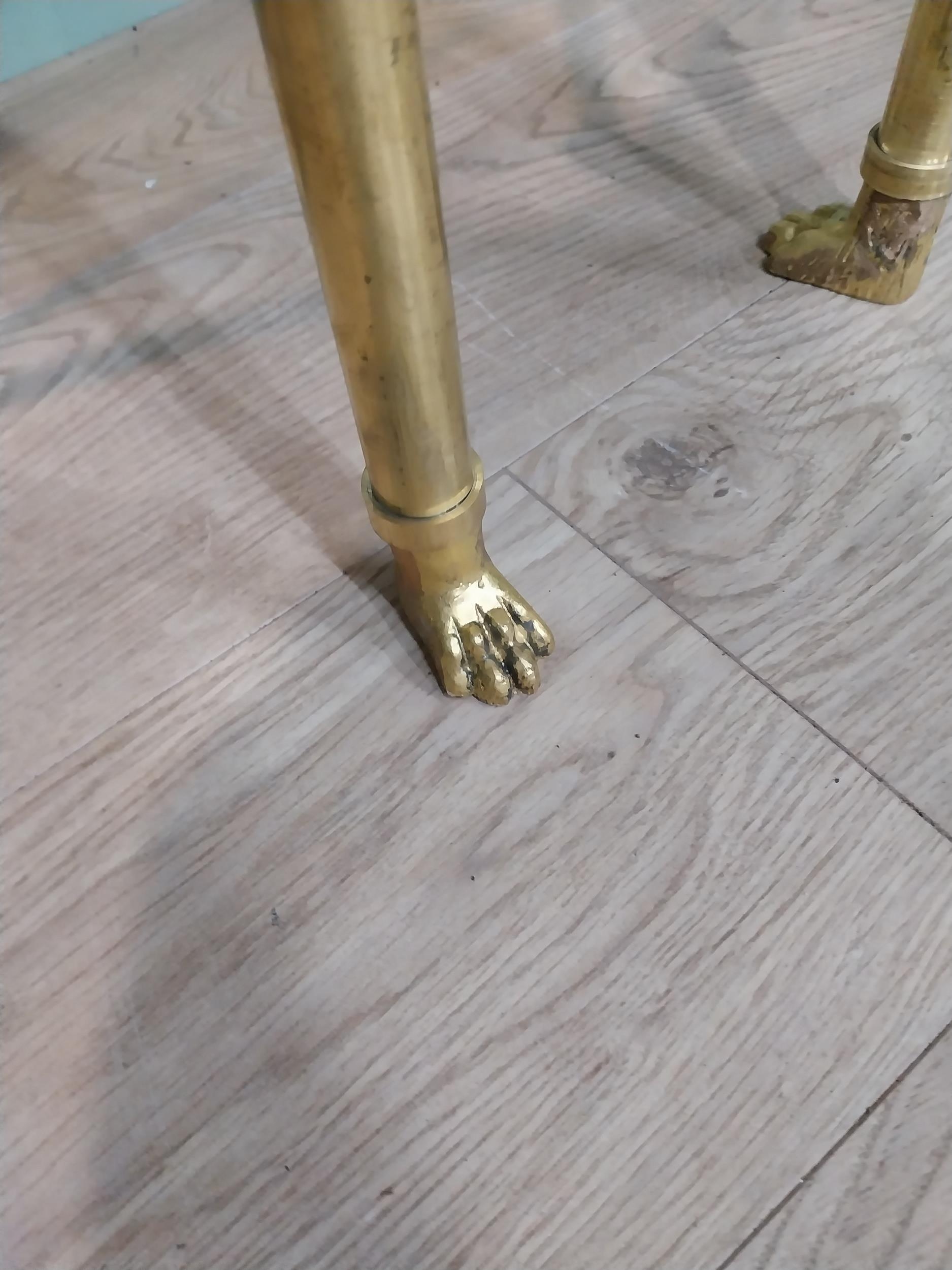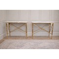 Pair of exceptional quality brass marble topped Console tables in the Empire style decorated with Lion's masks and Lion's paw feet. {82 cm H x 100 cm W x 41 cm D}.
