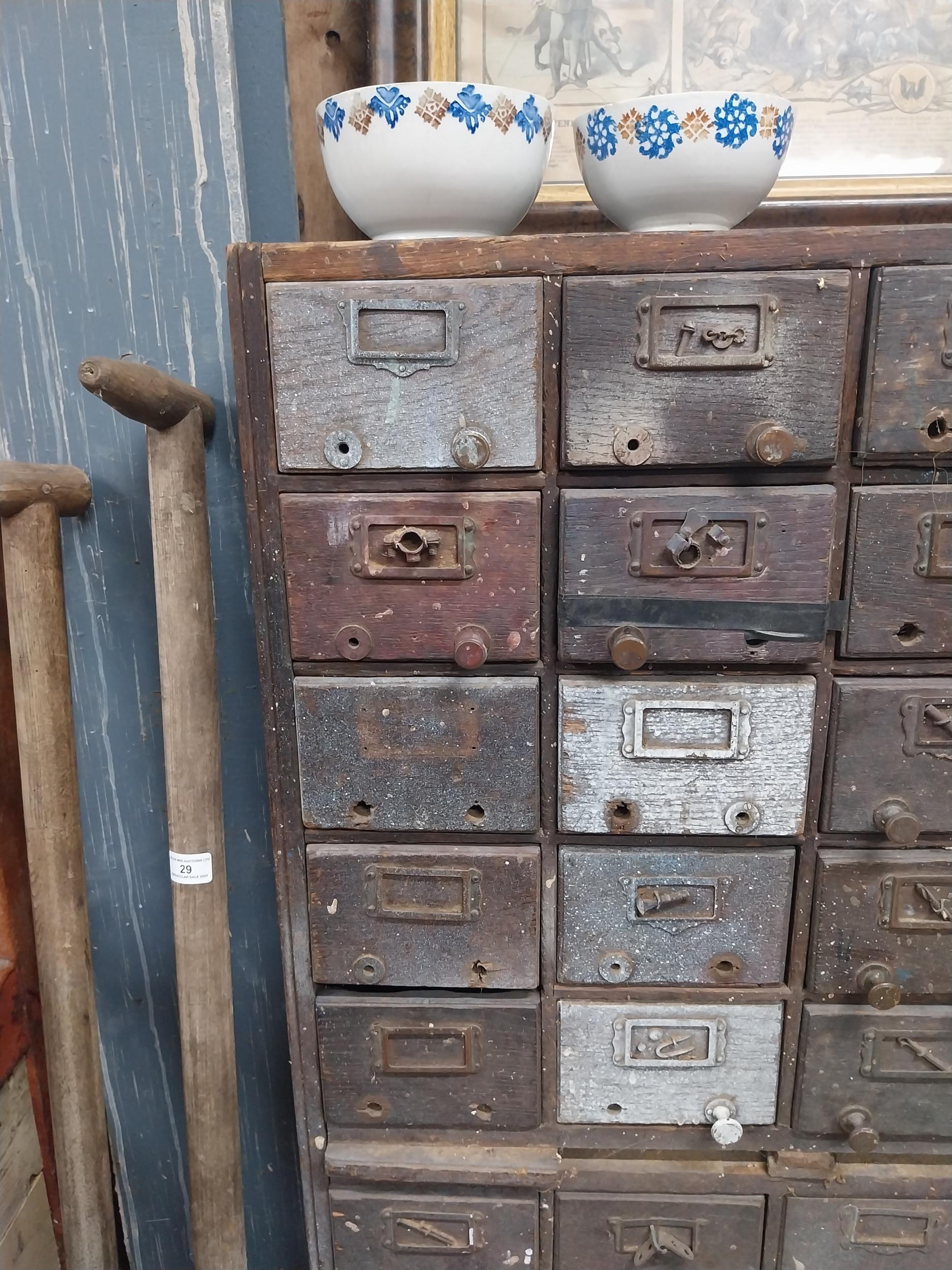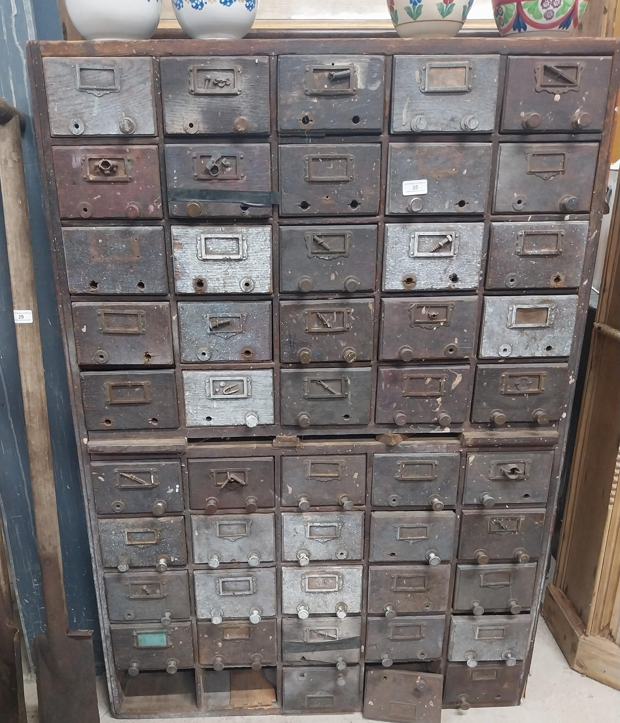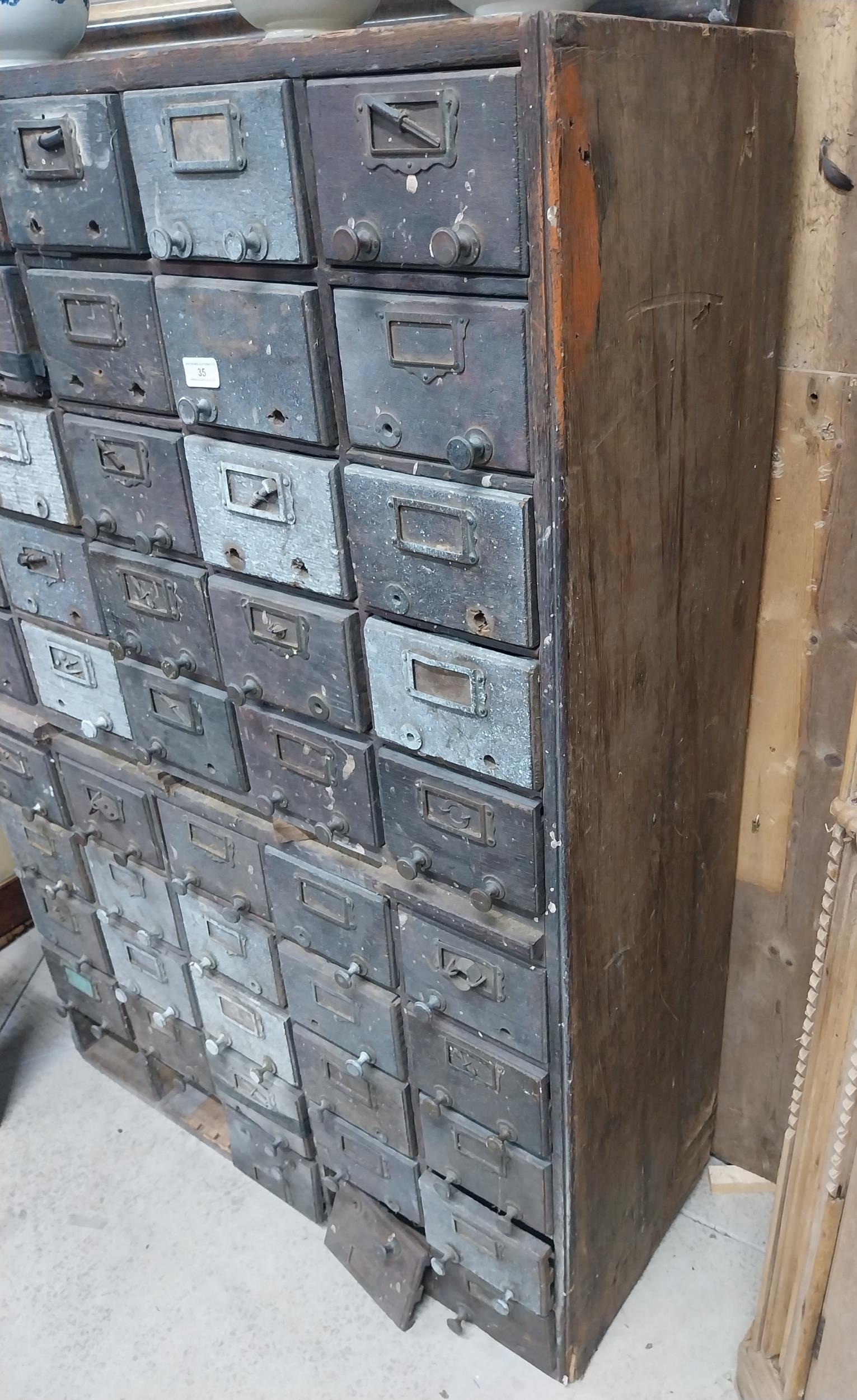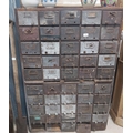 20th C. oak bank of fifty drawers (two missing). {130 cm H x 90 cm W x 35 cm D}.