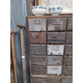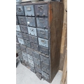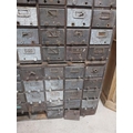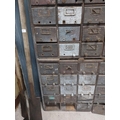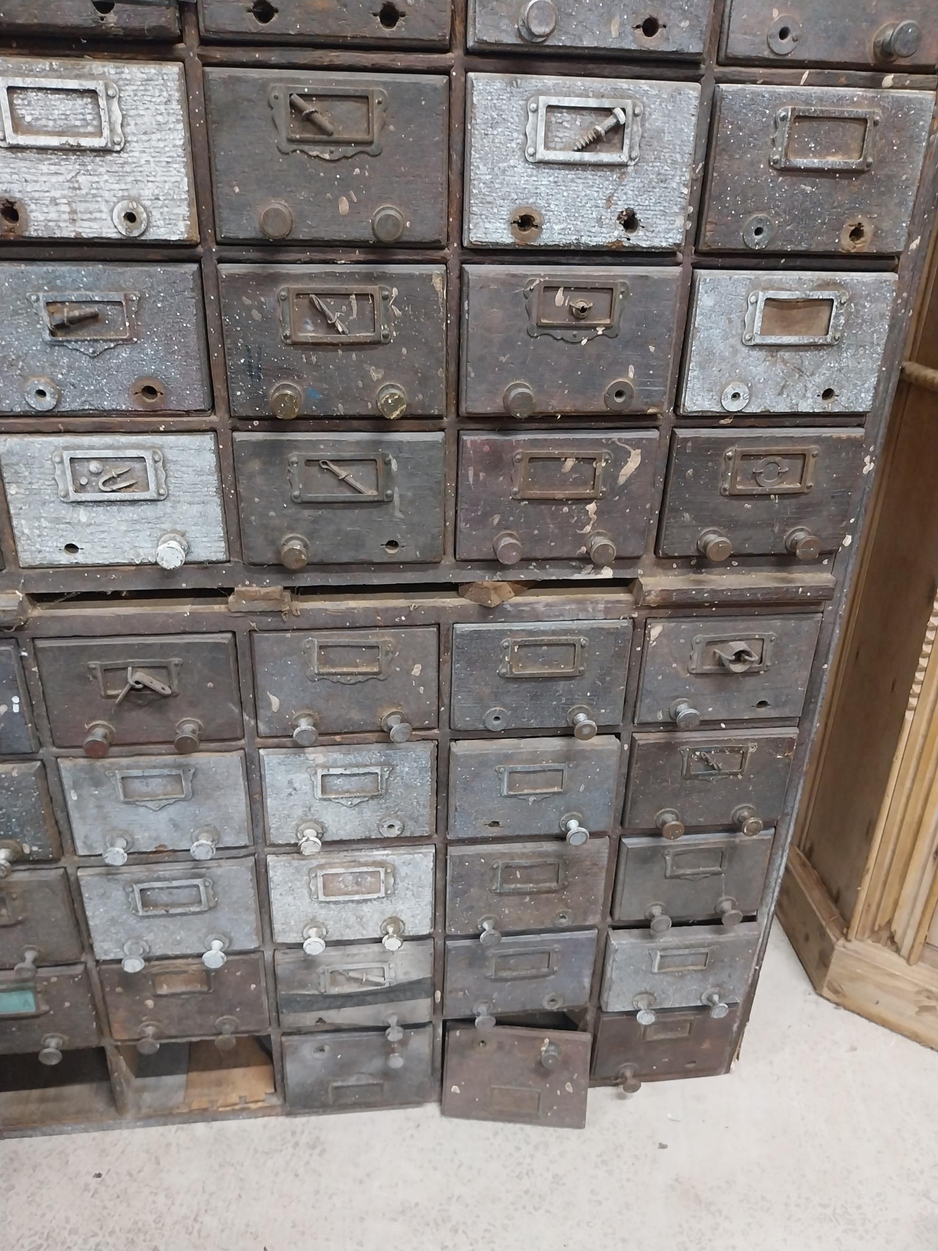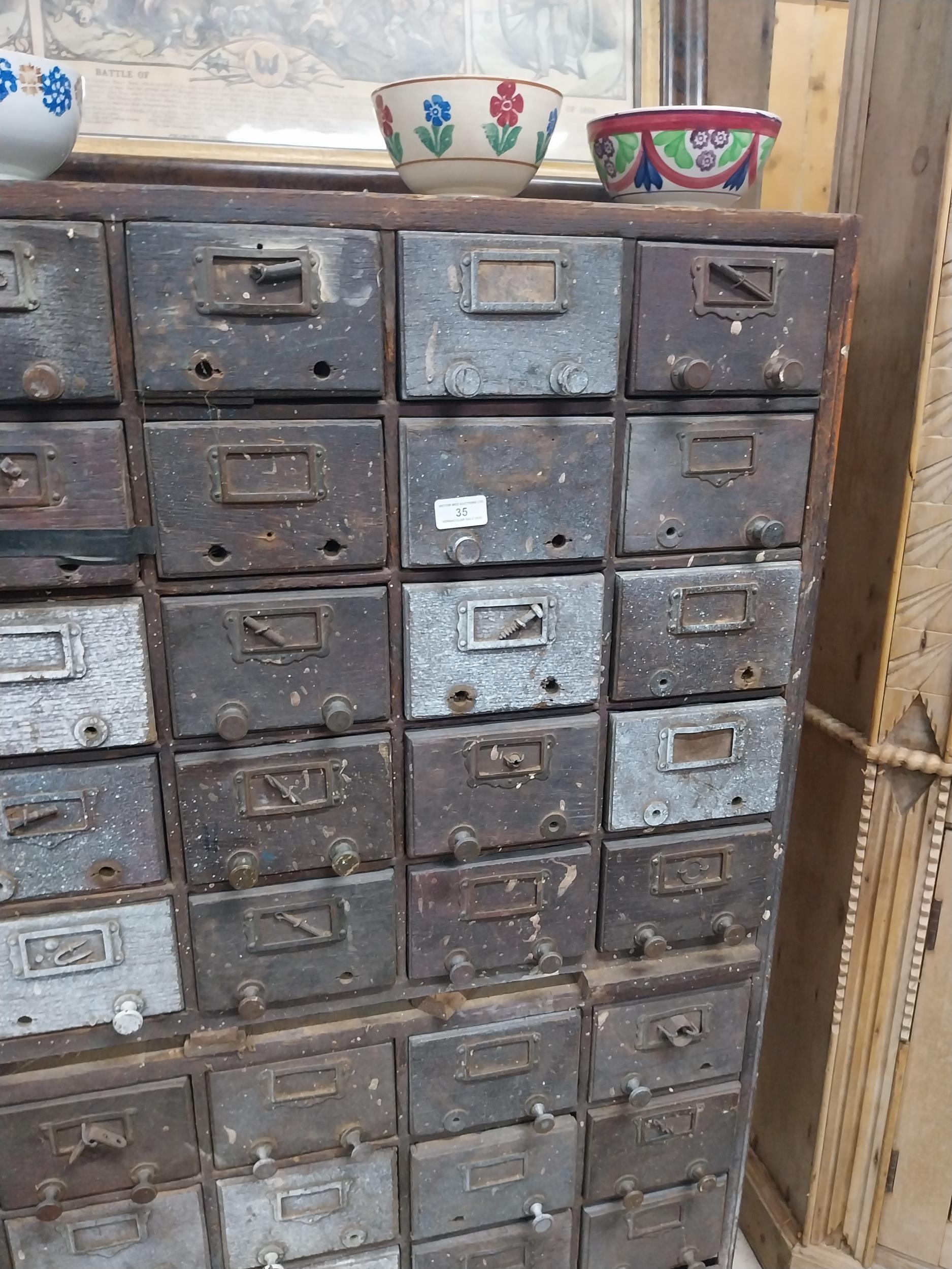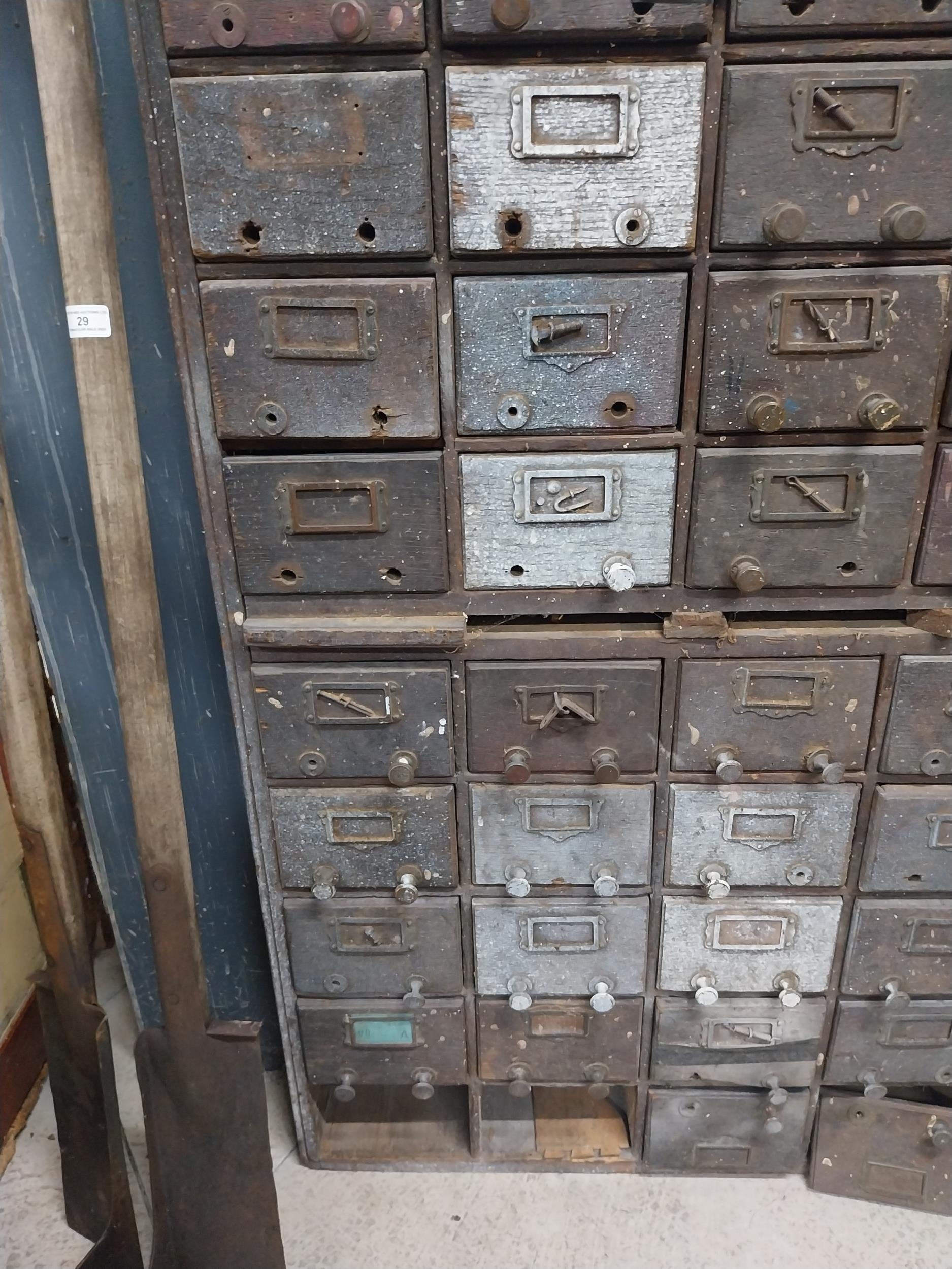 20th C. oak bank of fifty drawers (two missing). {130 cm H x 90 cm W x 35 cm D}.